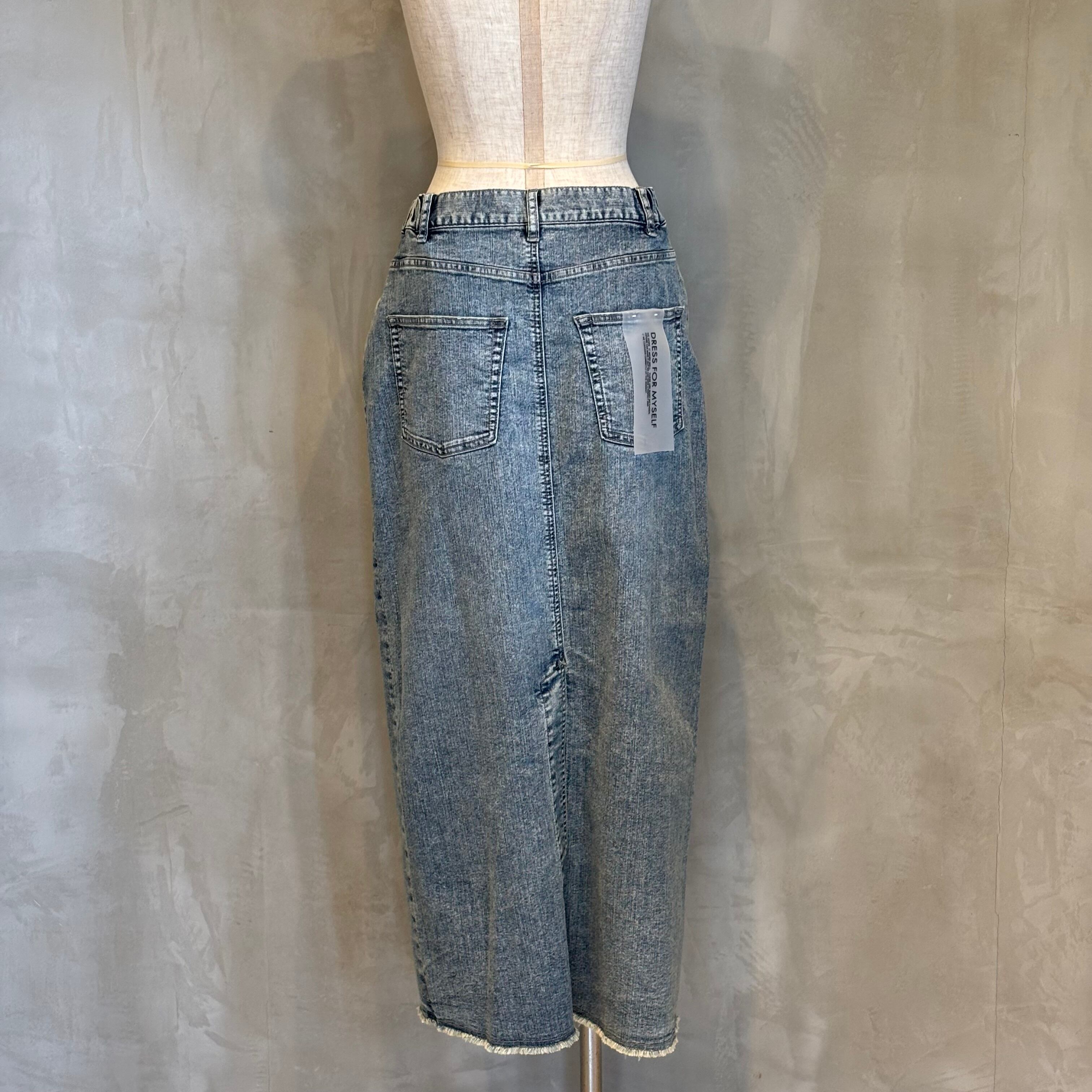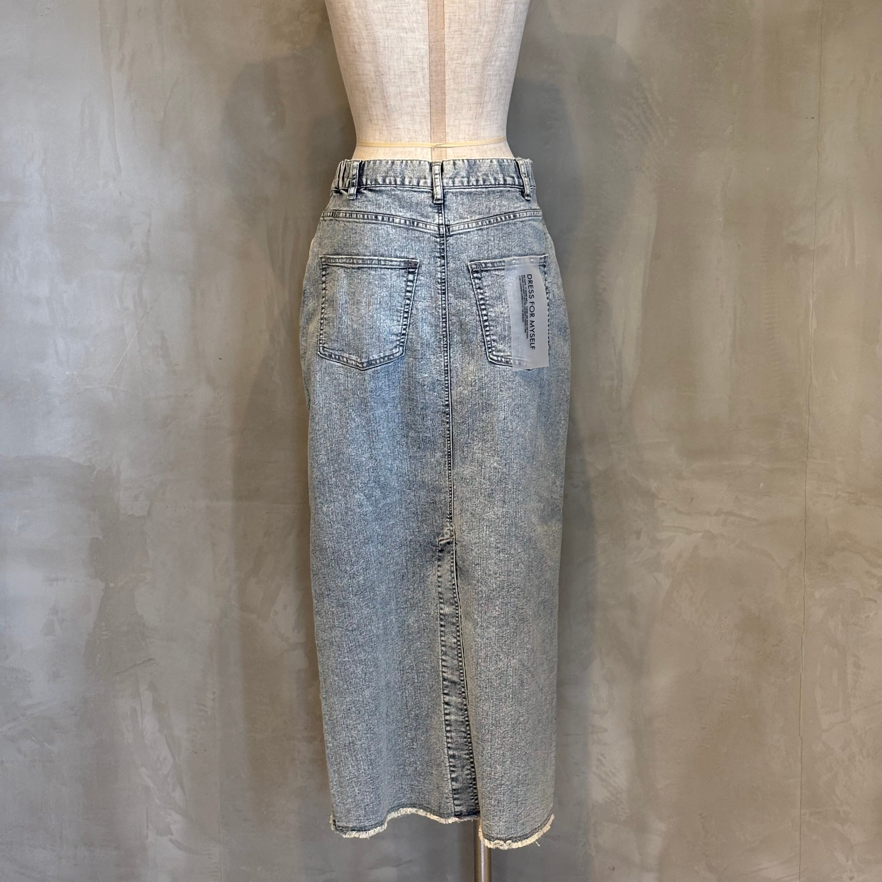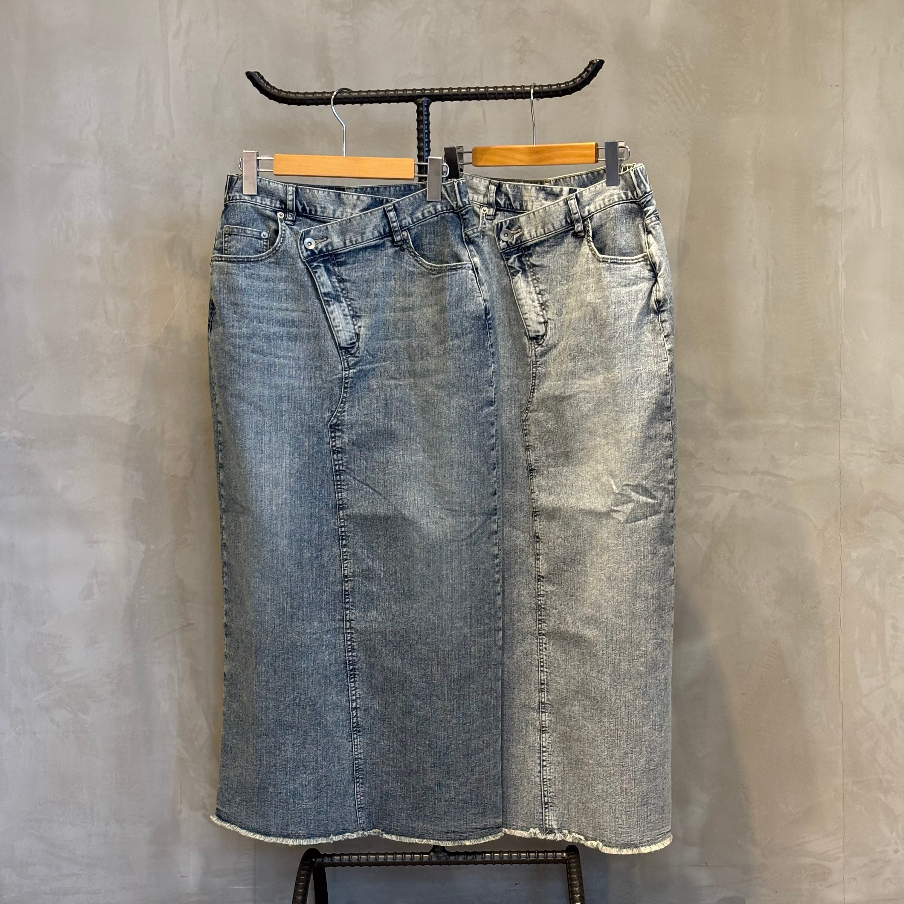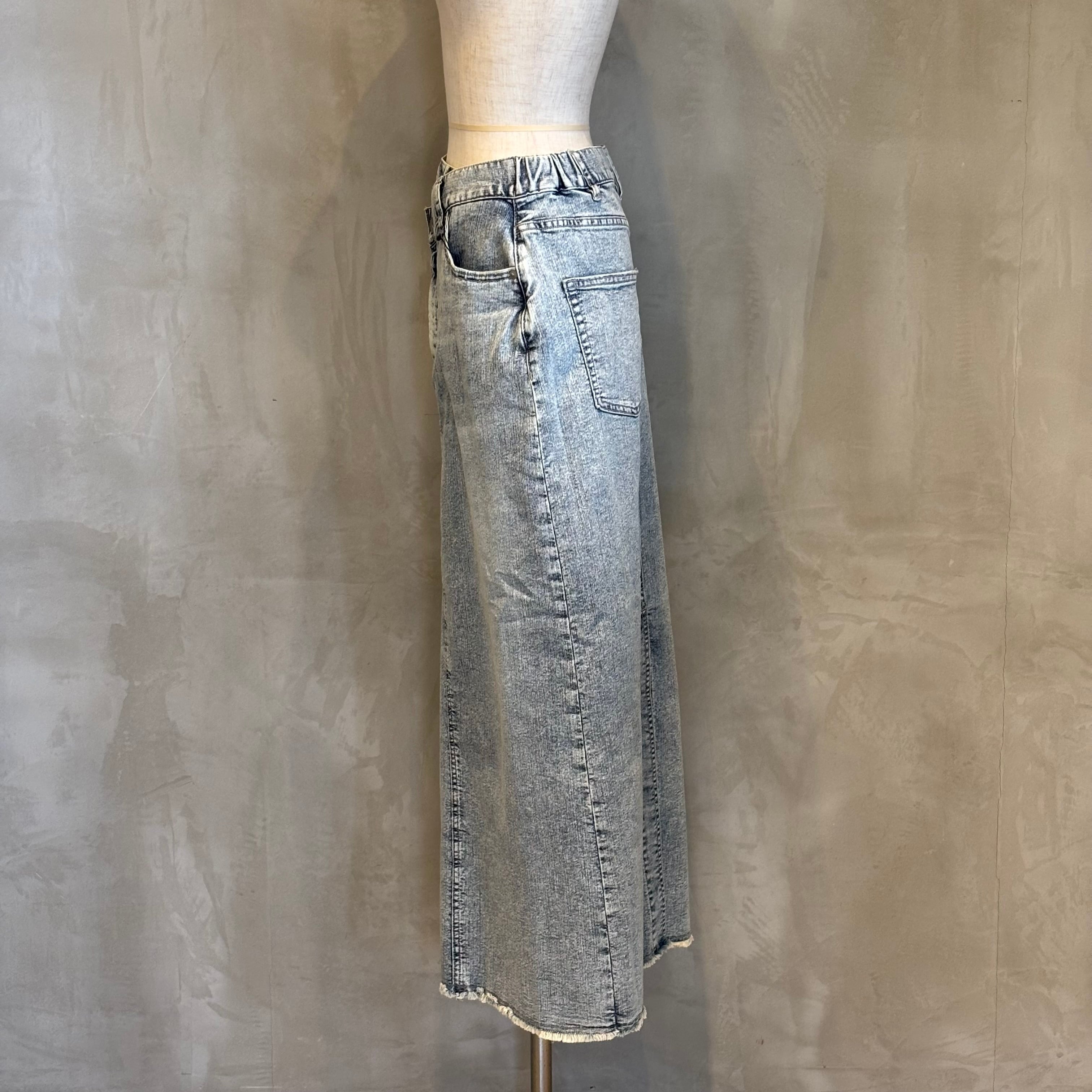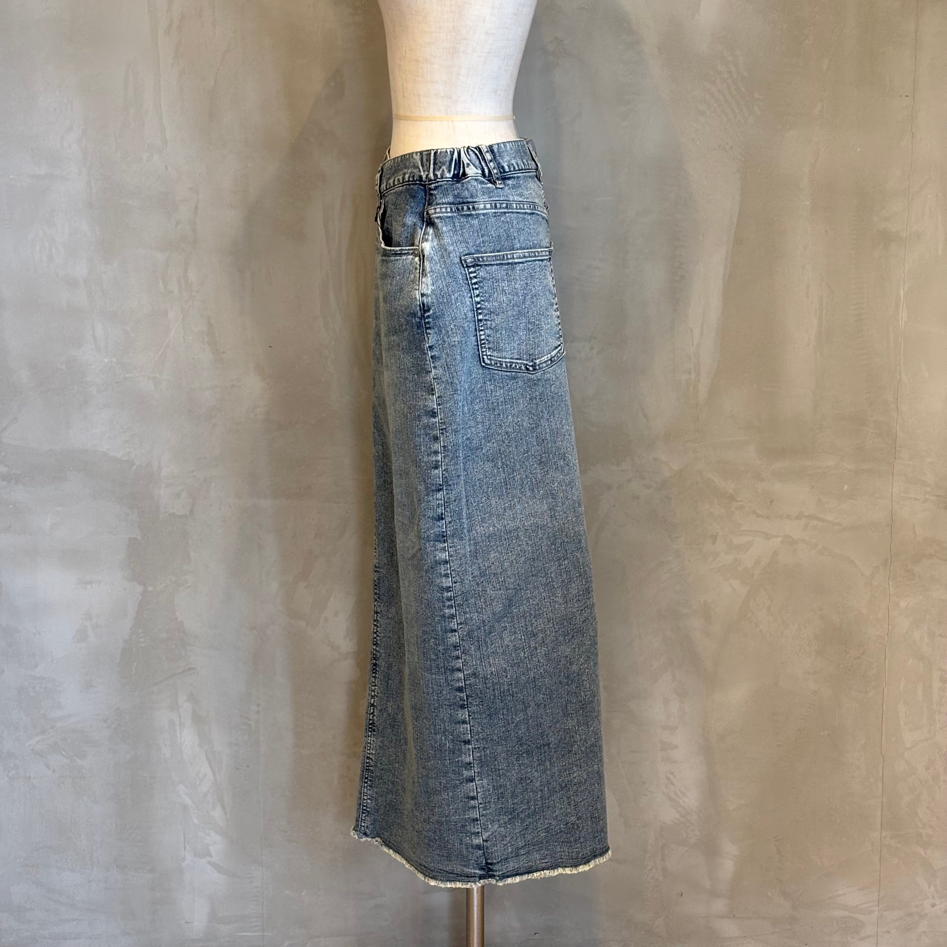 フロントは、少し前下がりに着るとすっきり着こなせます。リメイク風のデザインが、何気ないコーデも今っぽく仕上げてくれます。ストレッチデニムなので、足さばきもよくIラインを楽しめます。裾は断ち切り仕様になっており、USED感が楽しめます。カラーもオーバーダイ加工で、味のある色味に仕上げました。