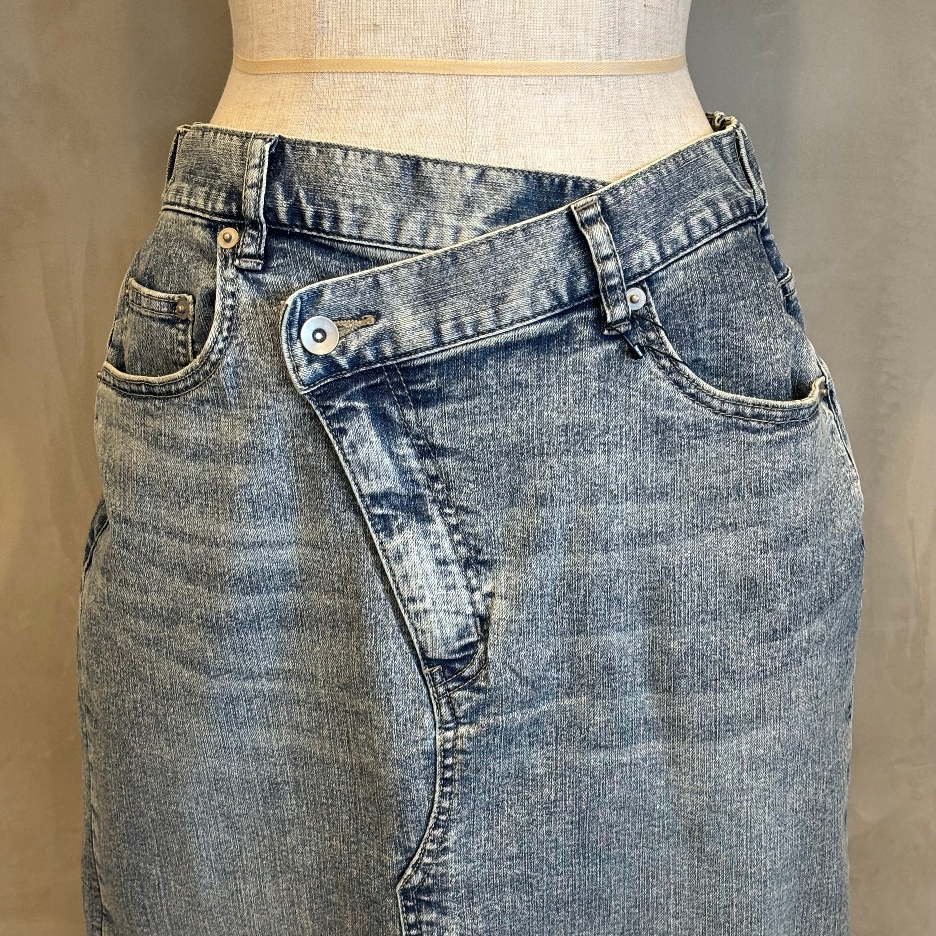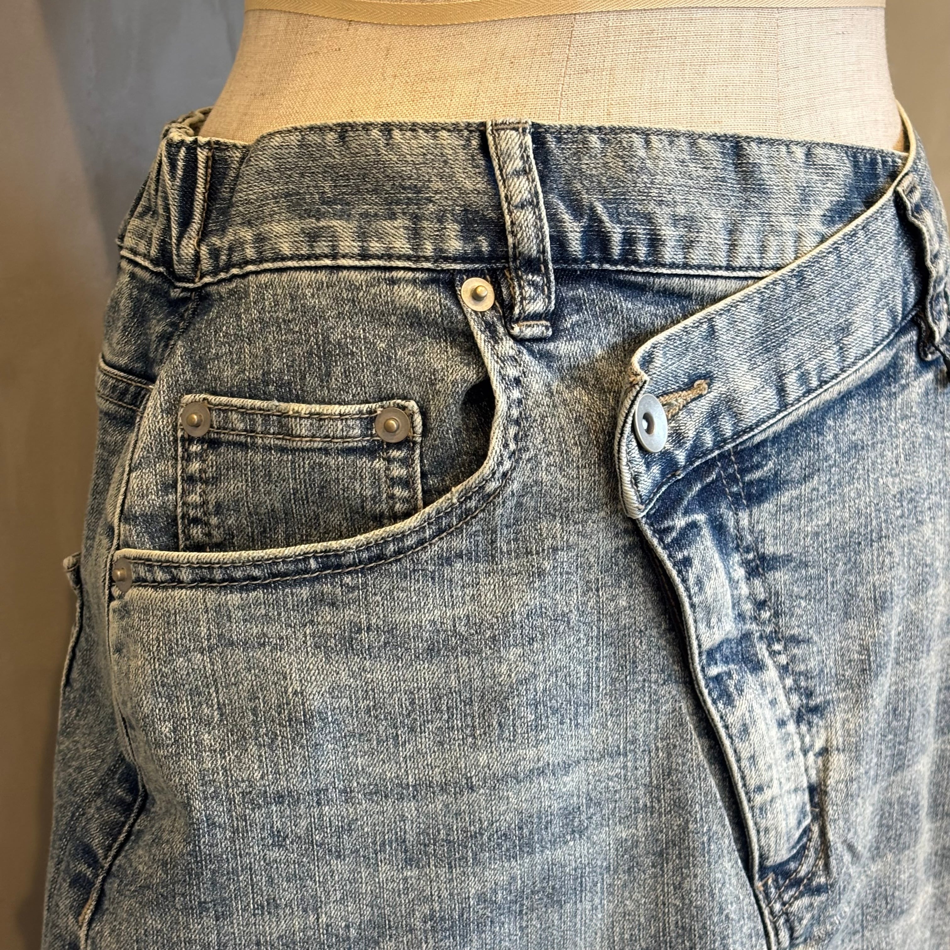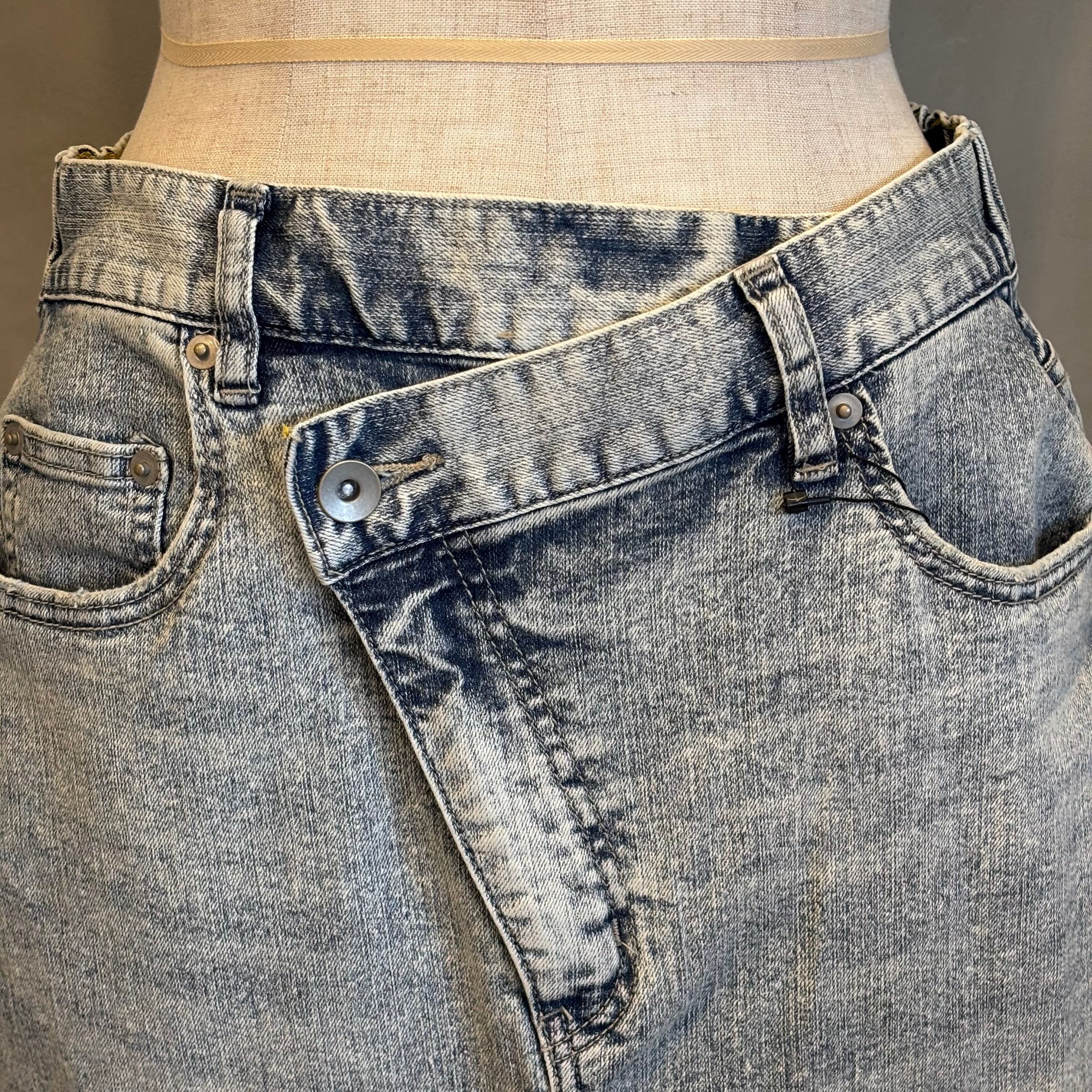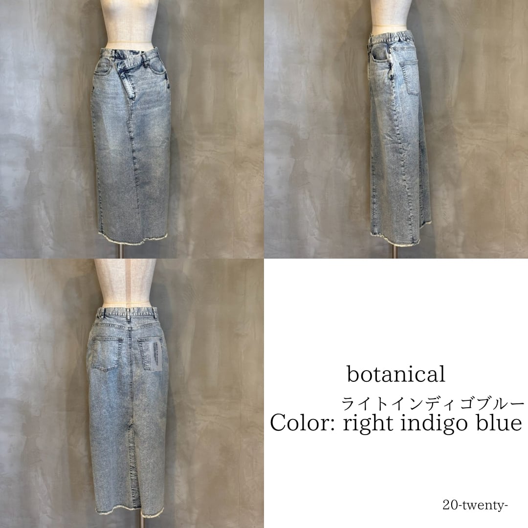 フロントは、少し前下がりに着るとすっきり着こなせます。リメイク風のデザインが、何気ないコーデも今っぽく仕上げてくれます。ストレッチデニムなので、足さばきもよくIラインを楽しめます。裾は断ち切り仕様になっており、USED感が楽しめます。カラーもオーバーダイ加工で、味のある色味に仕上げました。