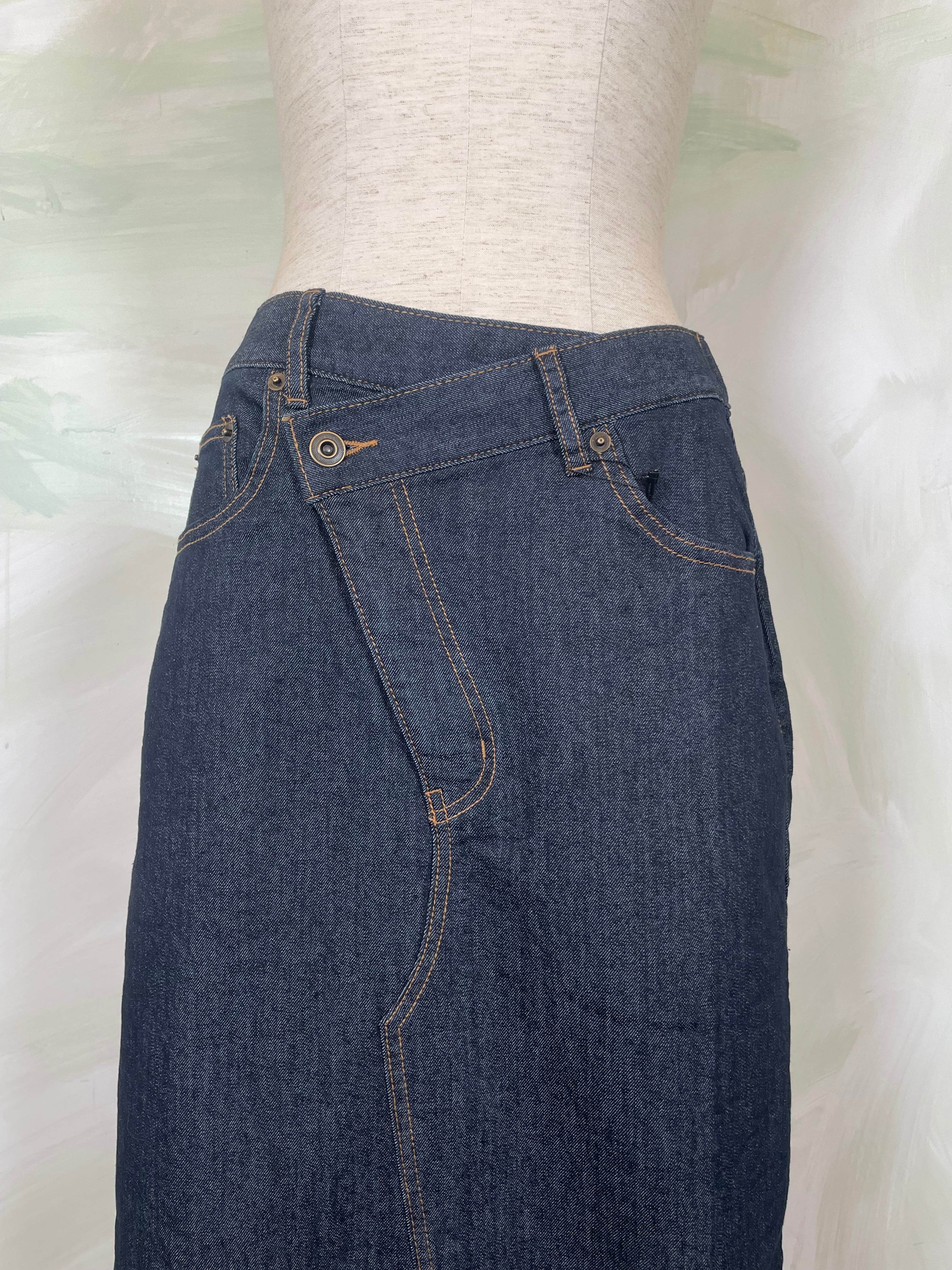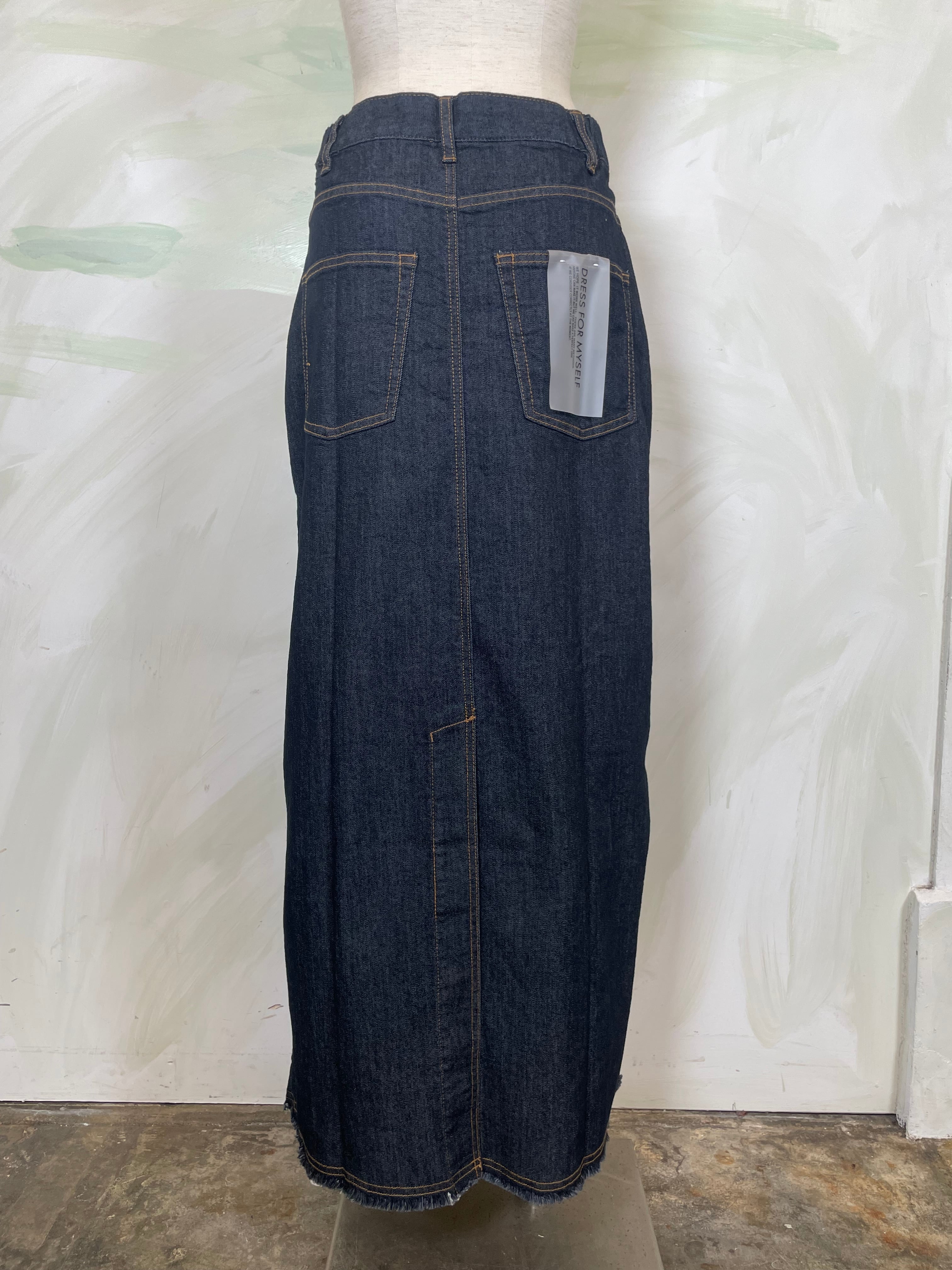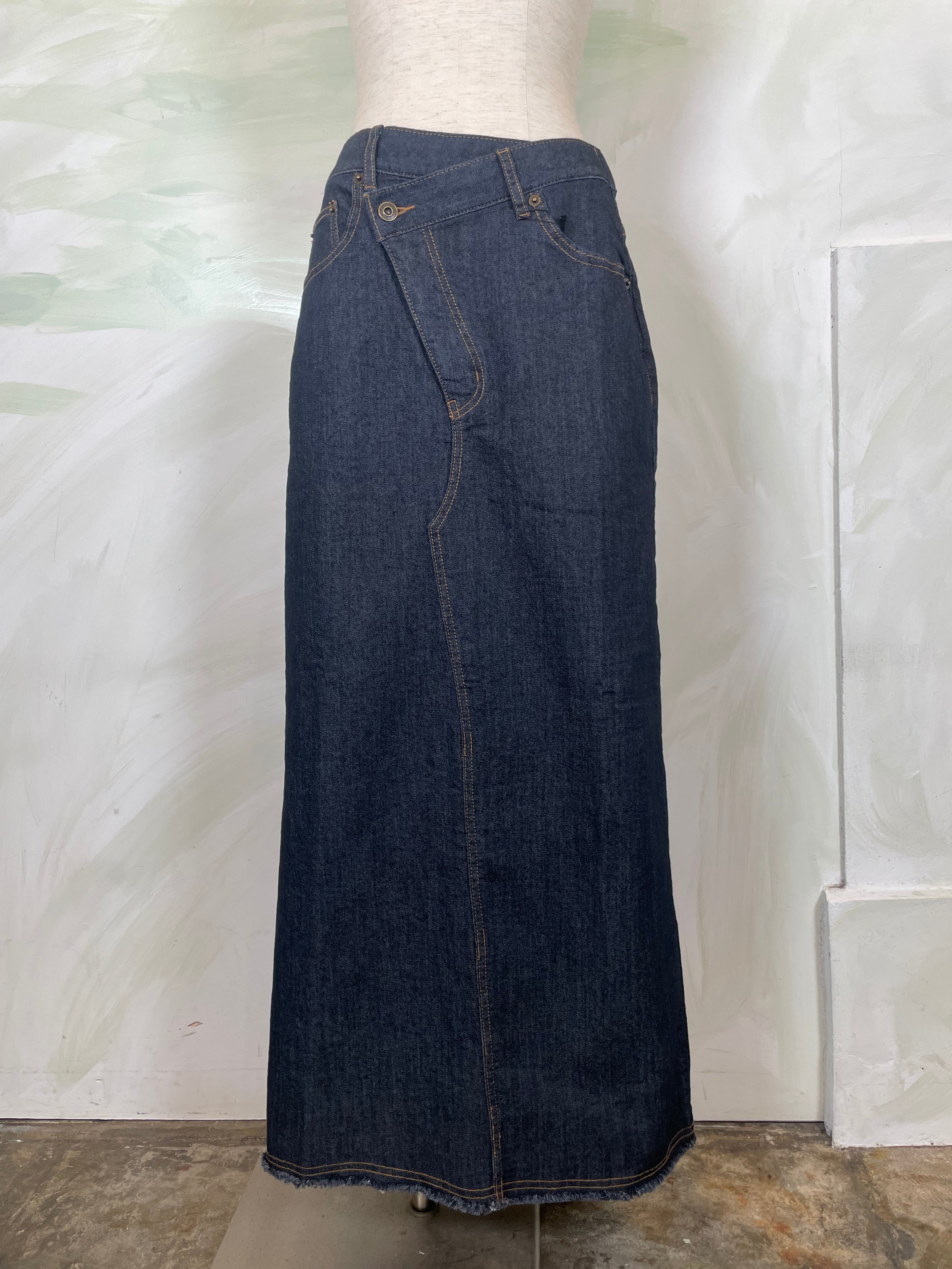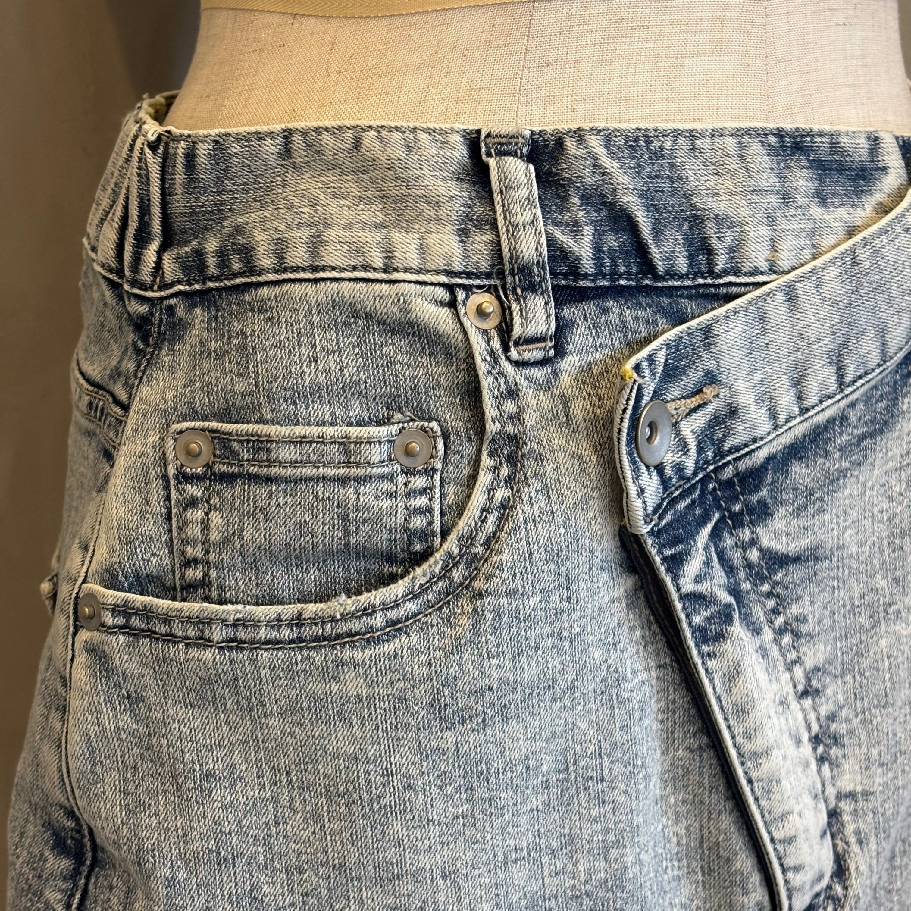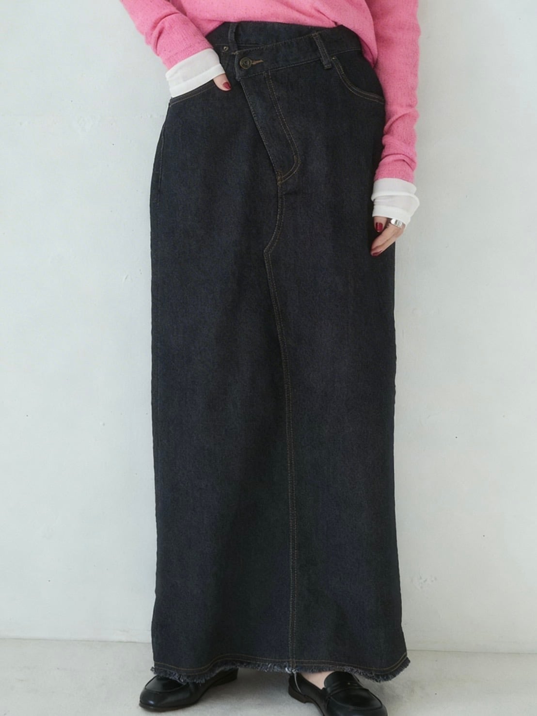 フロントは、少し前下がりに着るとすっきり着こなせます。リメイク風のデザインが、何気ないコーデも今っぽく仕上げてくれます。ストレッチデニムなので、足さばきもよくIラインを楽しめます。裾は断ち切り仕様になっており、USED感が楽しめます。カラーもオーバーダイ加工で、味のある色味に仕上げました。