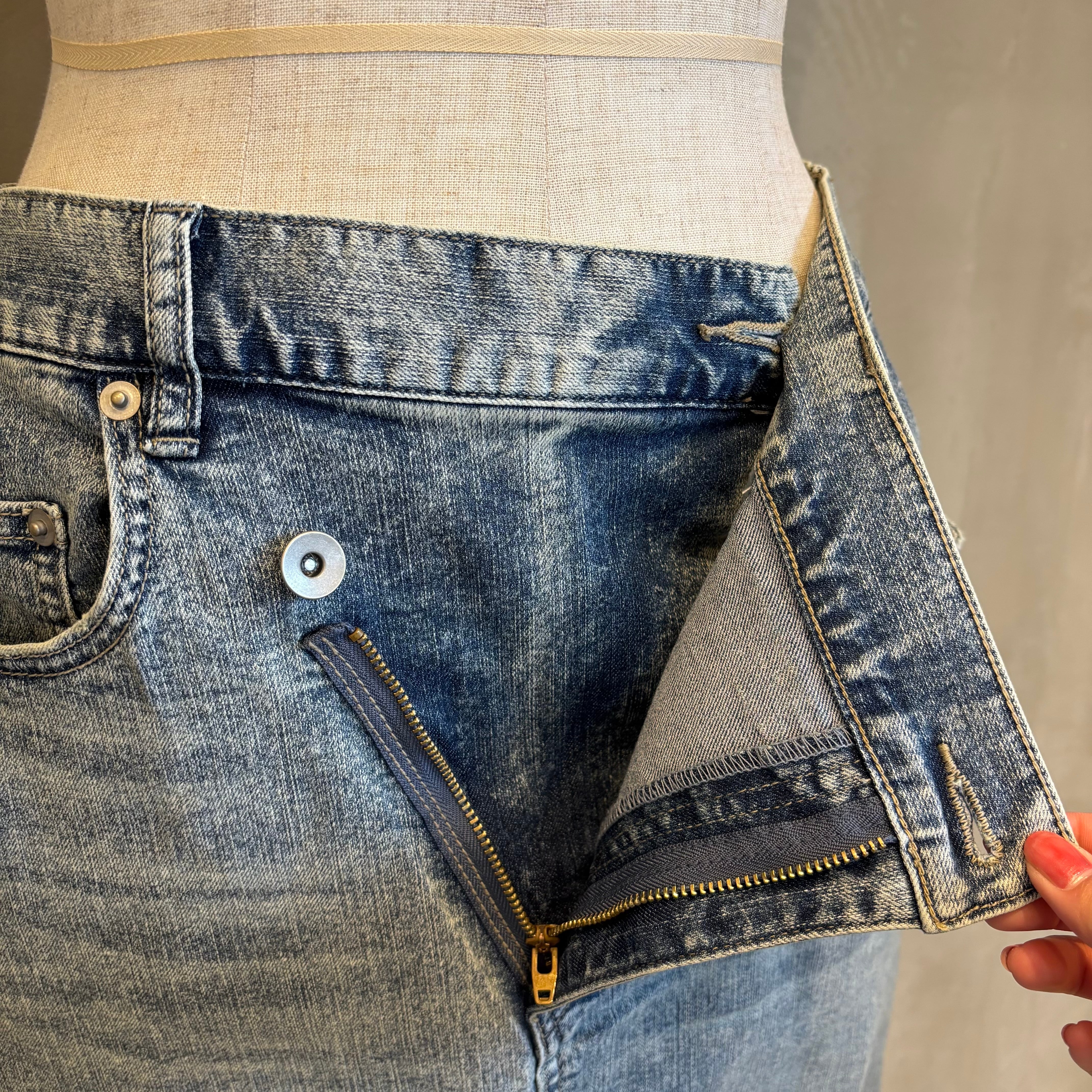 ストレッチ性のあるPU混デニム。10ozで通年使いやすい厚みです。サイドウエストゴム入り。