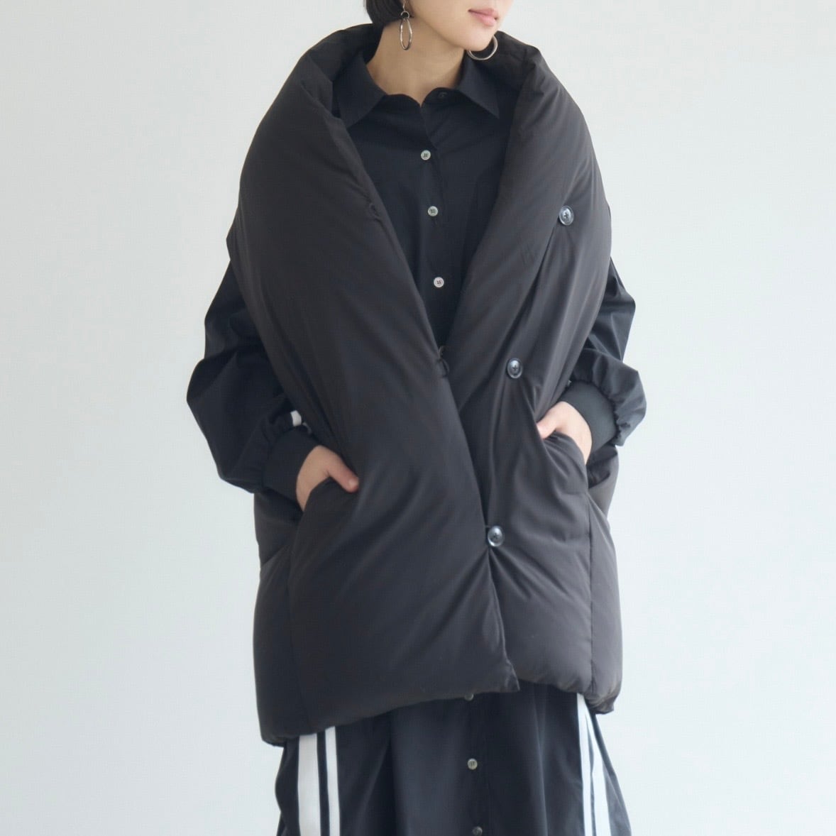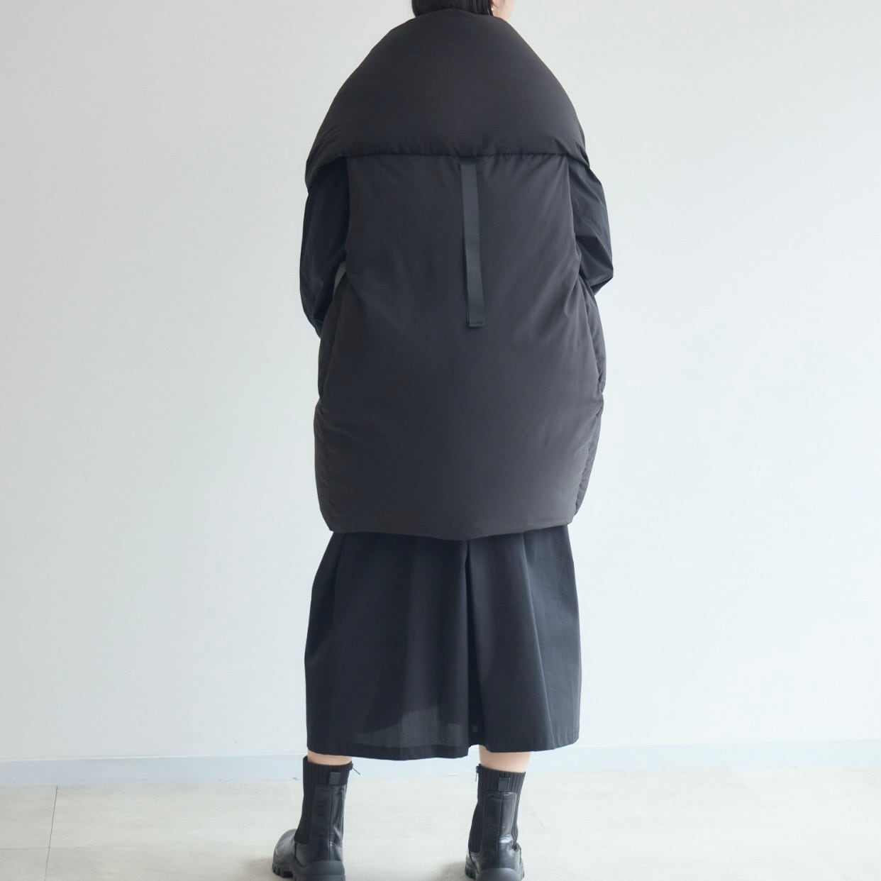まるでボリュームストールを纏ったかのようなユニークなシルエットが魅力のダウンベスト。