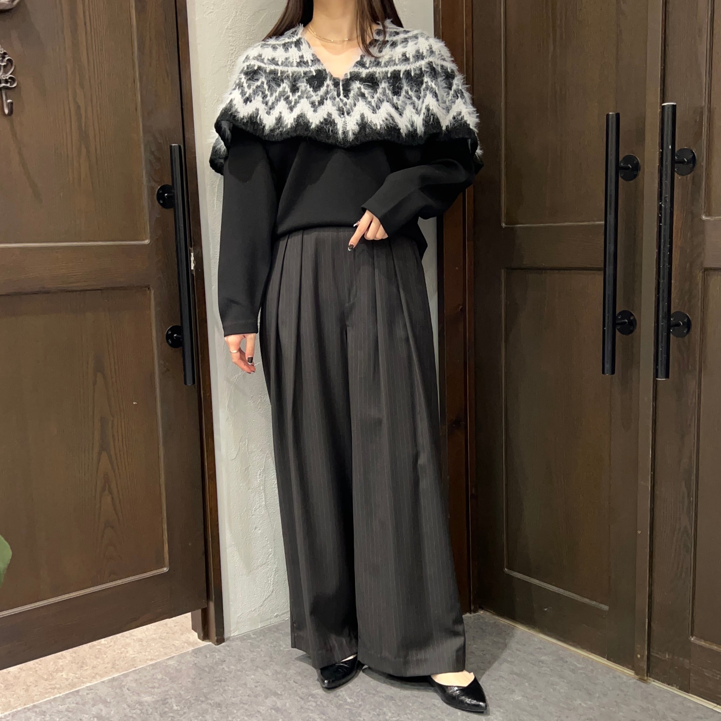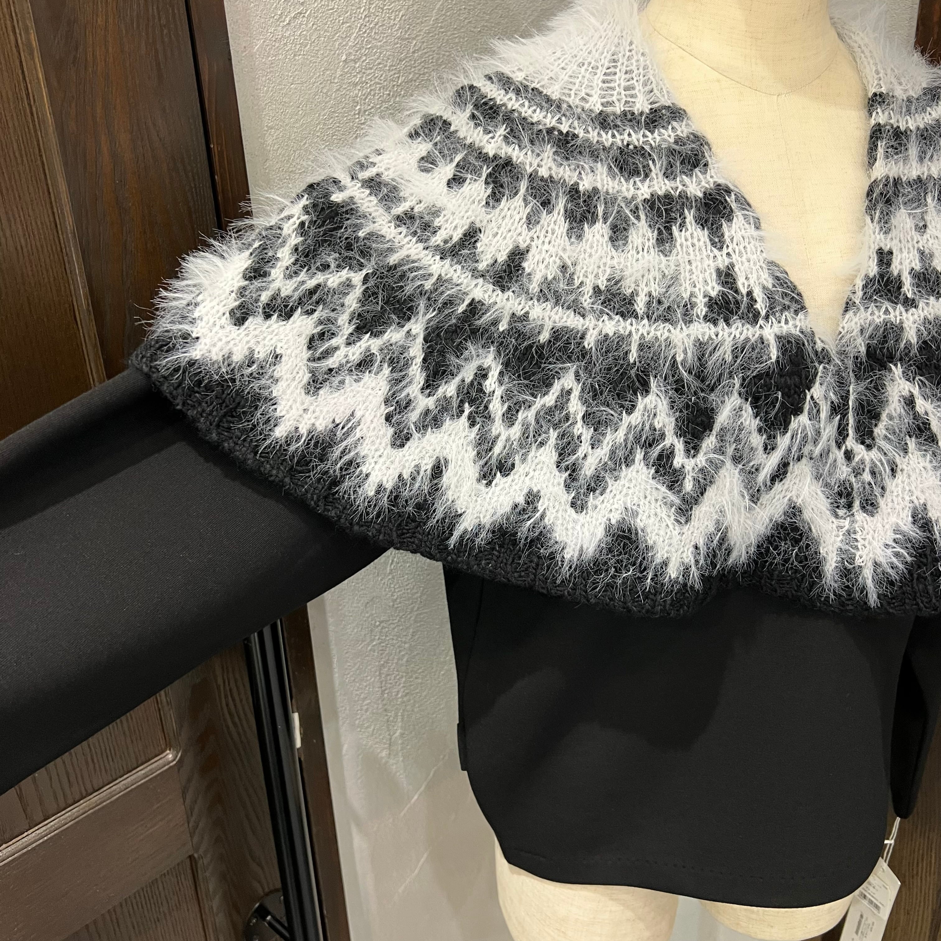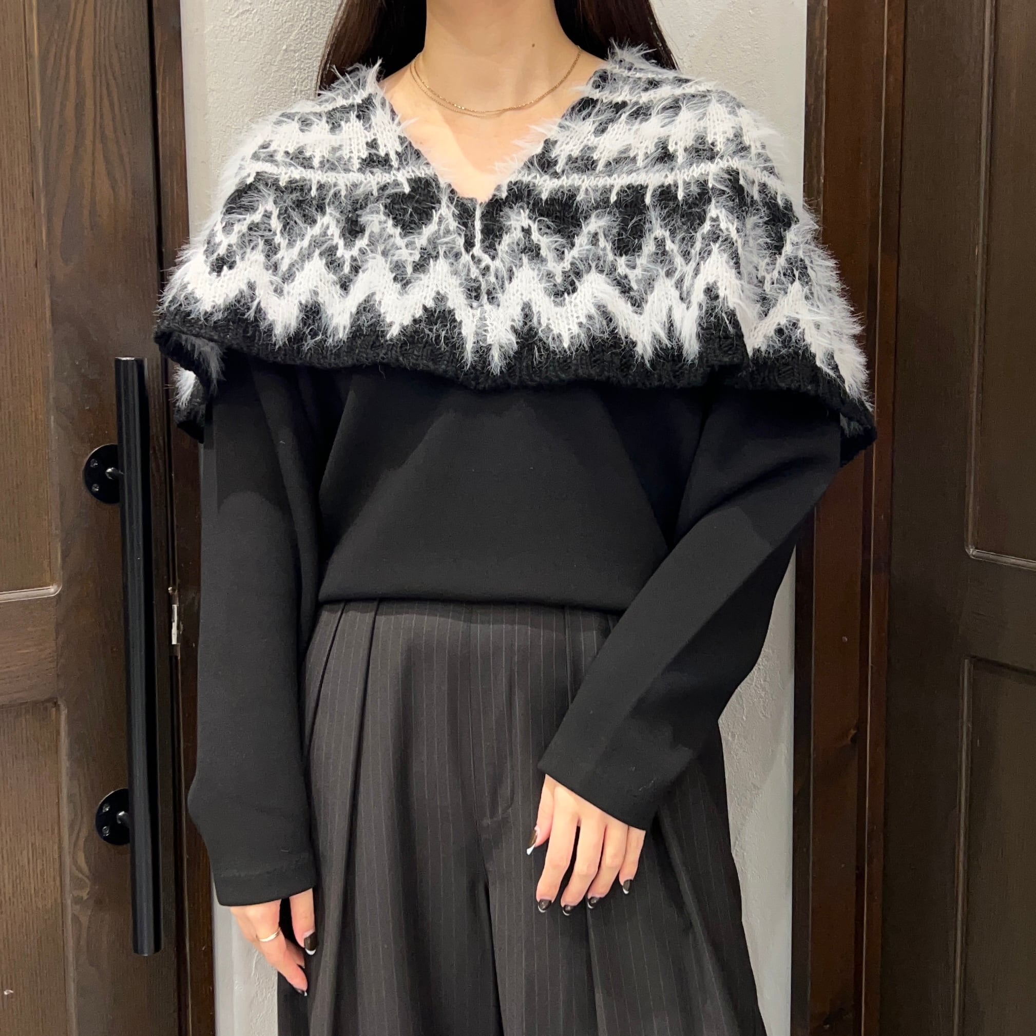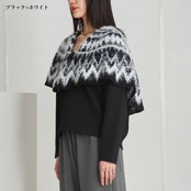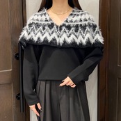 肩まわりから胸元にかけて毛足のある糸で編まれたノルディック風の柄が施され、季節感のあるあたたかみのある印象に。