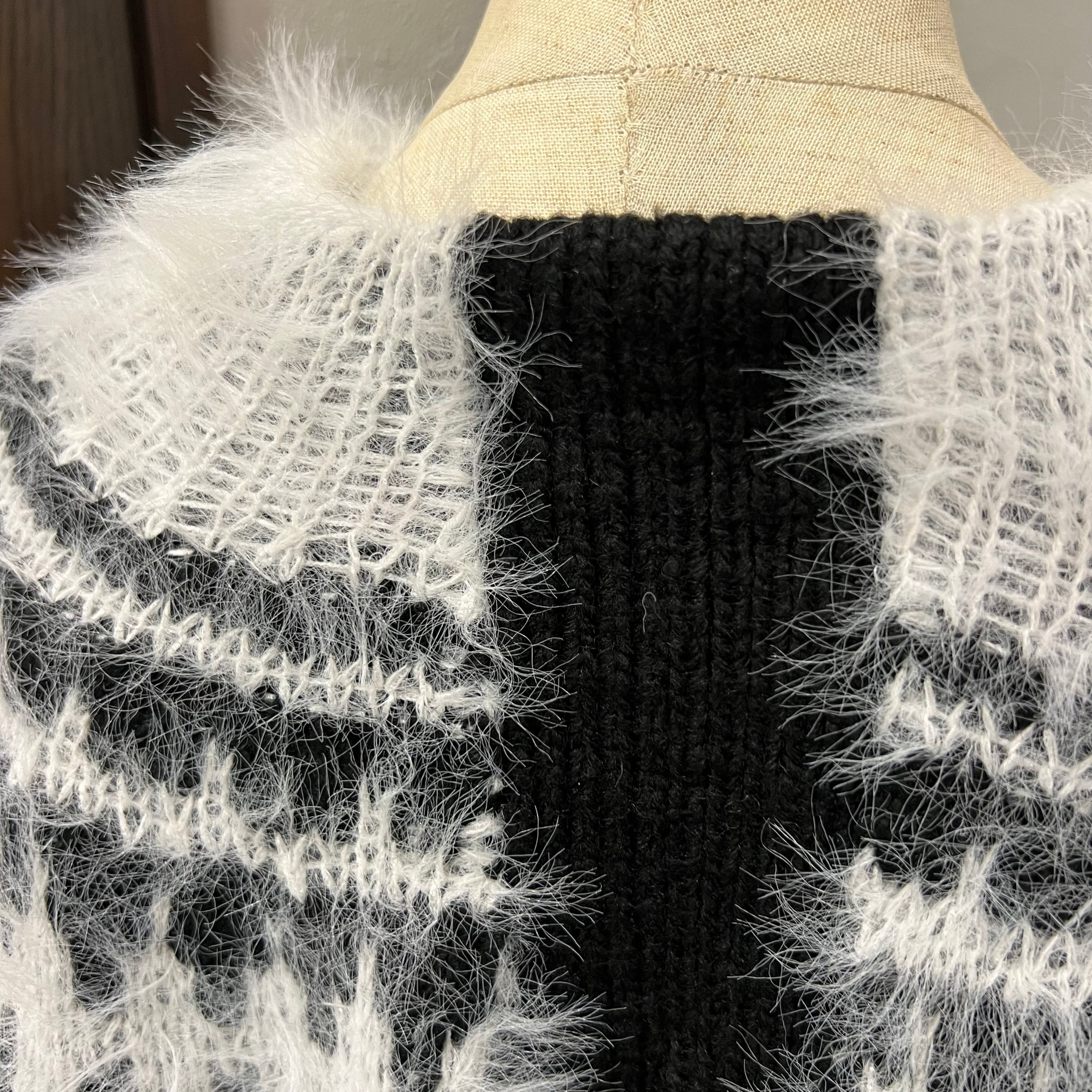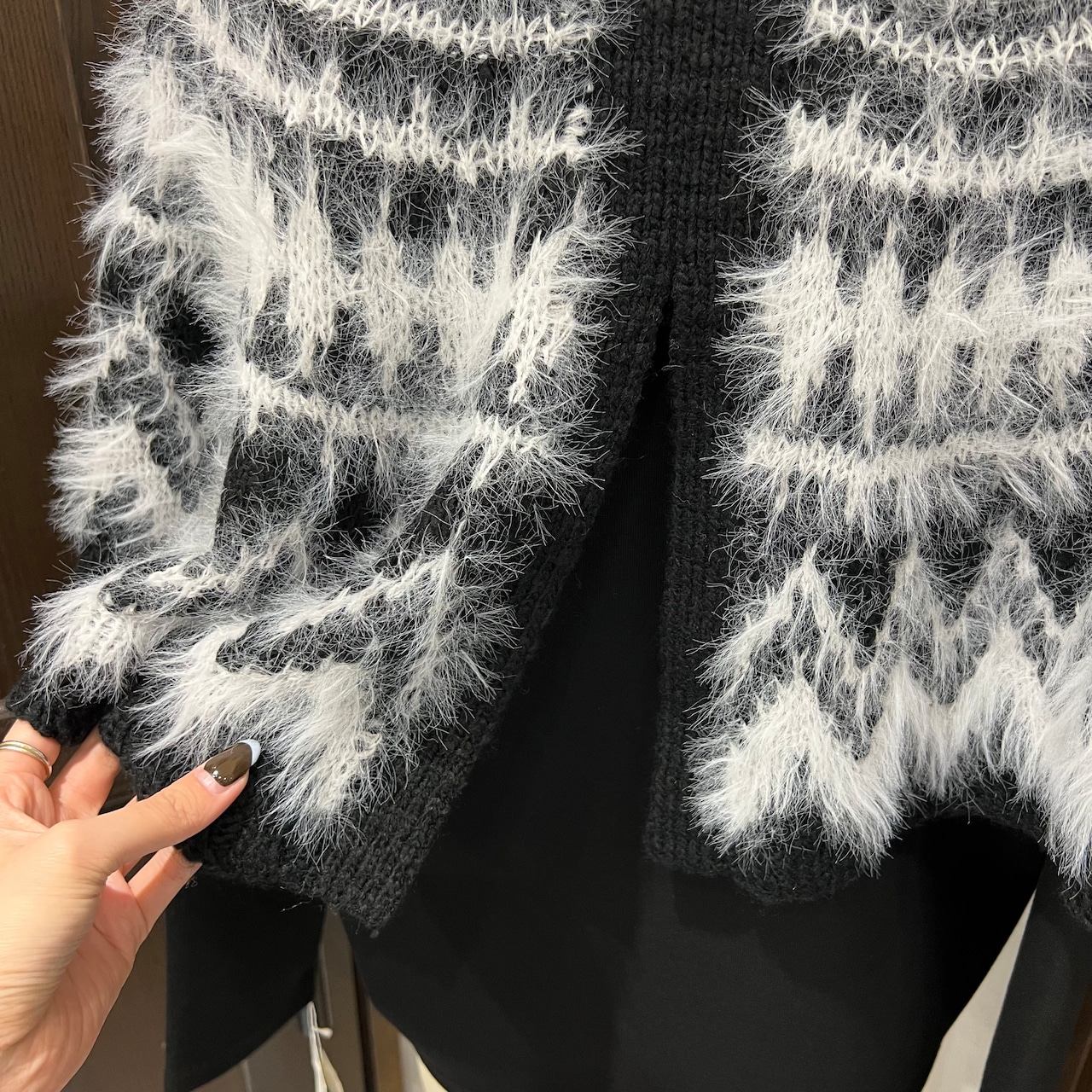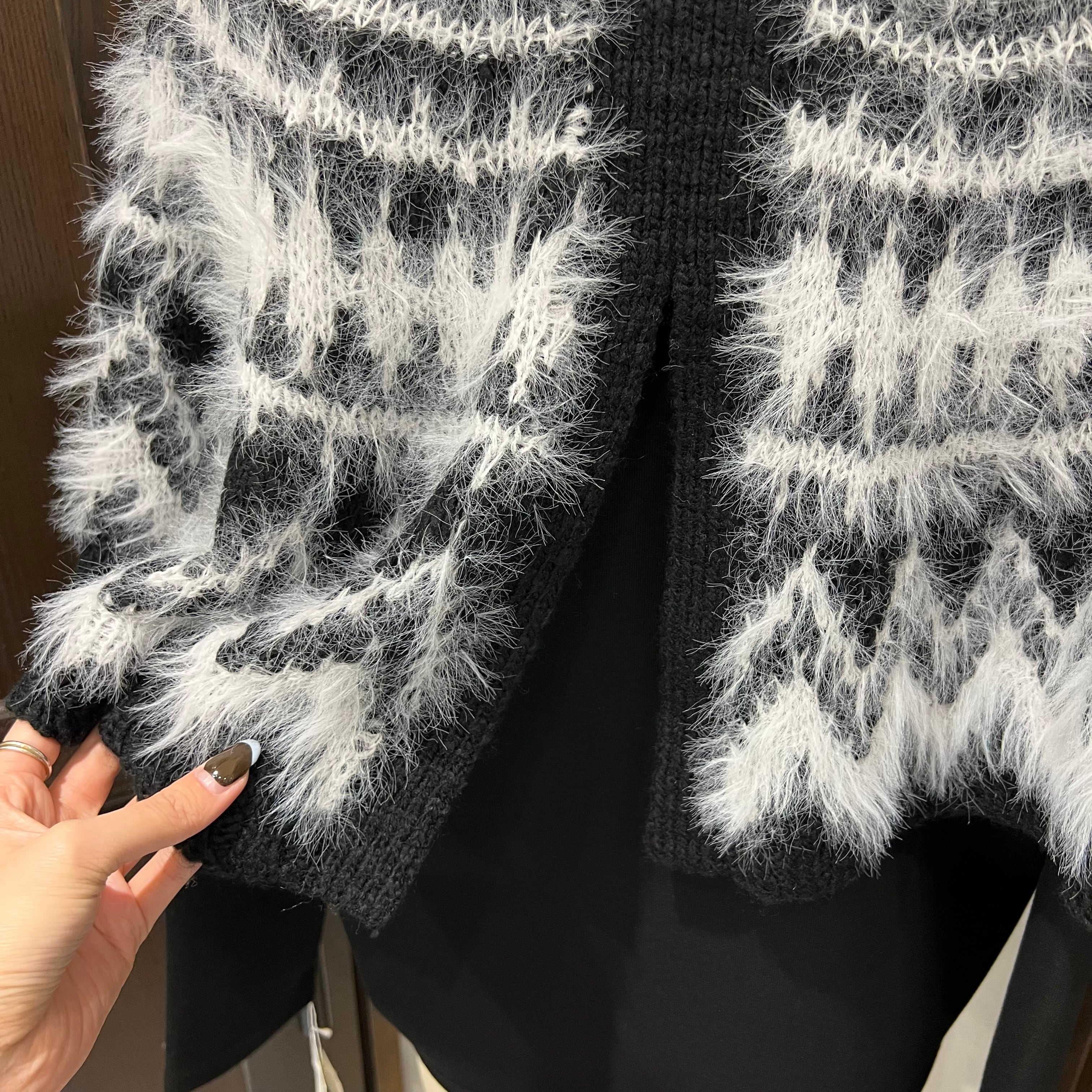 肩まわりから胸元にかけて毛足のある糸で編まれたノルディック風の柄が施され、季節感のあるあたたかみのある印象に。