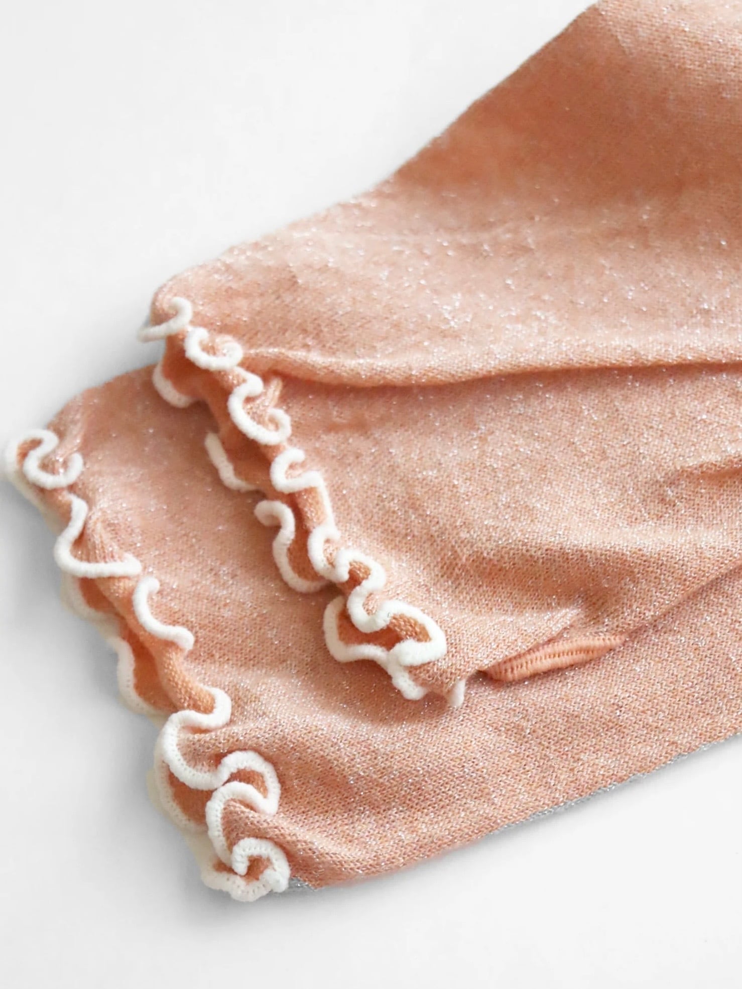 ラメ糸を一緒に編み込んで、袖口にはアクセントになるメロウを施したアームカバー。