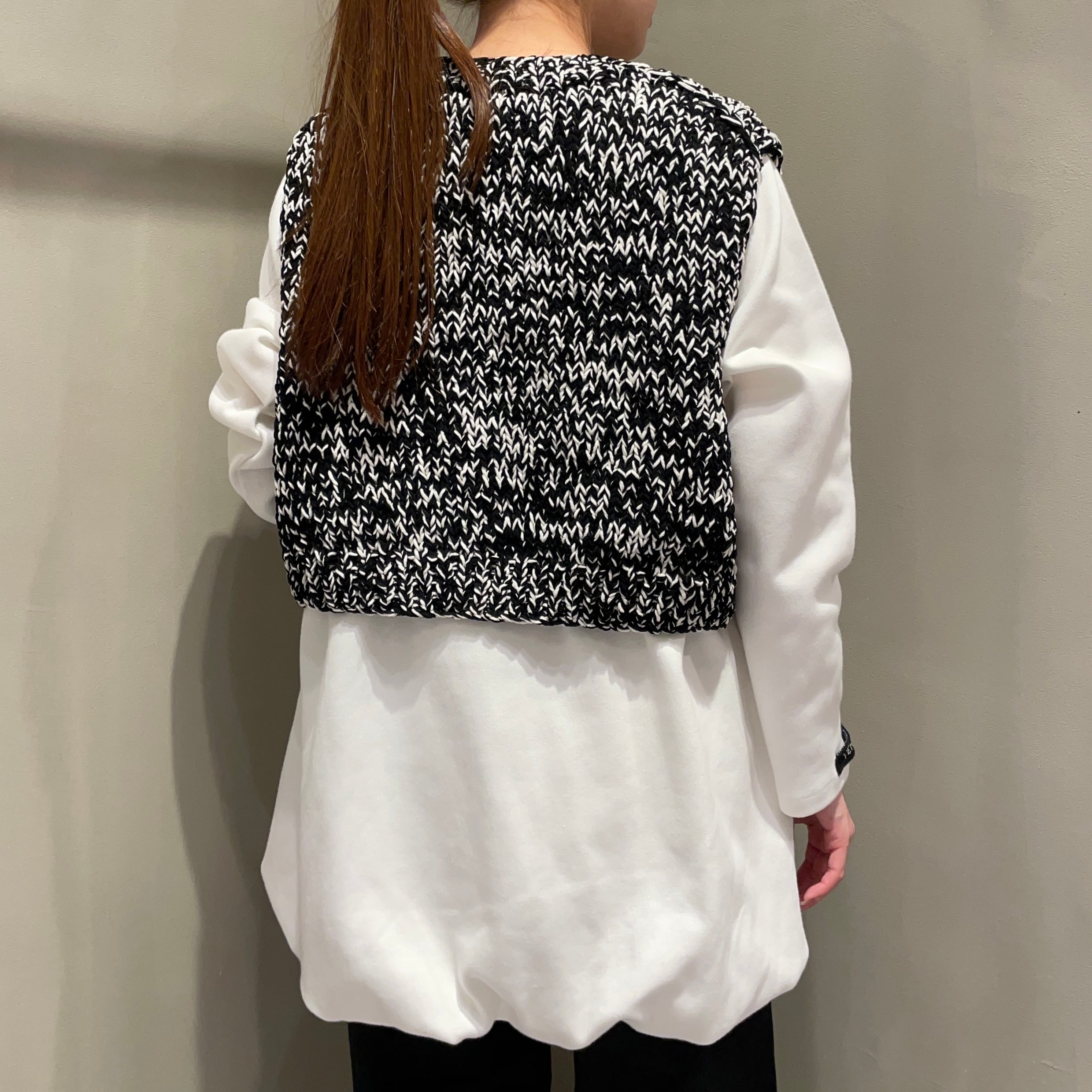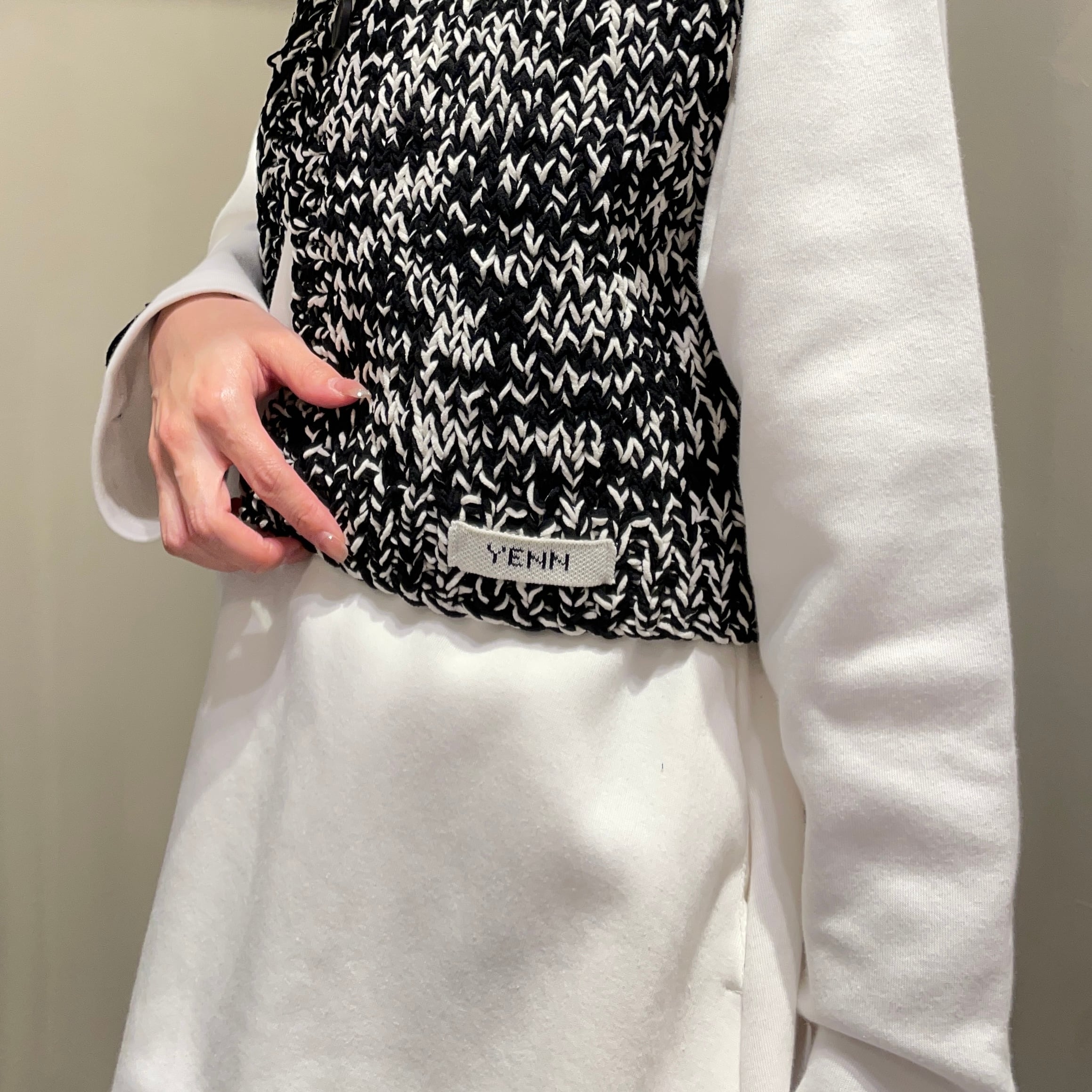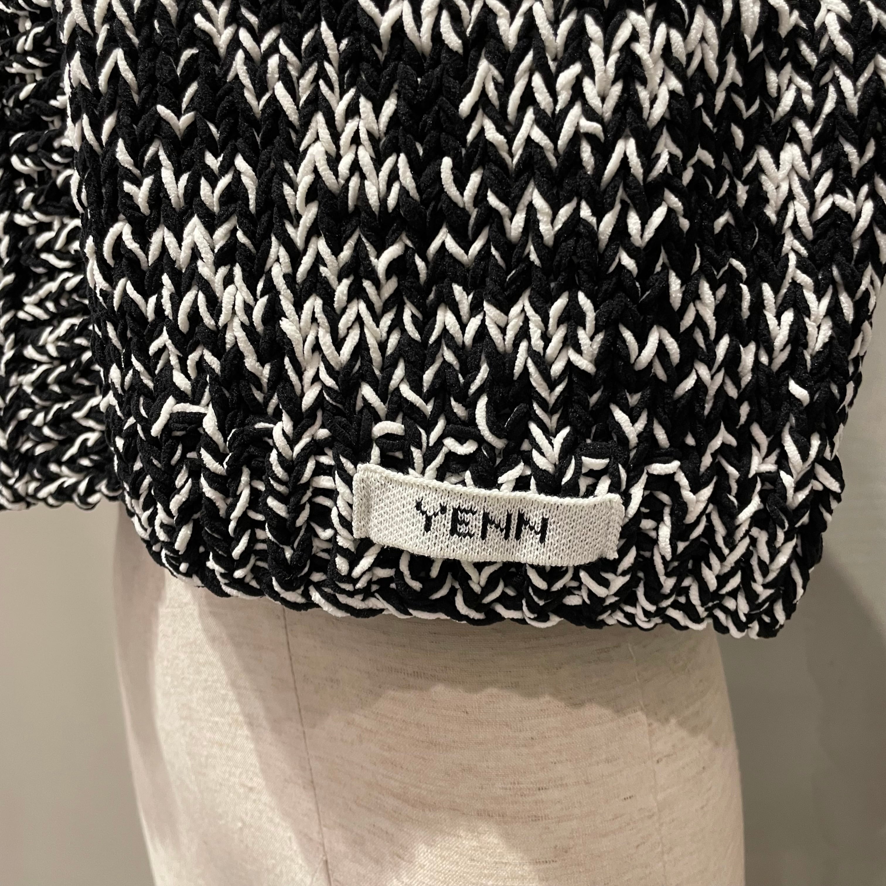 2色の糸を一緒に編んで作るMIXカラーがポイントです。太番手の糸で手編みすることで、ざっくりとした風合いのハンドメイドのようなノスタルジックな印象に仕上げました。しっかりボリュームがありながら、とても軽い糸なので、ストレスフリーでレイヤードスタイルを楽しんでいただけます。左裾に施した“YENN”ロゴテープもポイントです。