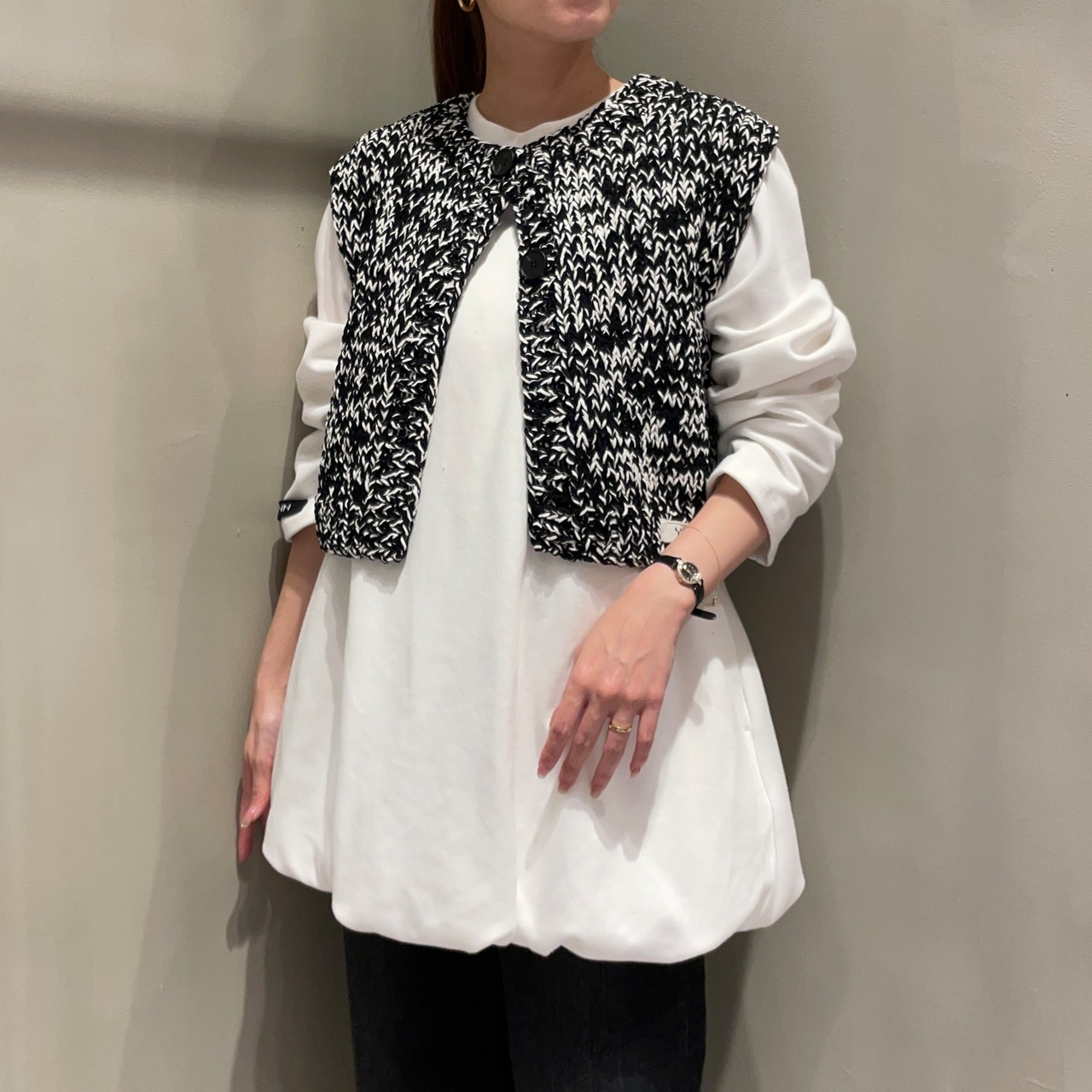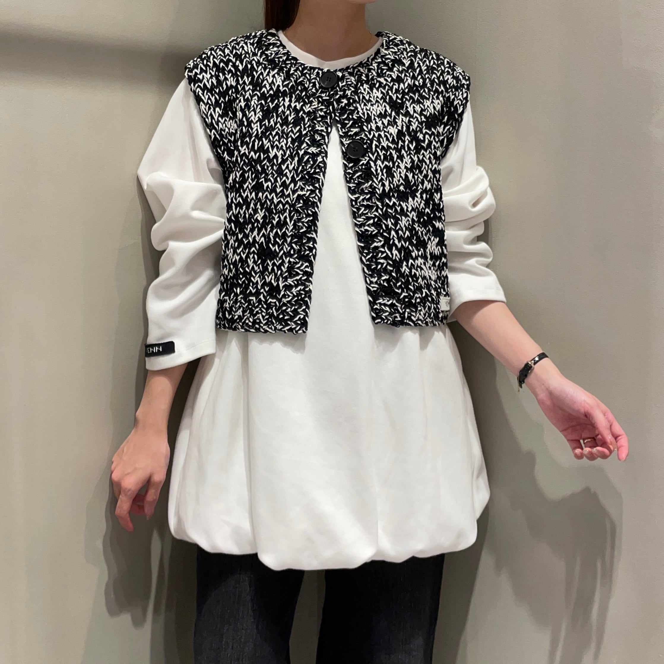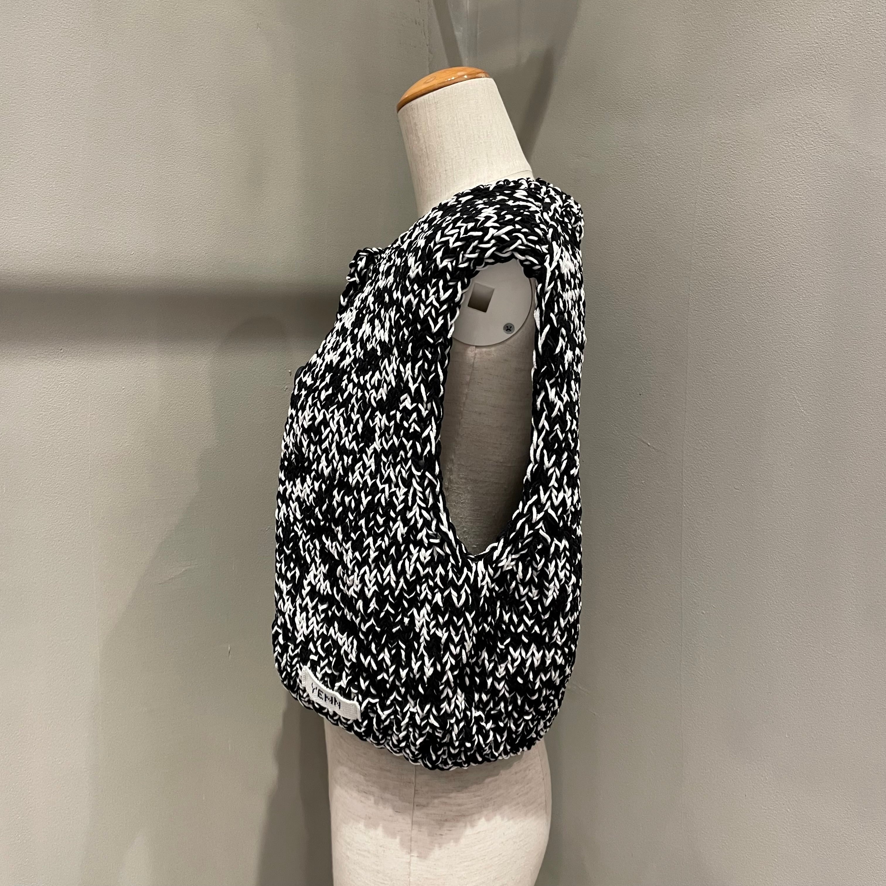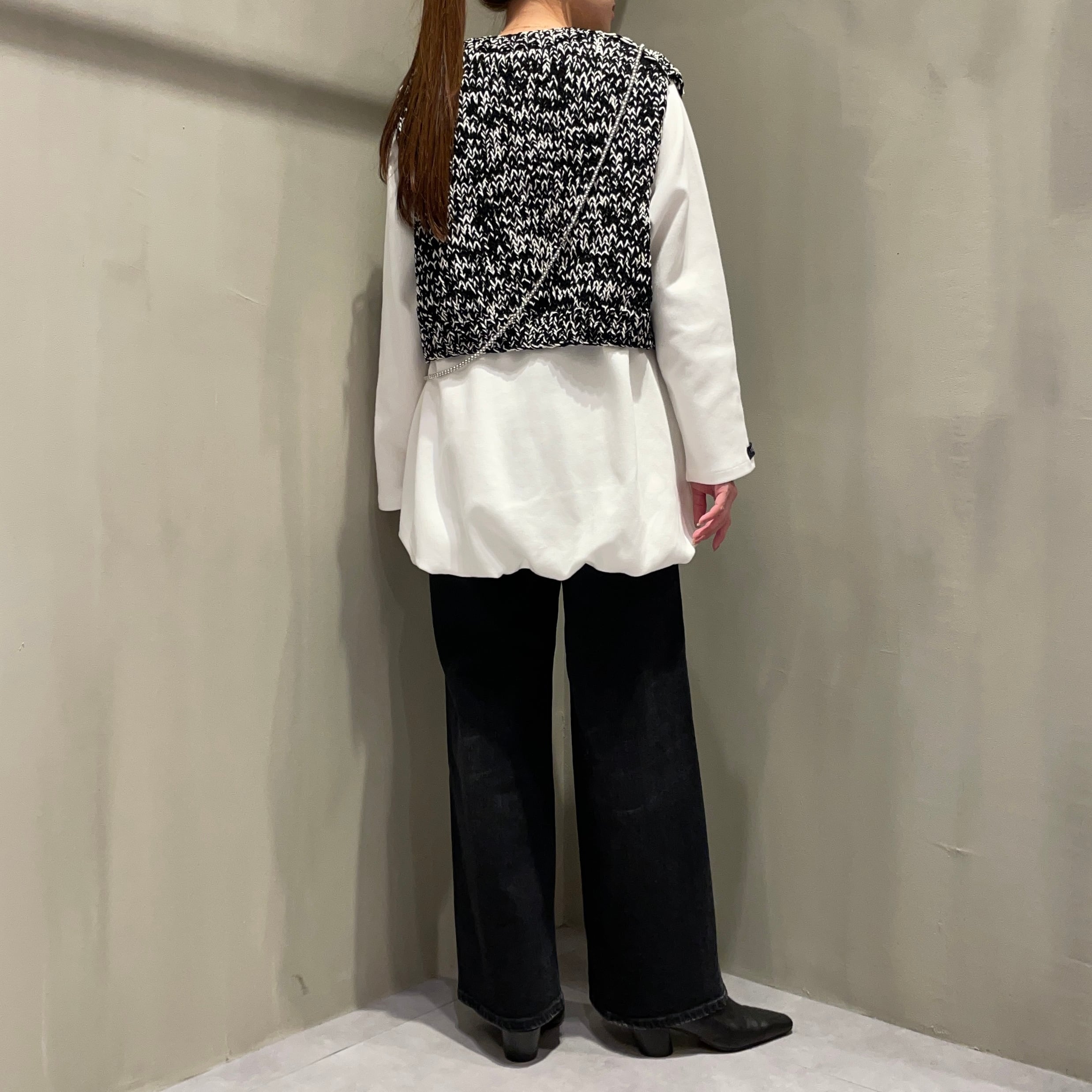 2色の糸を一緒に編んで作るMIXカラーがポイントです。太番手の糸で手編みすることで、ざっくりとした風合いのハンドメイドのようなノスタルジックな印象に仕上げました。しっかりボリュームがありながら、とても軽い糸なので、ストレスフリーでレイヤードスタイルを楽しんでいただけます。左裾に施した“YENN”ロゴテープもポイントです。