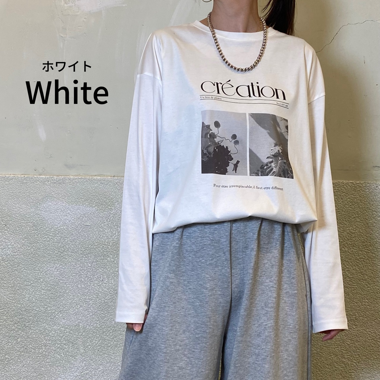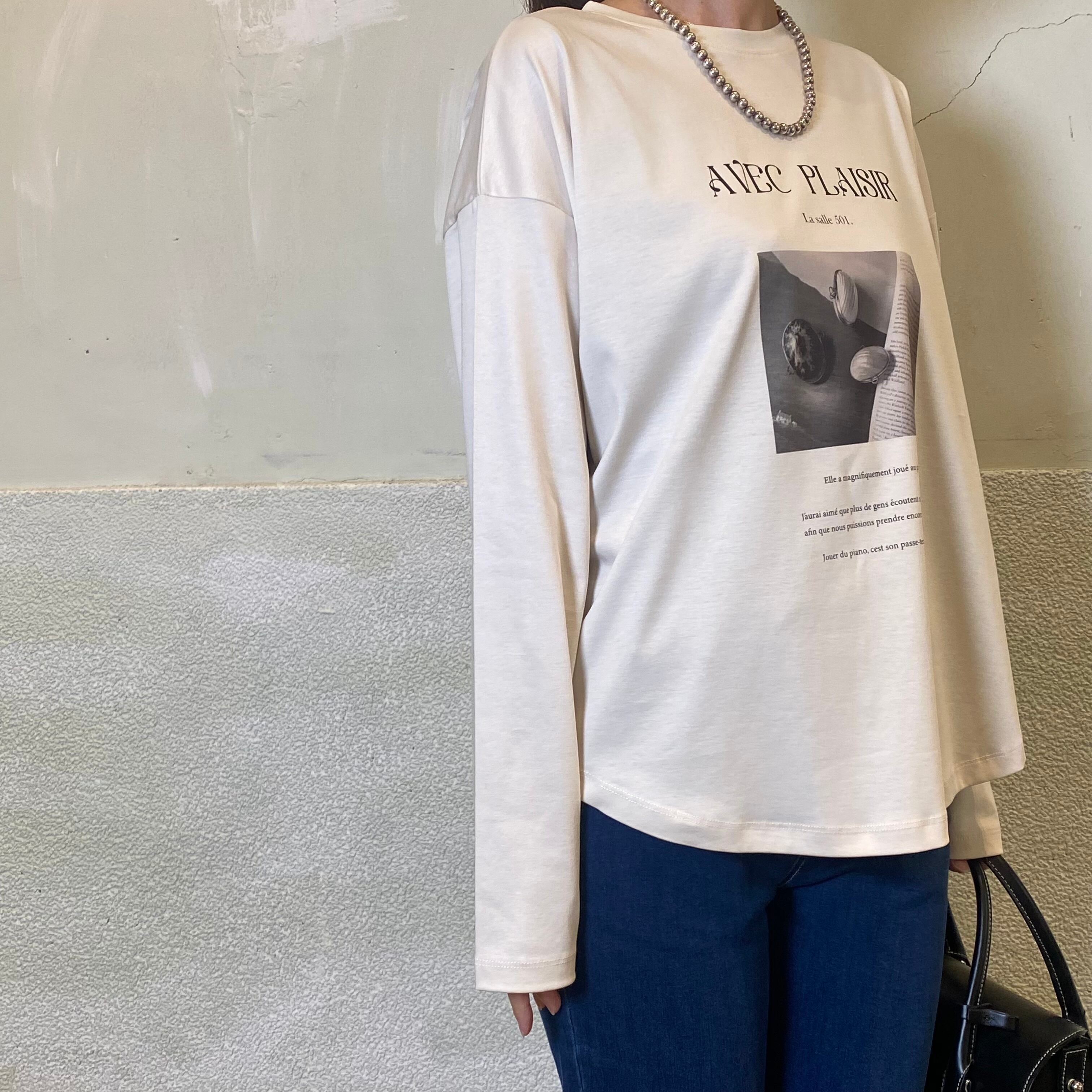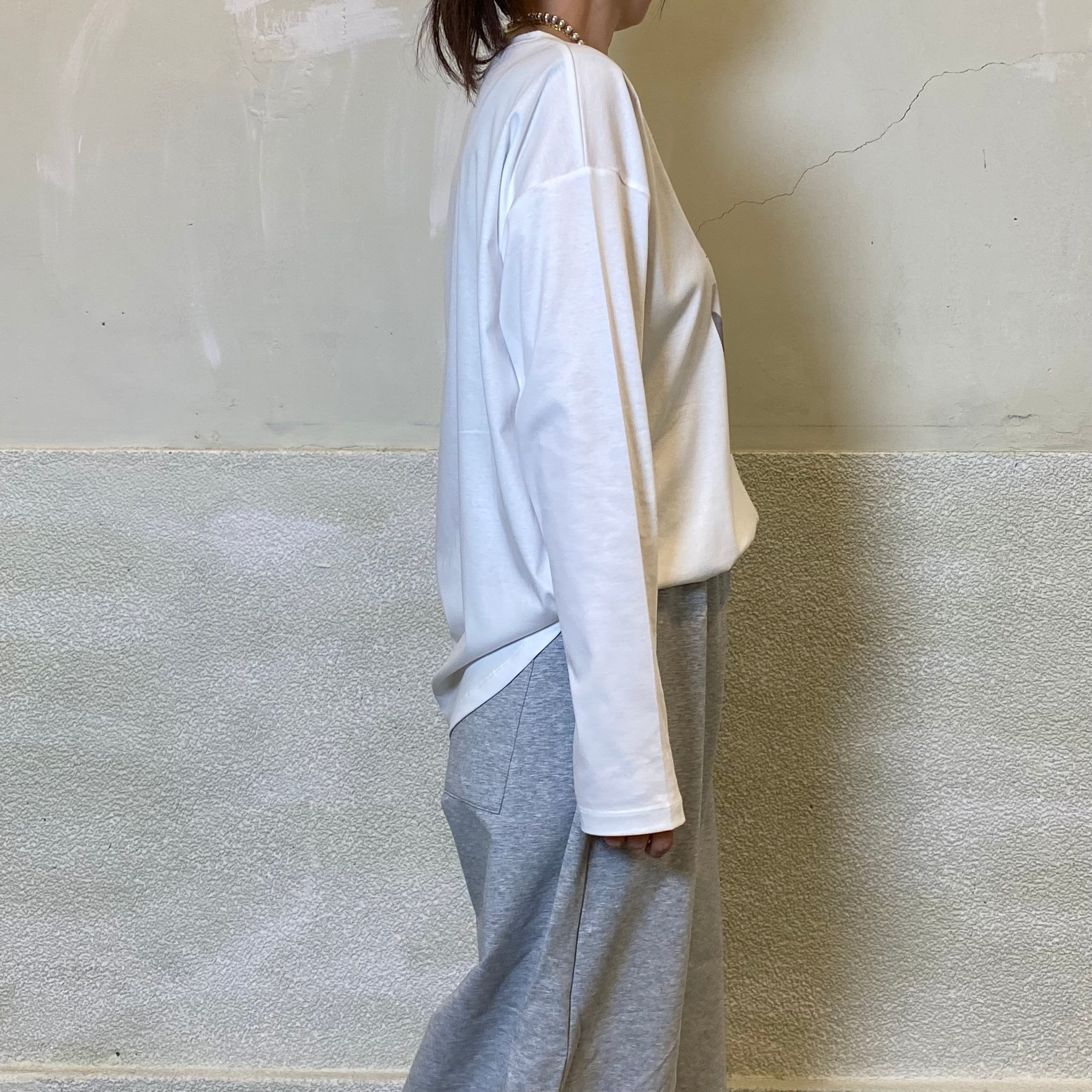 それぞれの色に違うグラフィックフォトプリントをON。裾はラウンドしており、ニットやスウェットとレイヤードしたときにも、裾からレイヤードが見えやすい丈感です。ヒップも隠れる丈感でリラクシーなサイズ感です。
