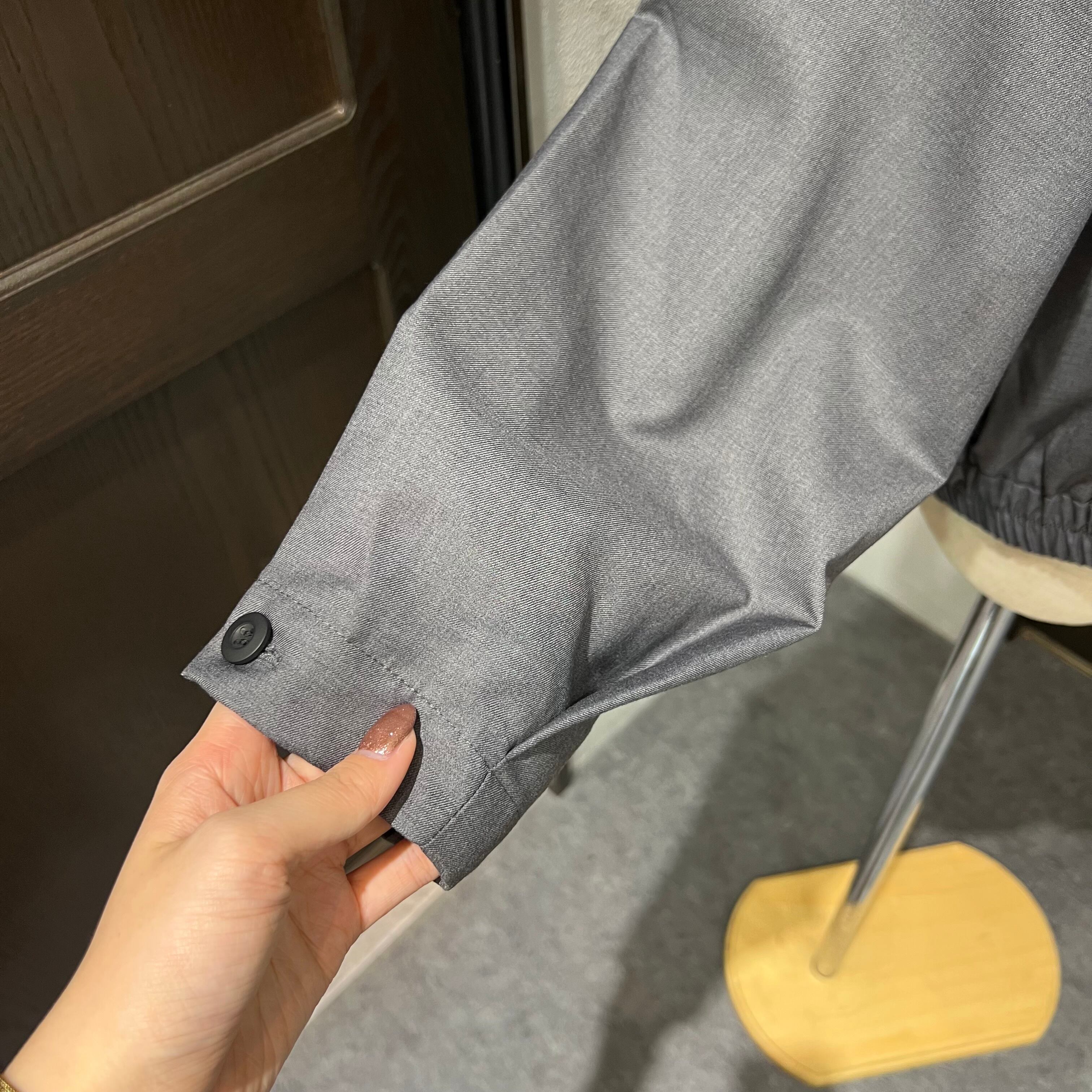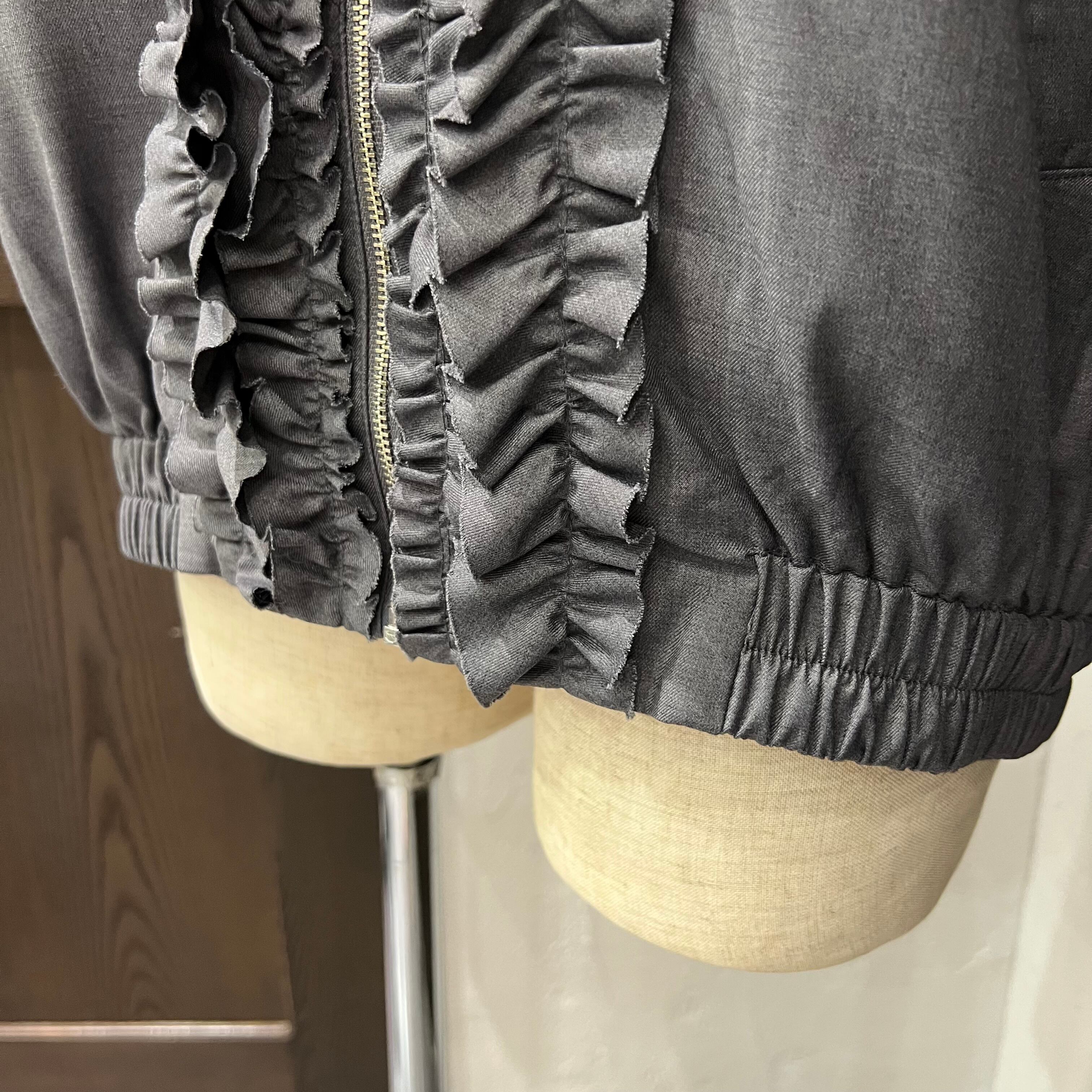 フリルが施されたノーカラーブルゾンで、シンプルながら華やかな印象を与えてくれます。