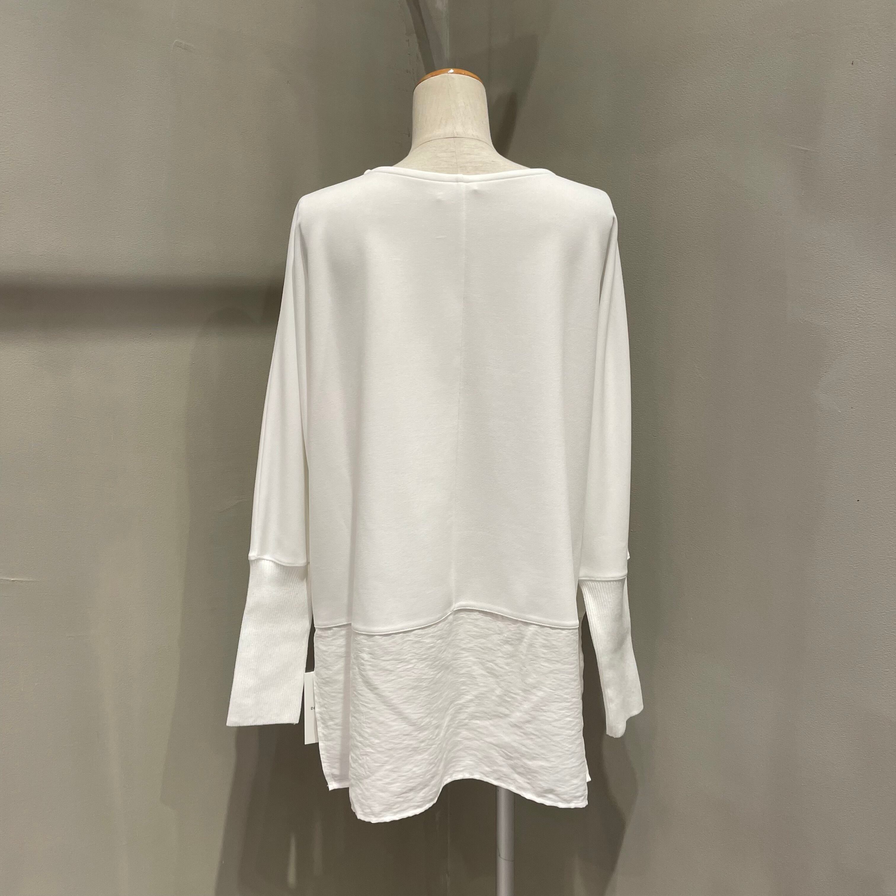 袖の長めのリブ使いや、バック裾のオーガンジー素材の切替がポイント。