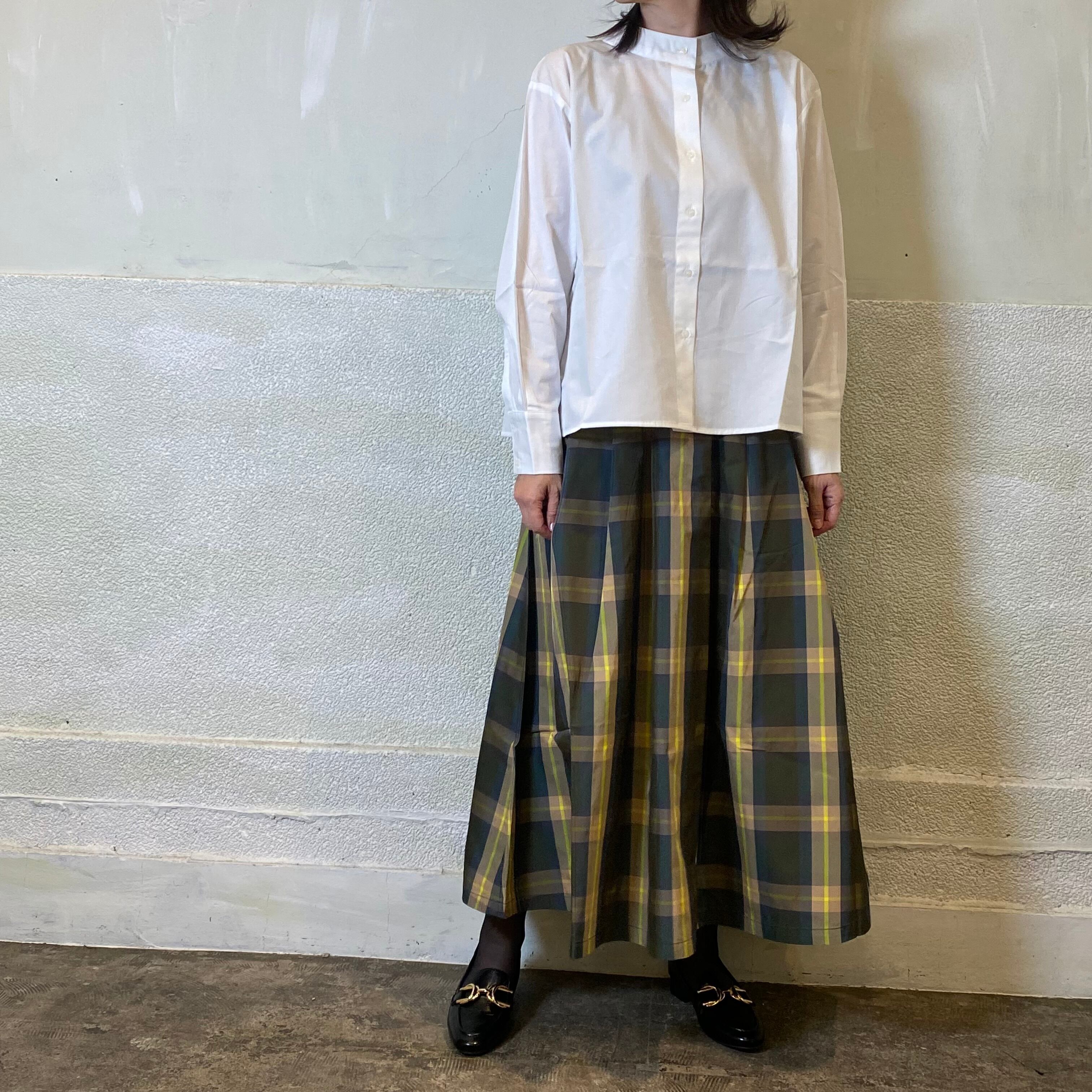 ハリ感がありつつ軽い素材感で、ウエストから裾に向かって広がるシルエットは、ヒップや太ももを自然にカバーし、スタイルアップ効果が期待できます。