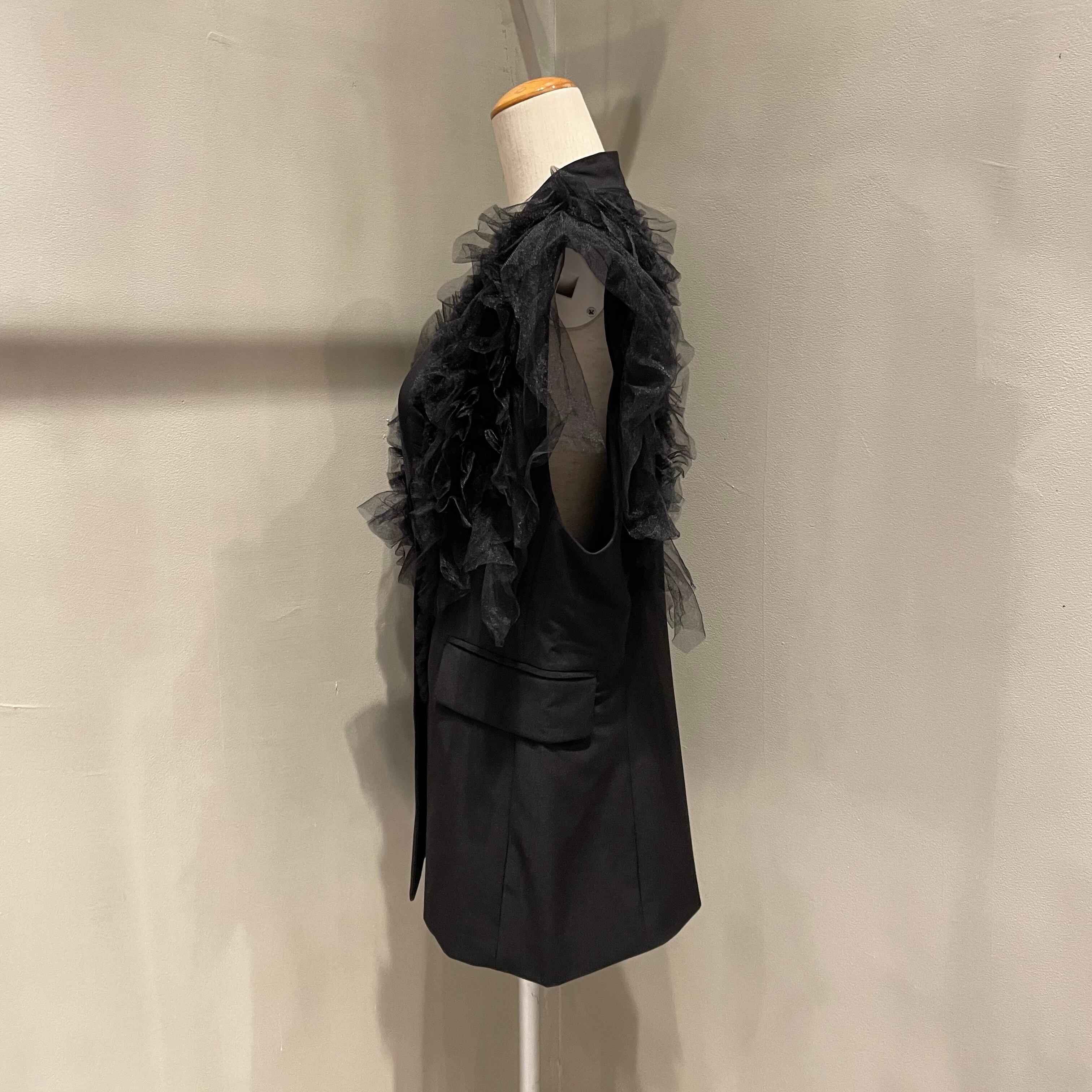衿が首に沿うように設計されたきちんと感あふれるベストに、アシンメトリーに大胆にあしらわれたチュールフリルが目を引く一着。