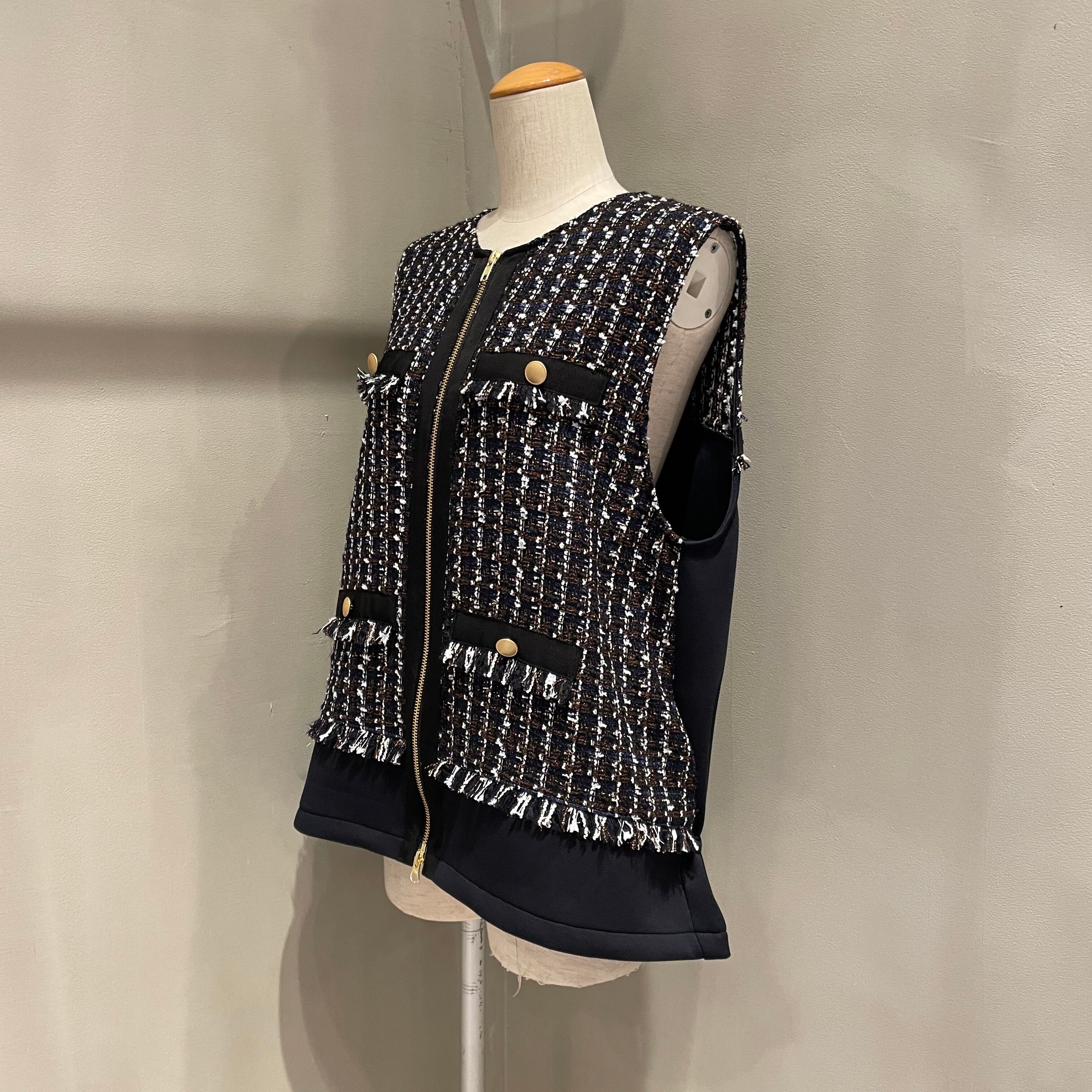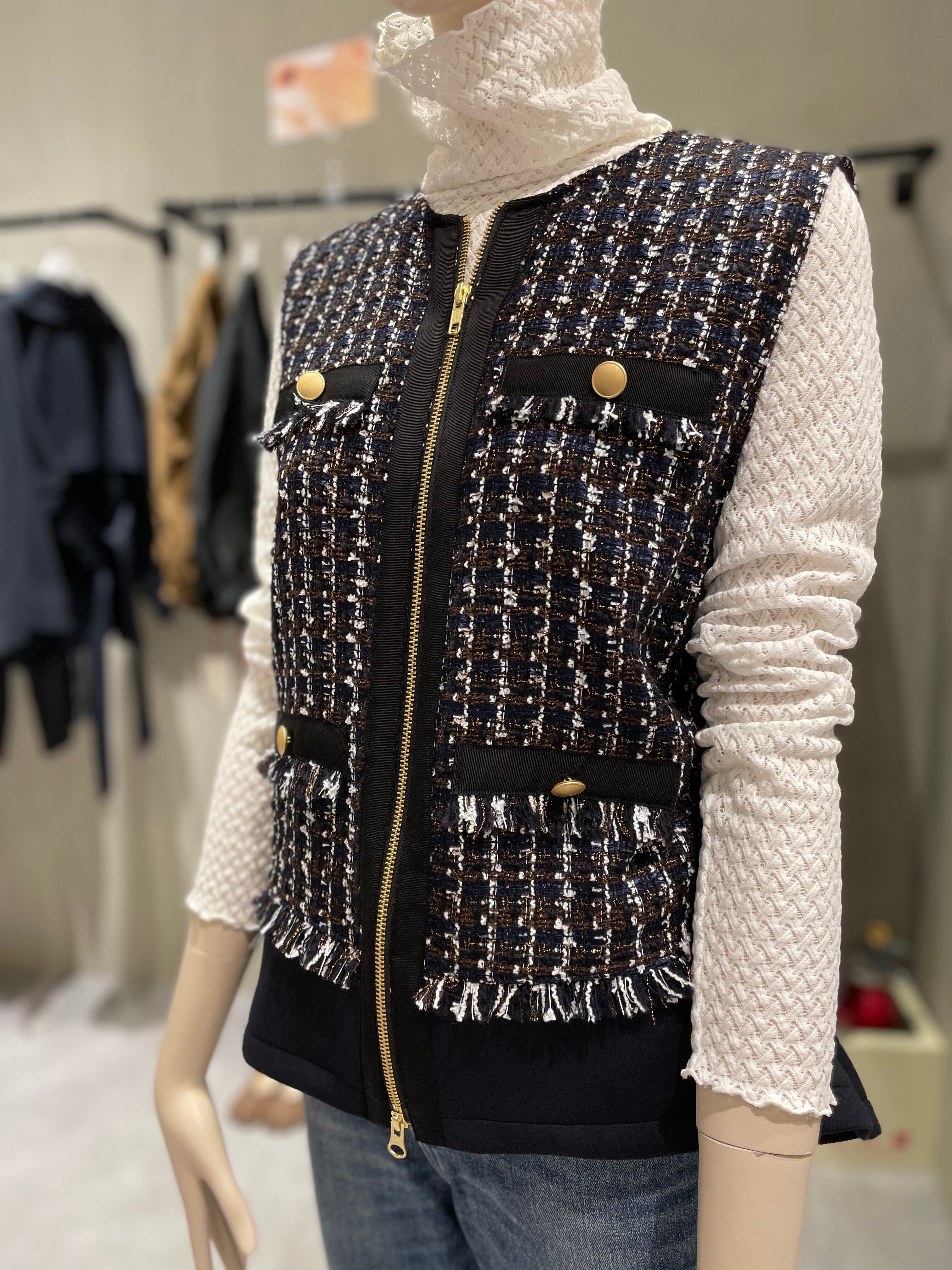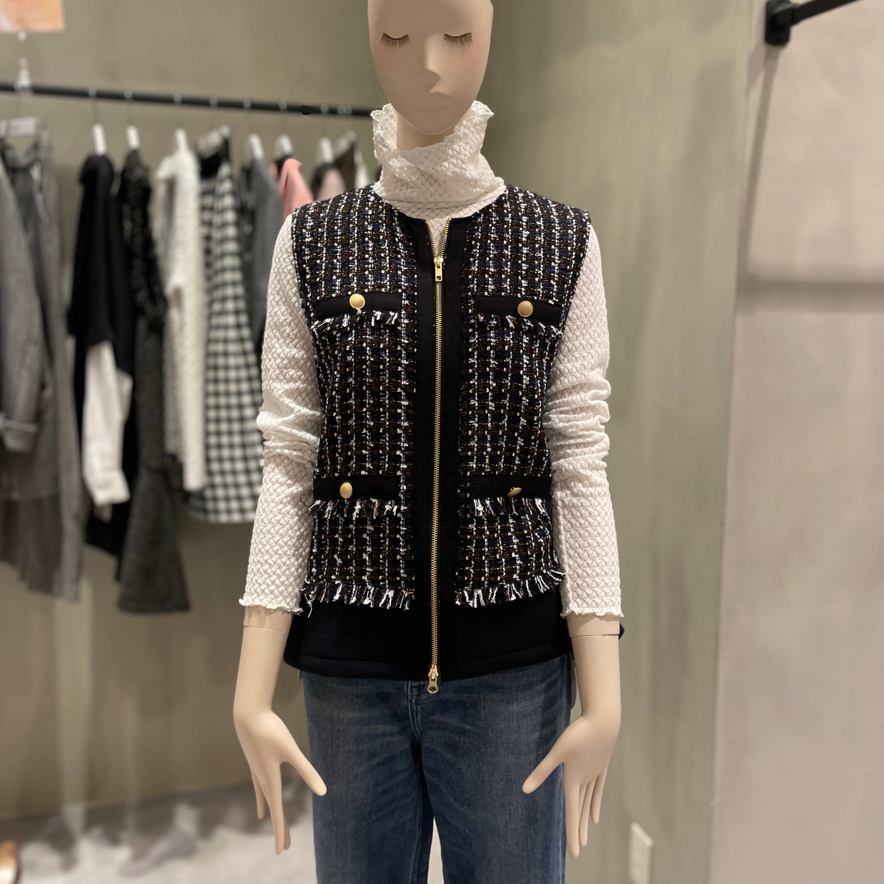 華やかなMIX糸ツイードと軽いダンボール生地を組み合わせた主役級ジレ。