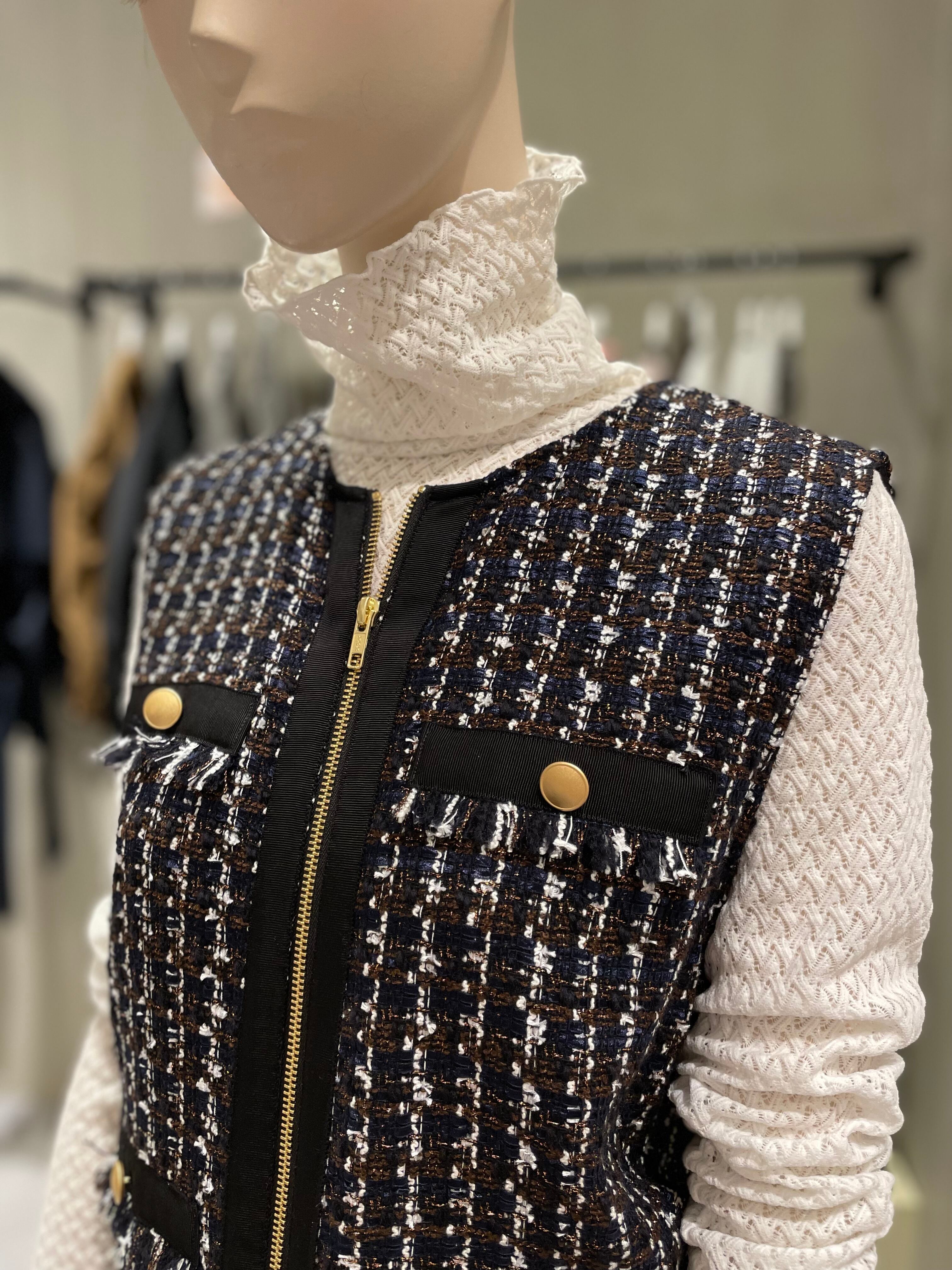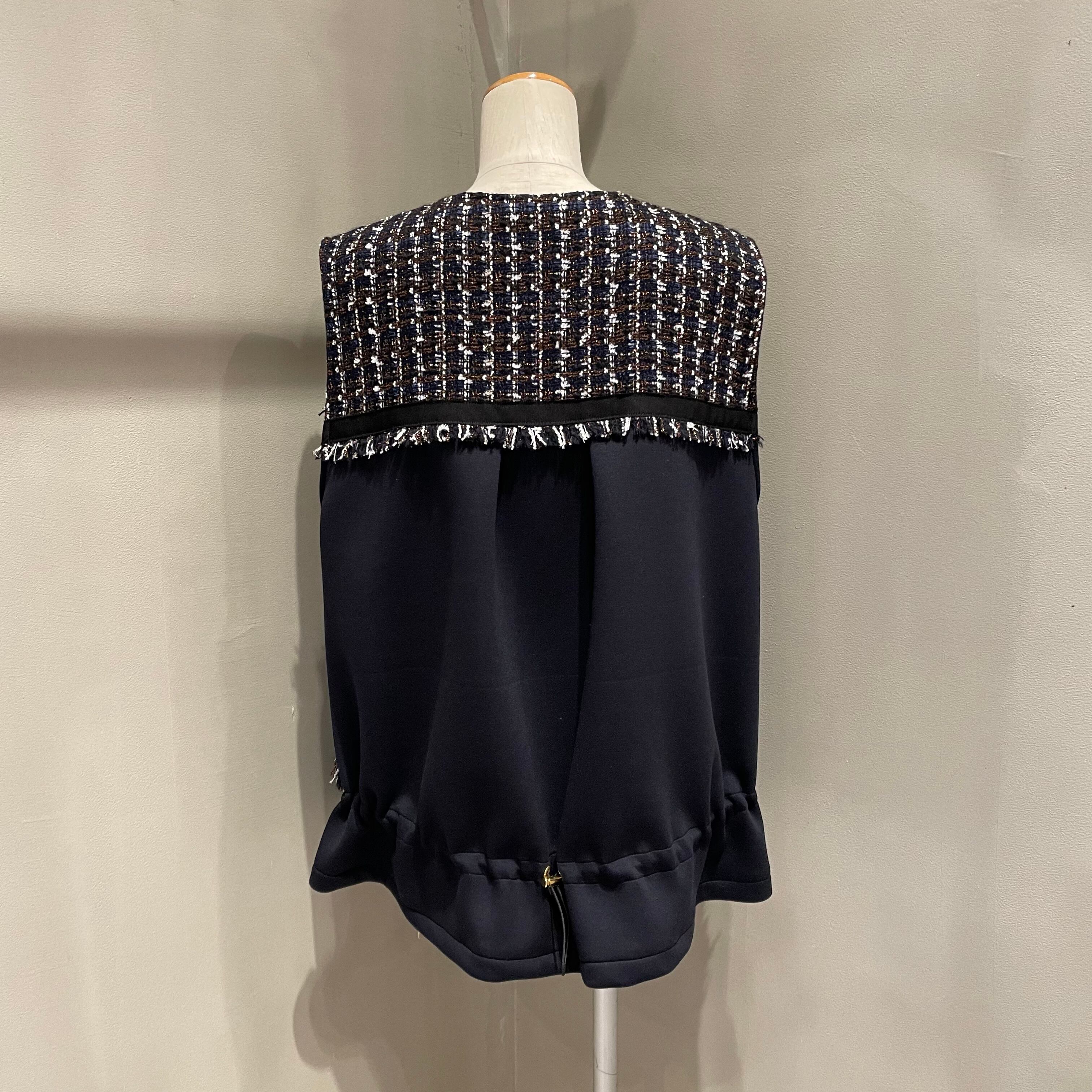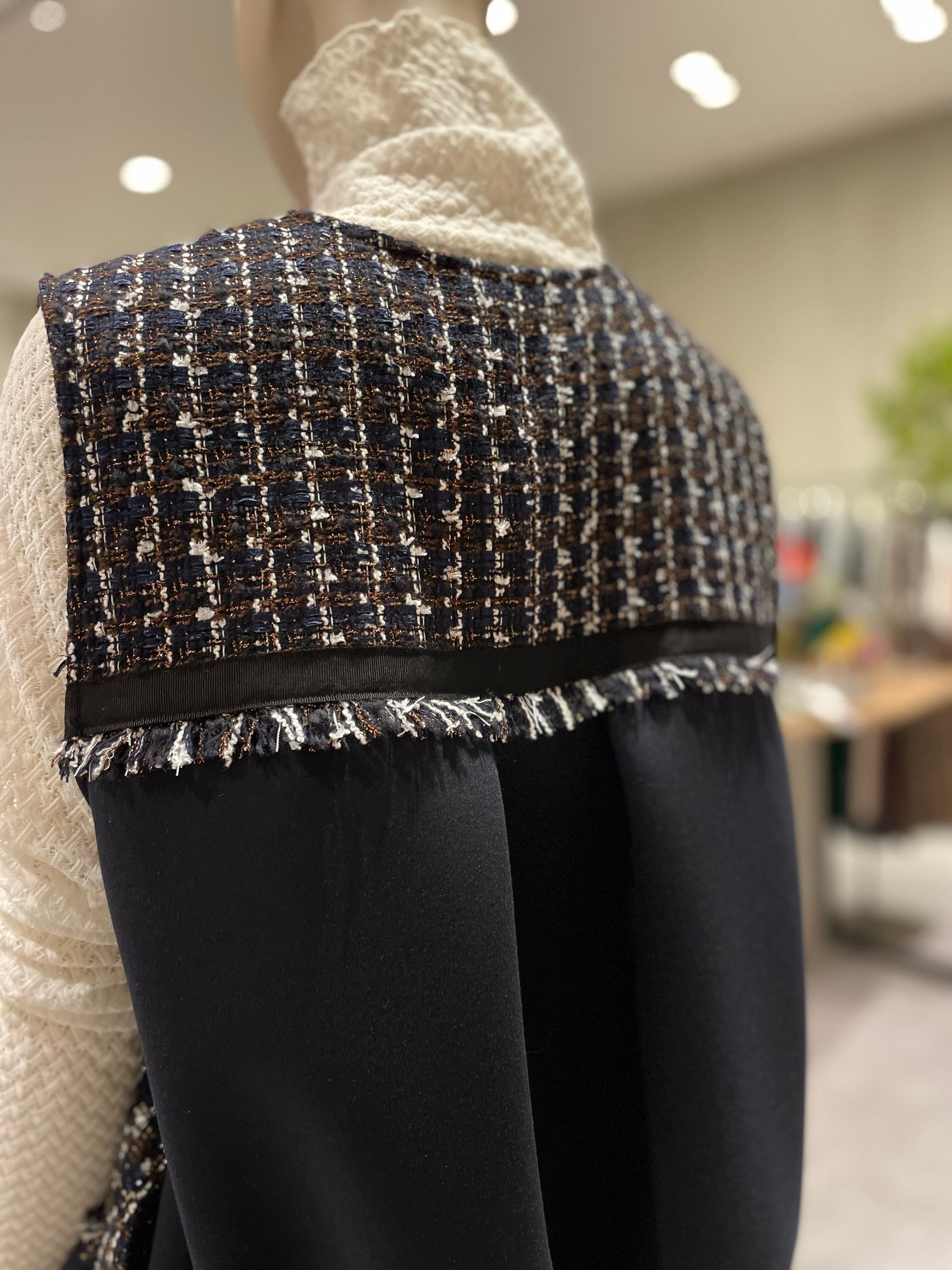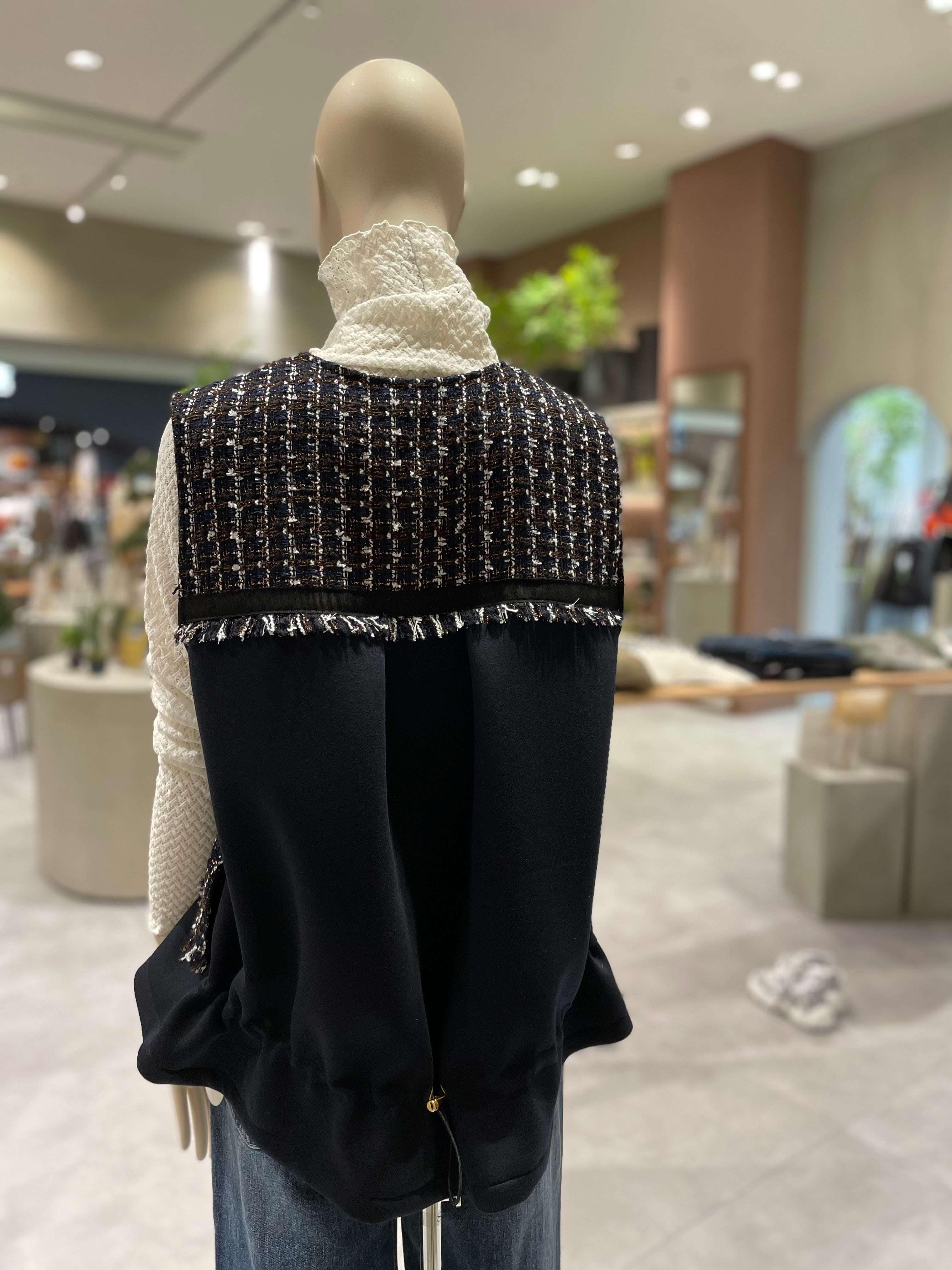 華やかなMIX糸ツイードと軽いダンボール生地を組み合わせた主役級ジレ。