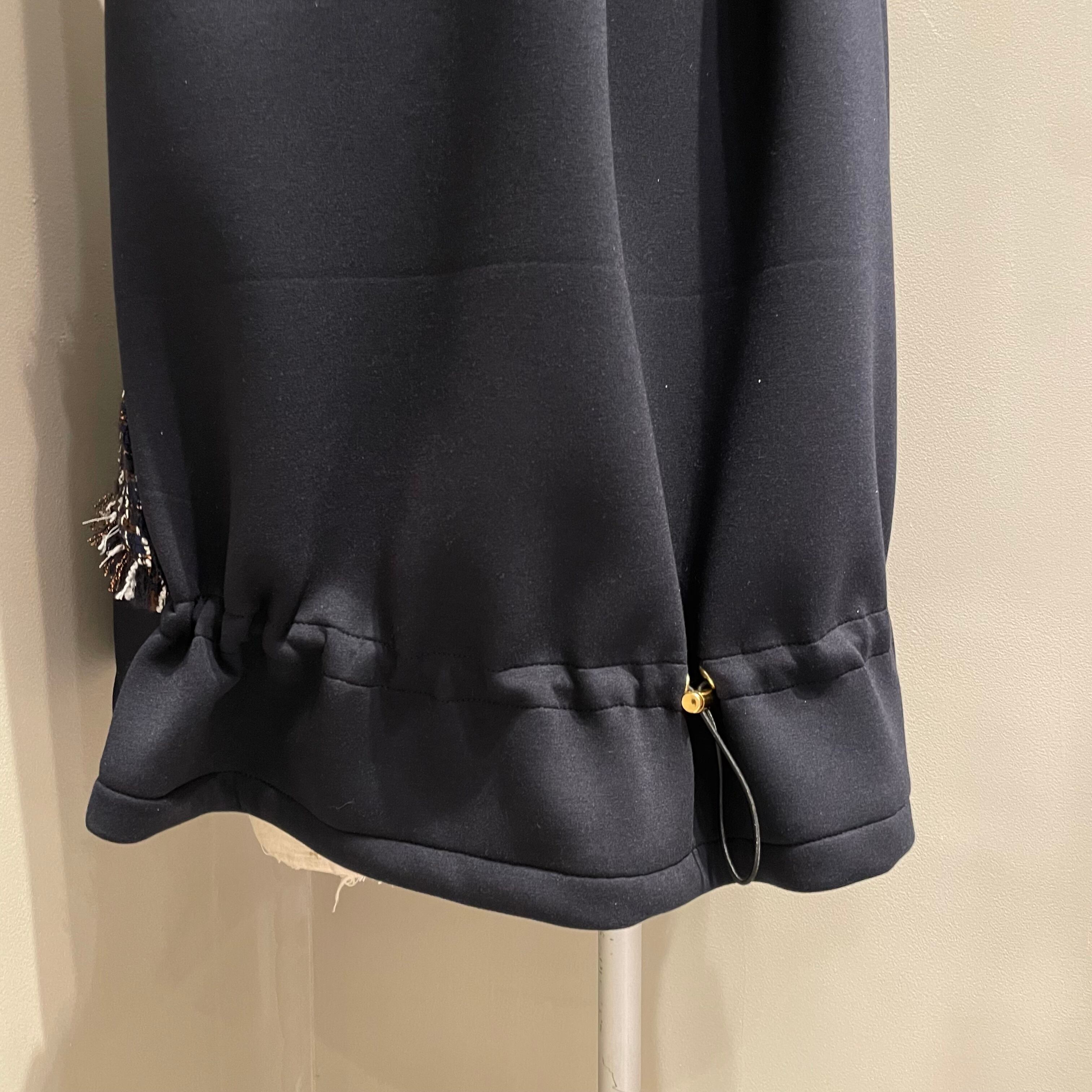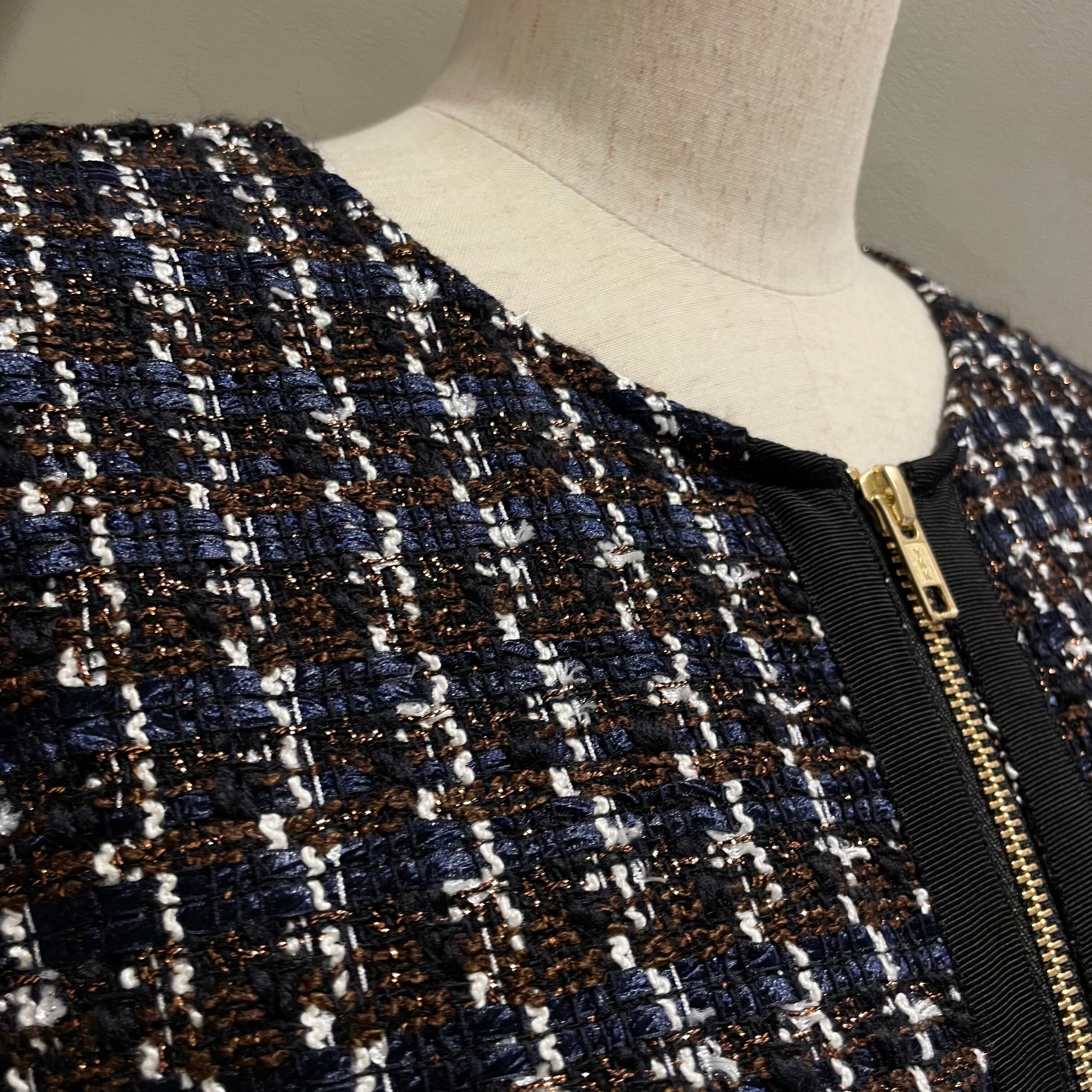 スッキリしたデザインにフリンジを施し前身はスッキリ、後ろ身は立体的なトロワらしいシルエットに仕上げました。ツイードとダンボール生地のバランスが絶妙で、フロントには金ボタン付きのポケットが、クラシカルなアクセントに!