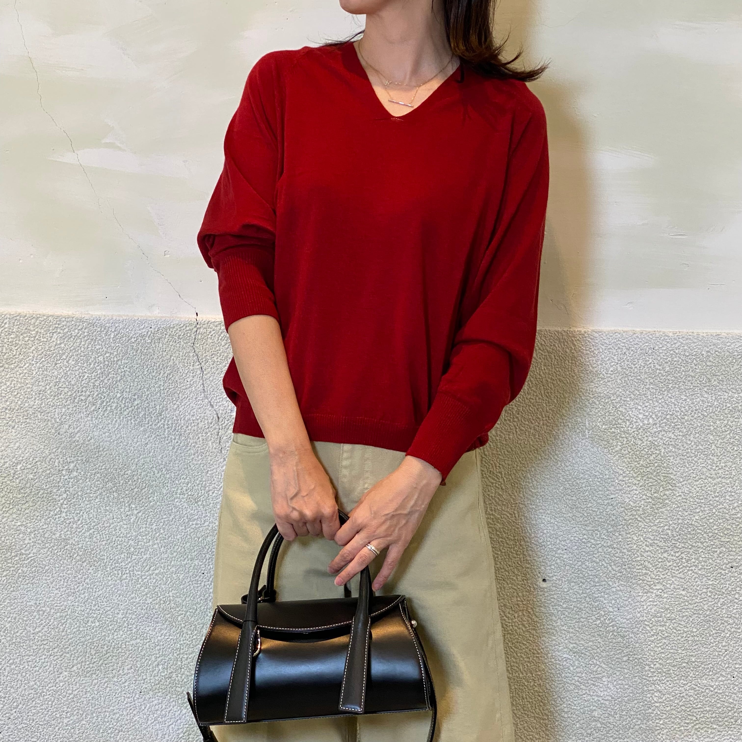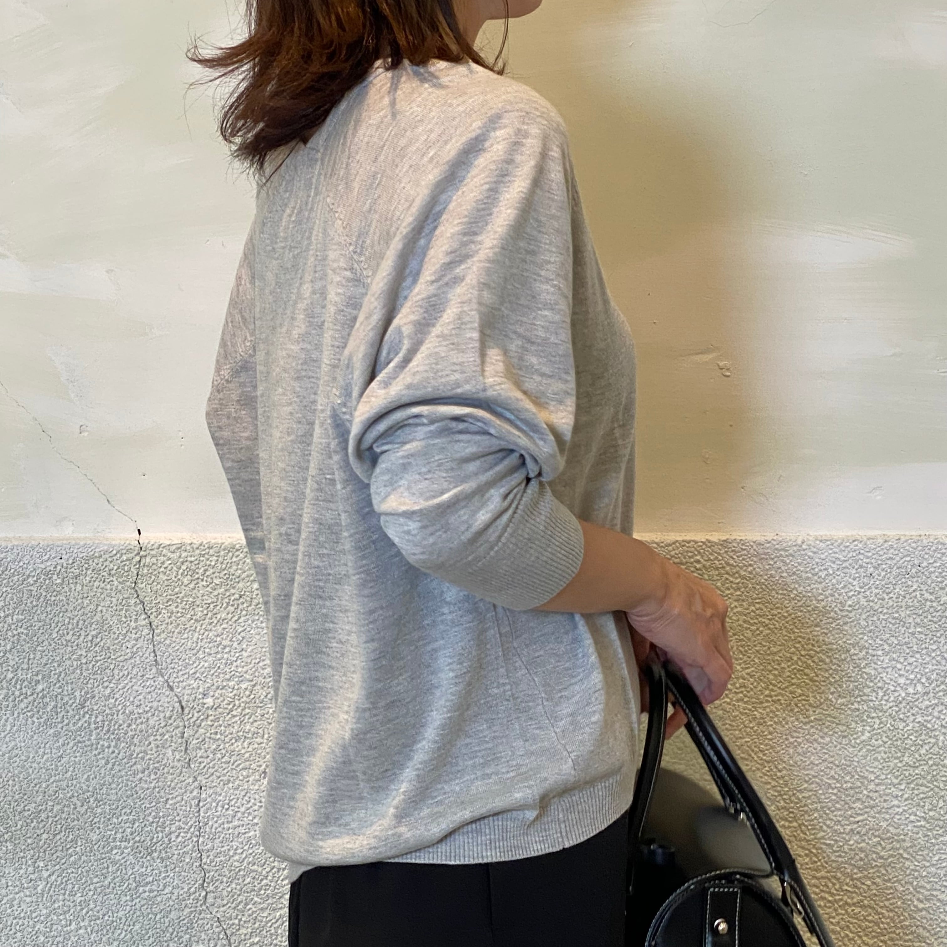 初秋にも嬉しい薄手の編地の表面にうっすらとピーチ起毛をかけたVネックプルオーバーです。