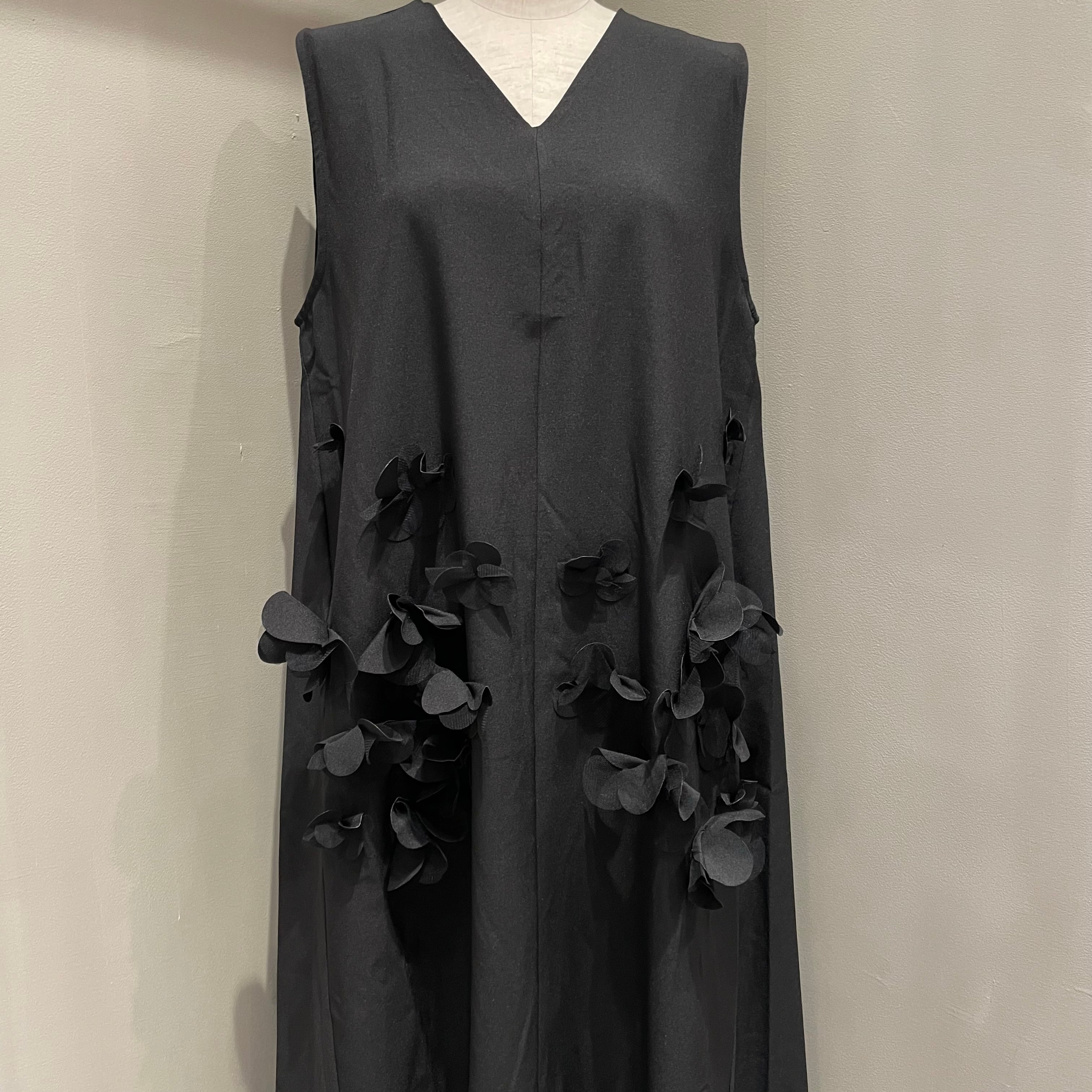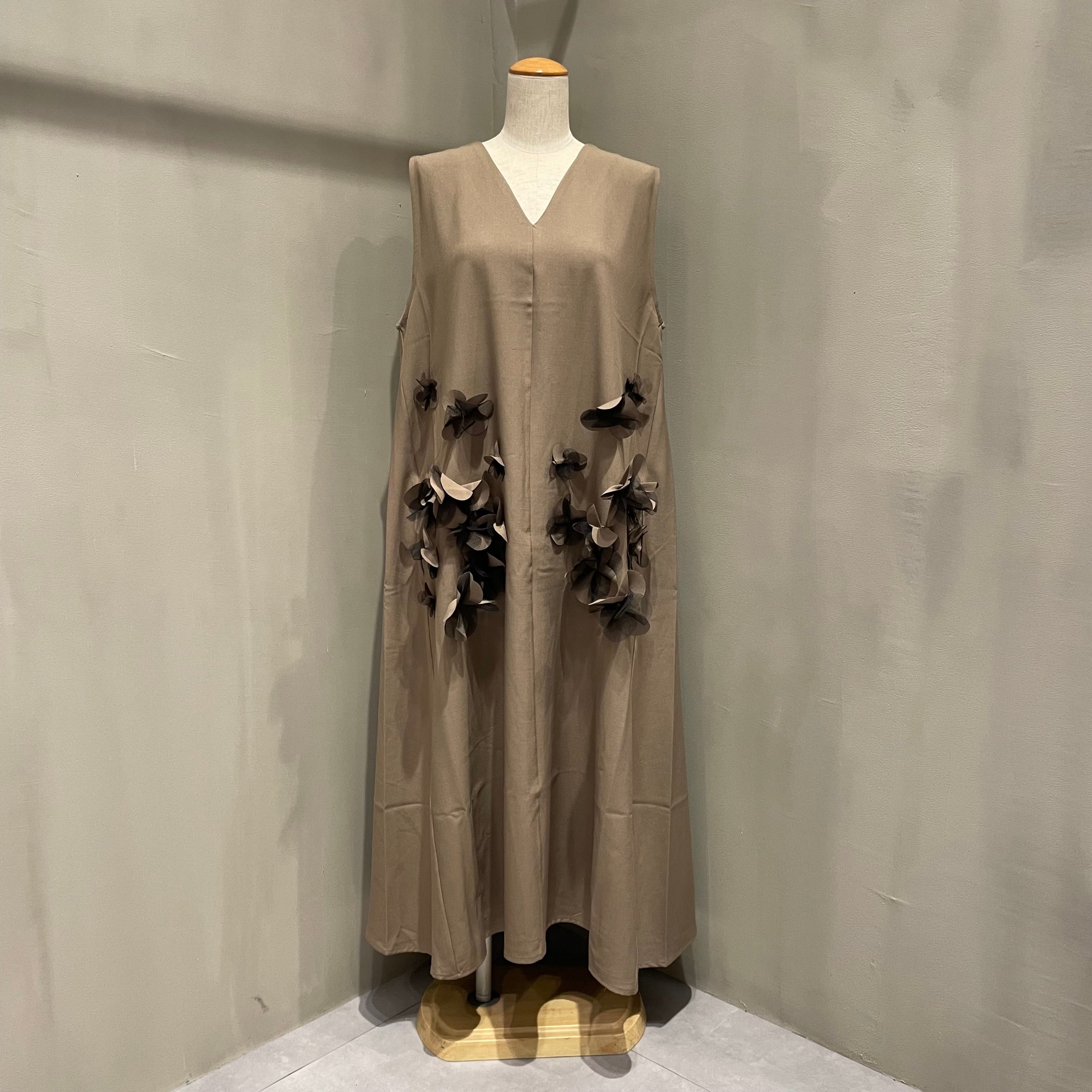 チュールをレイヤードしたフラワーモチーフがインパクトのあるワンピース。