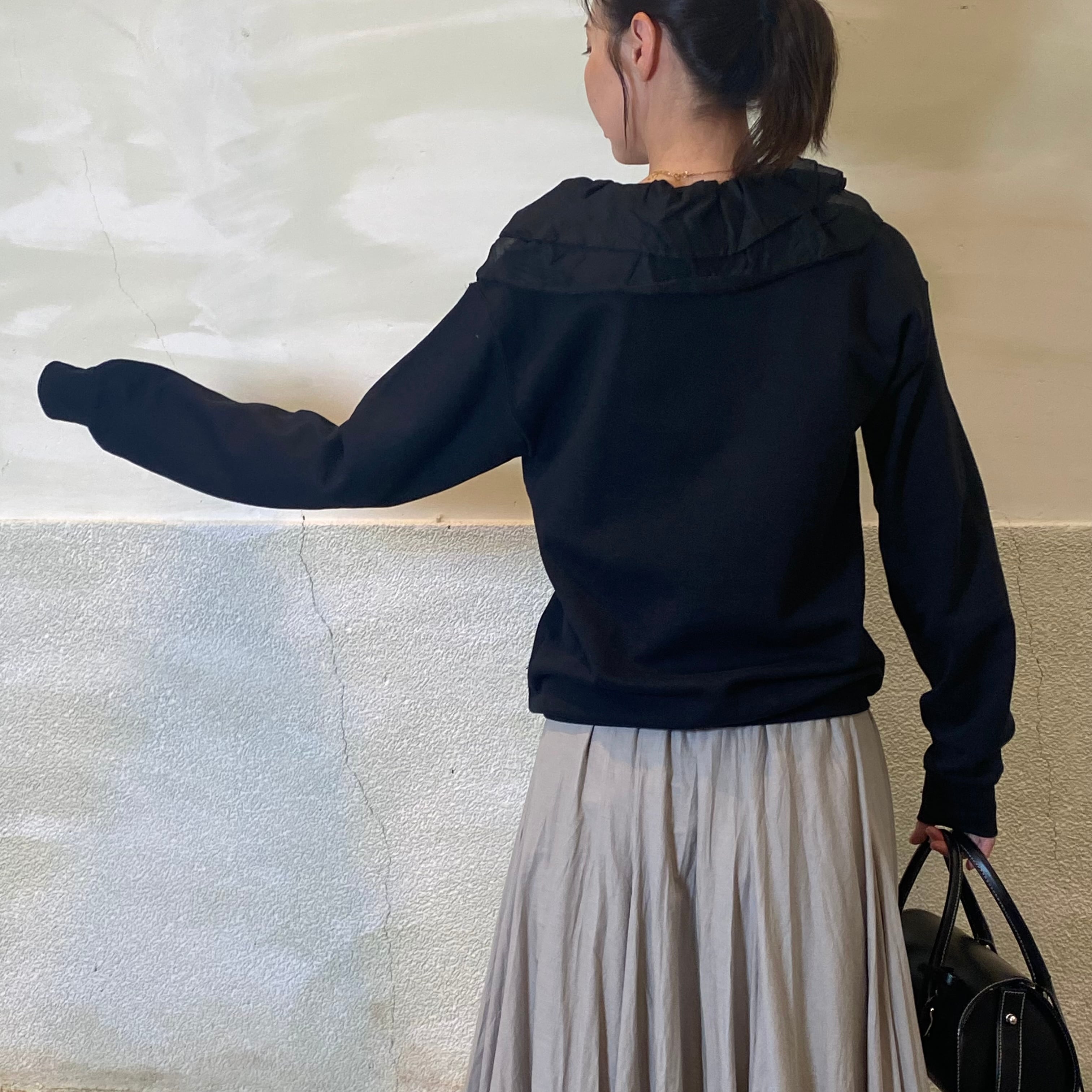 カジュアルなボトムスにも、スカートやドレッシーなパンツとも相性が良く、フェミニンな雰囲気を演出します。シンプルながらも存在感のあるデザインなので、アクセサリーとの組み合わせで個性を引き立ててください。
