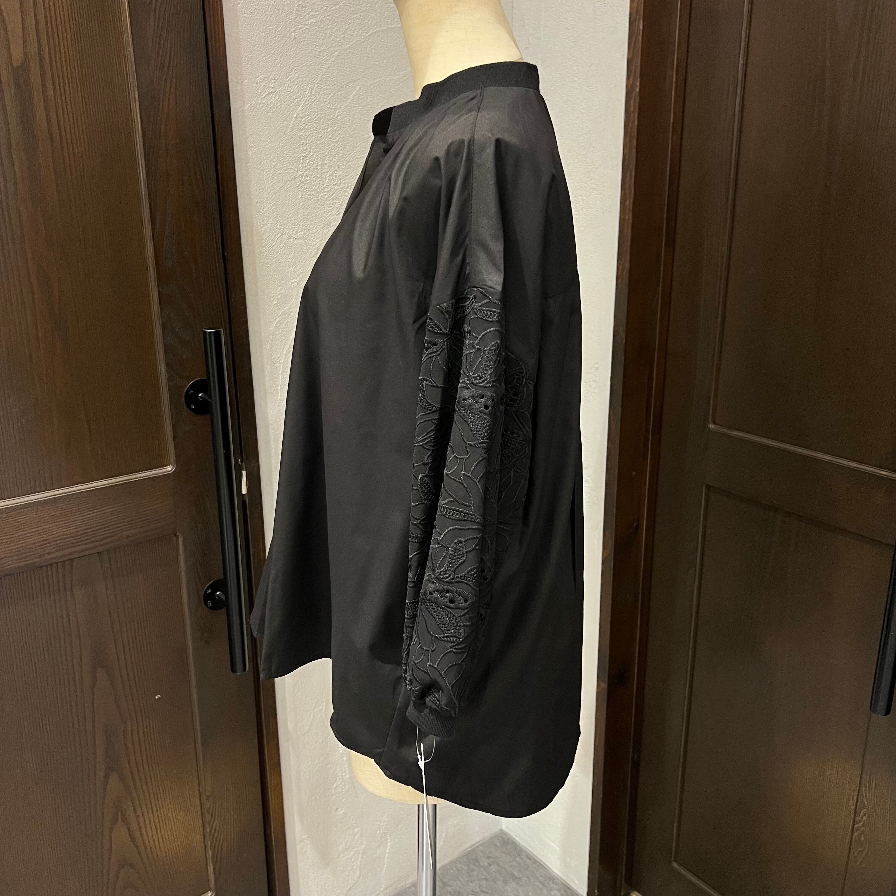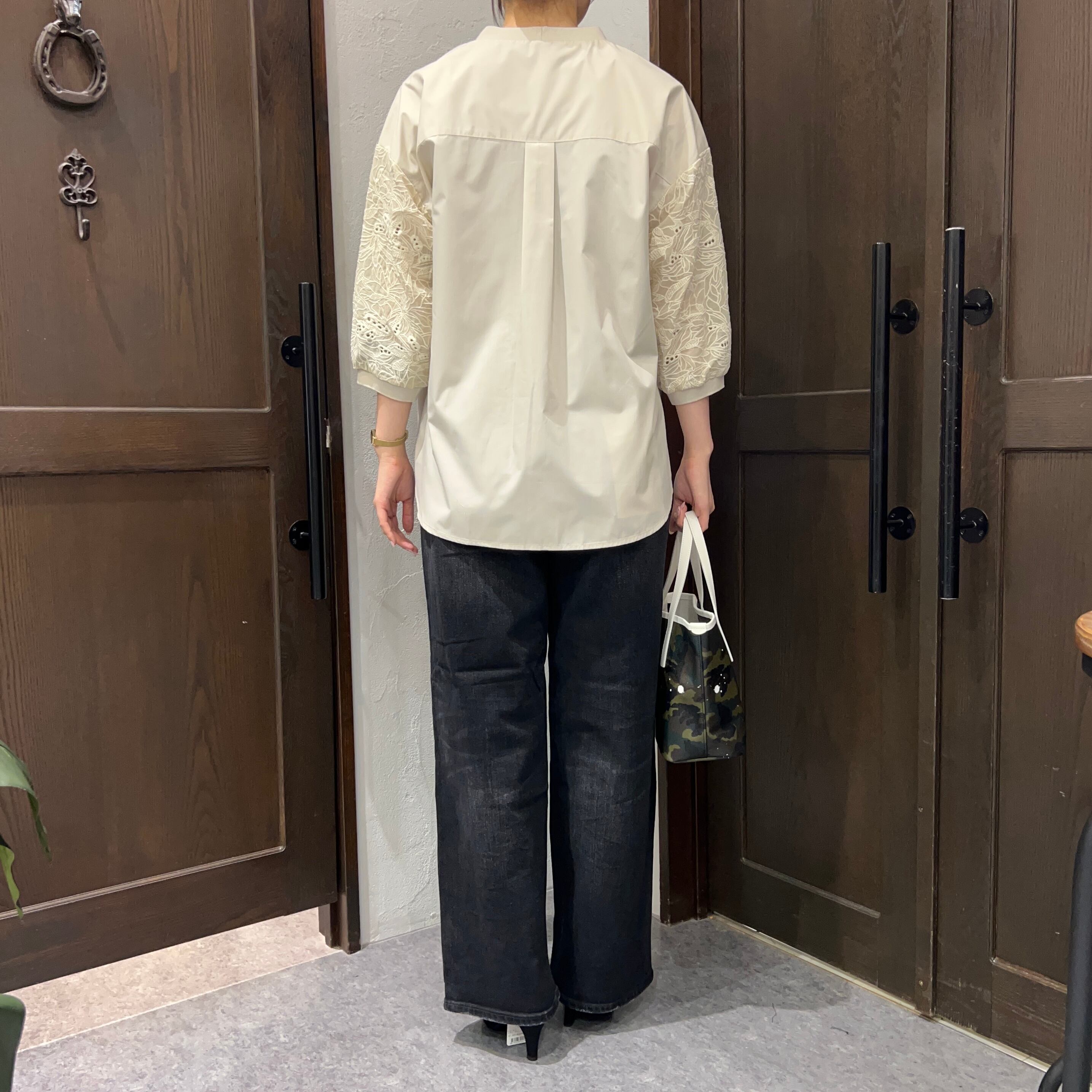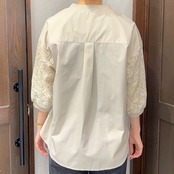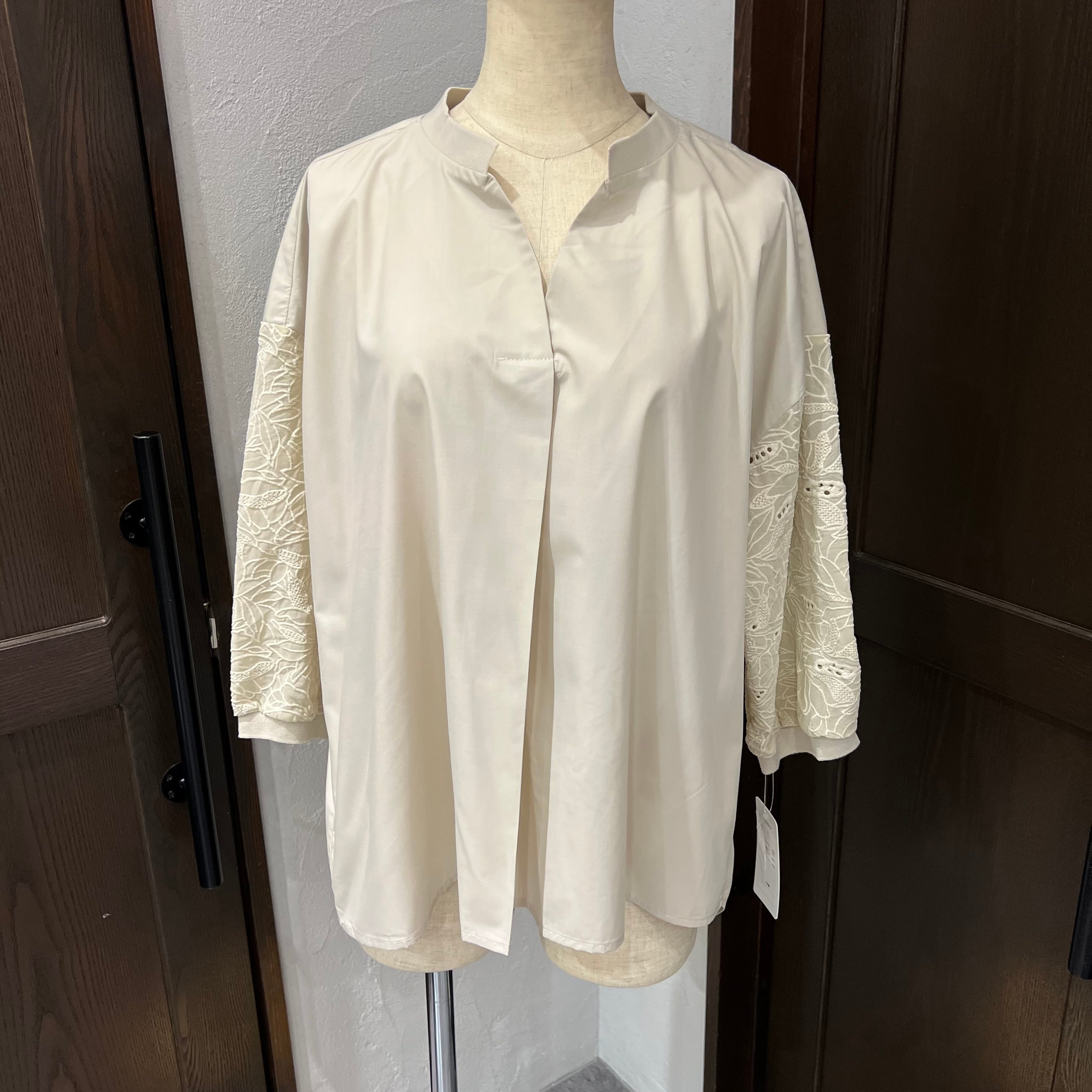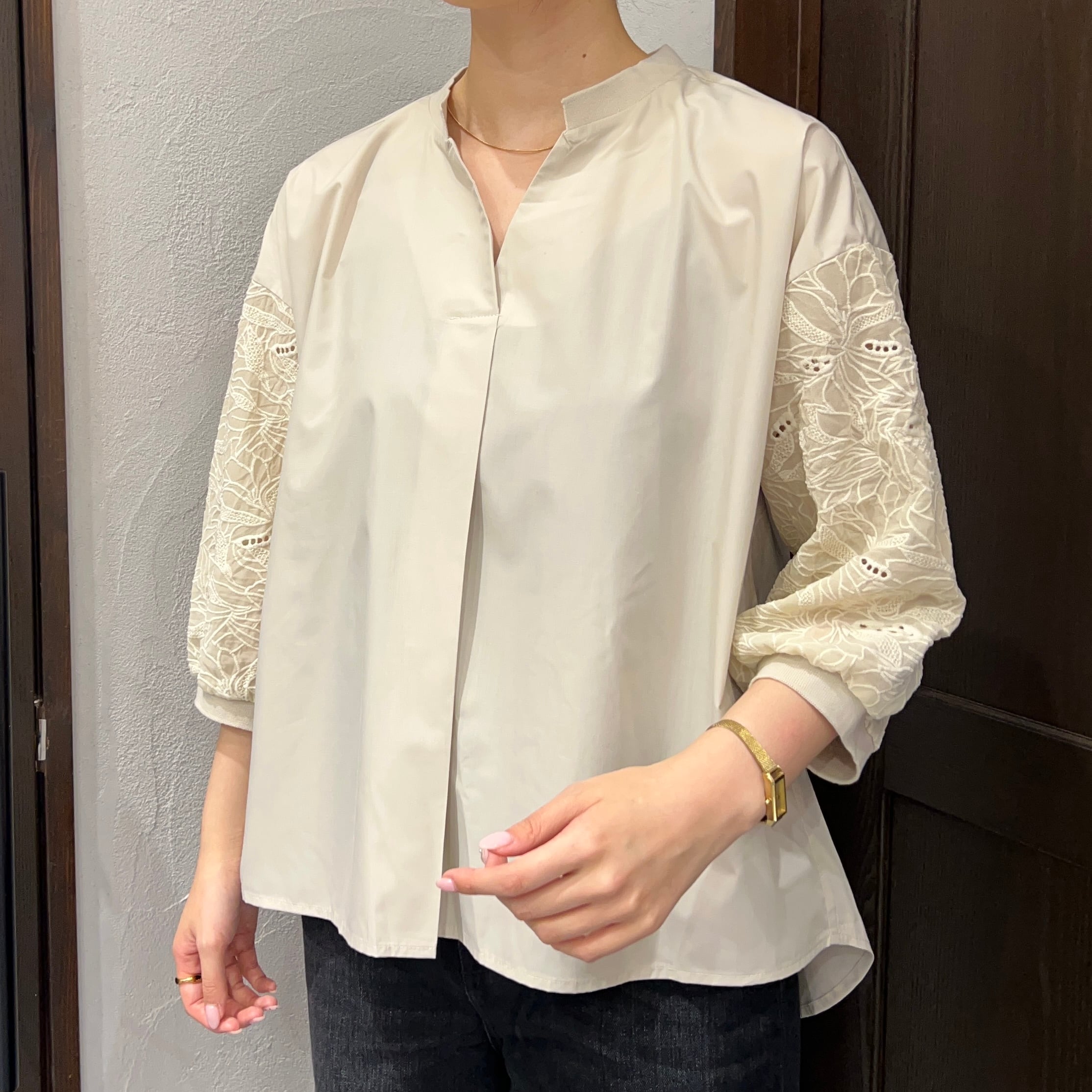 ゆったりとしたシルエットでリラックス感のあるデザイン。首元はスッキリとしたバンドカラーで、大人らしい抜け感を演出します。フロントにはタックが入っており、自然なドレープが上品な印象に。最大のポイントは袖部分で、繊細なレース刺繍が施され、フェミニンなアクセントになっています。