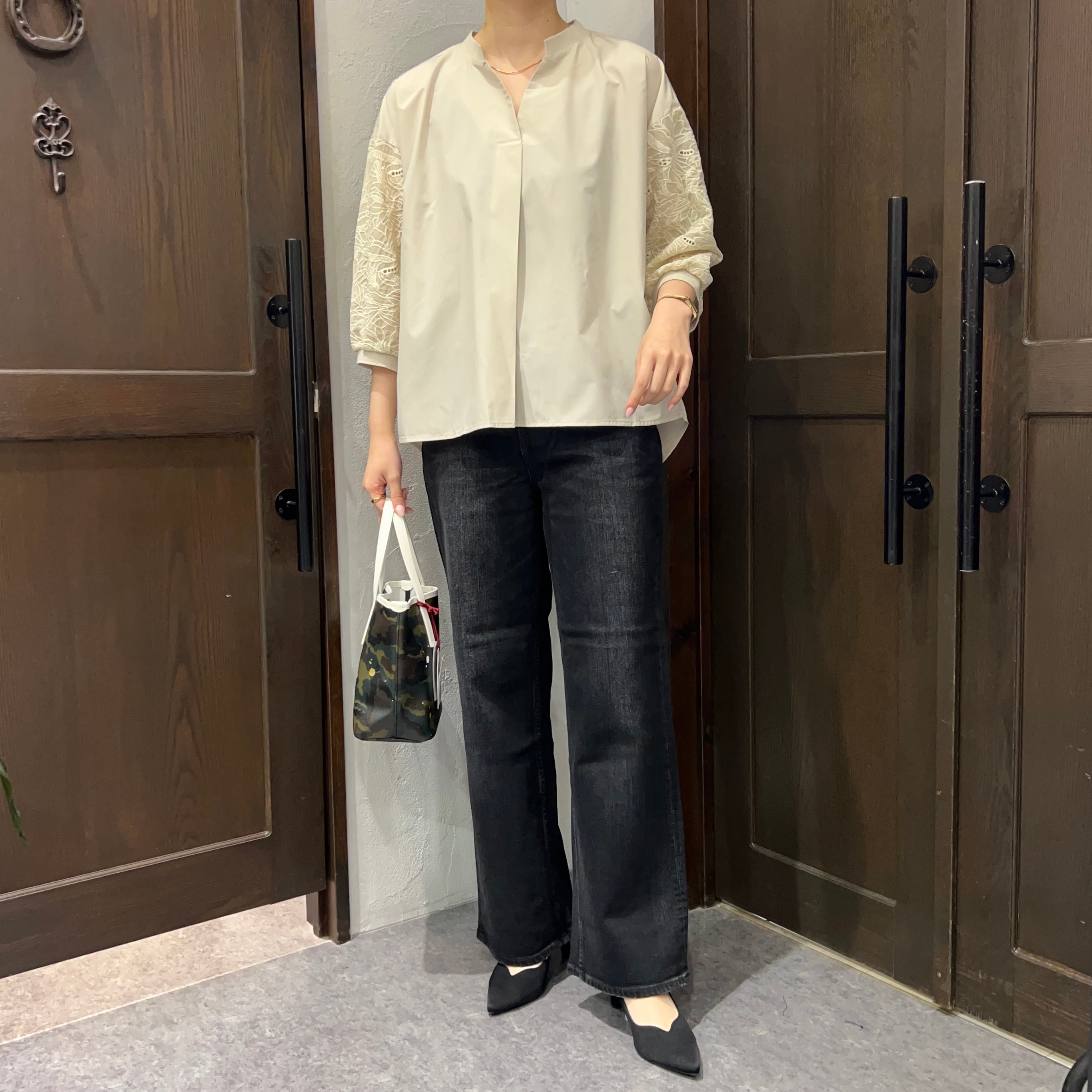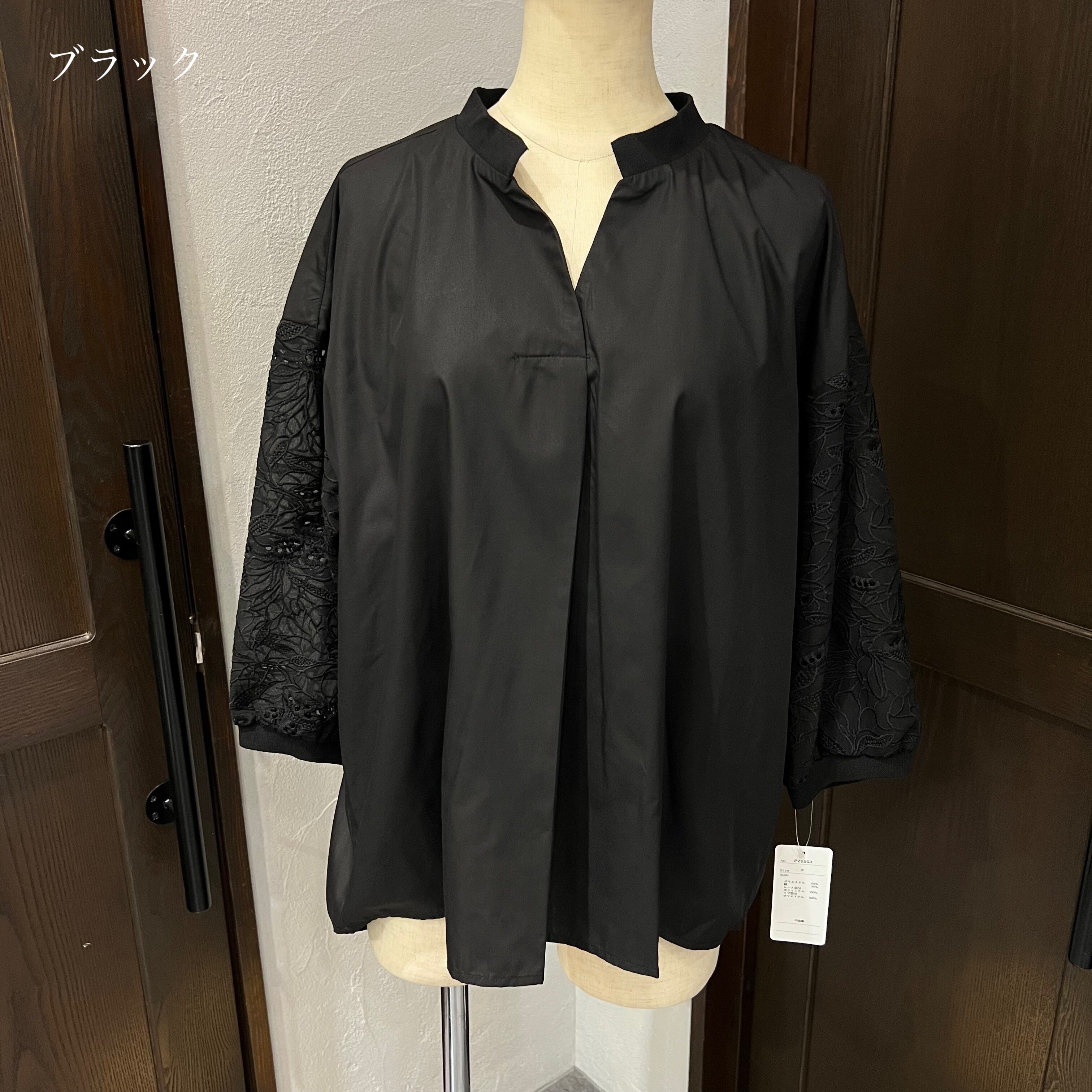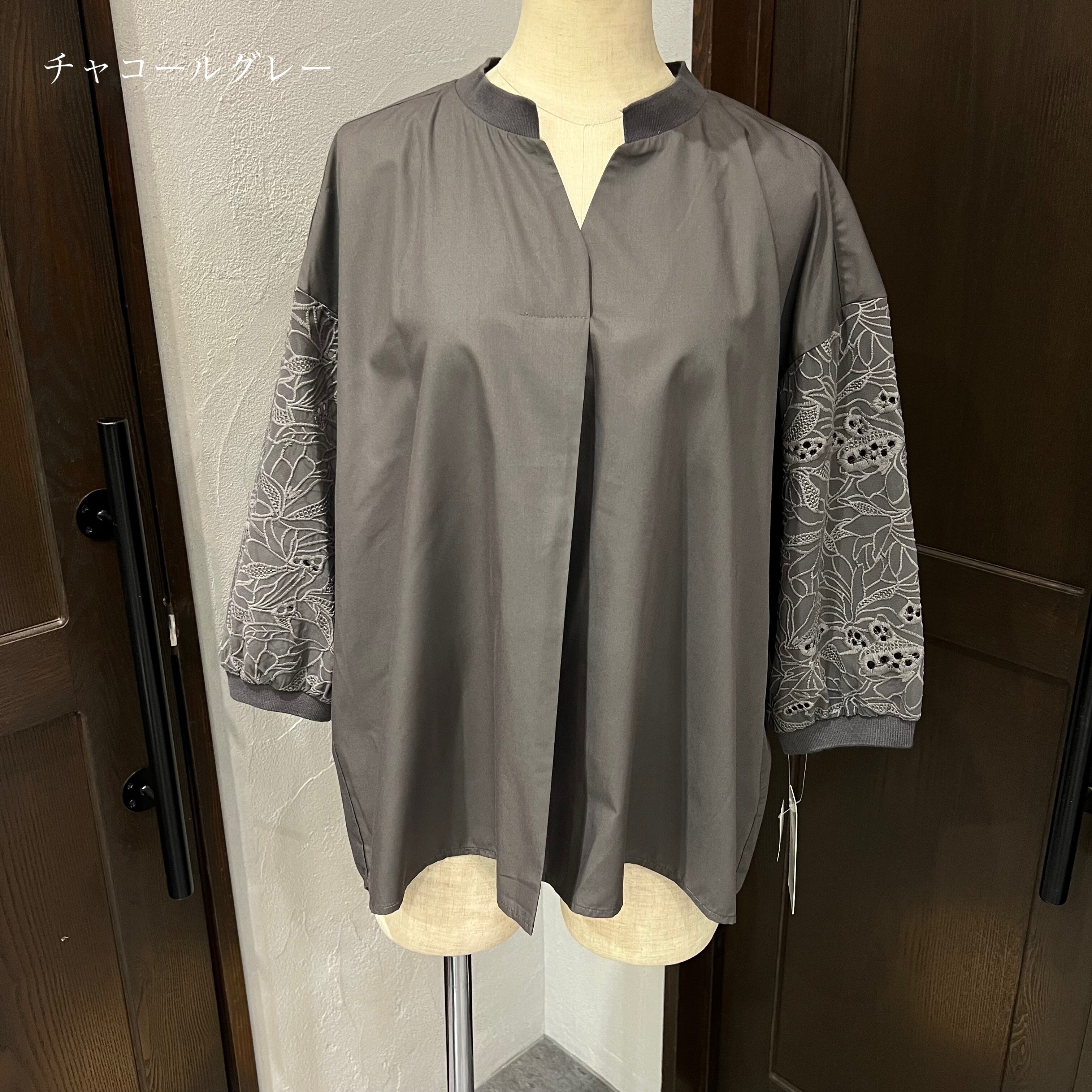 ゆったりとしたシルエットでリラックス感のあるデザイン。首元はスッキリとしたバンドカラーで、大人らしい抜け感を演出します。フロントにはタックが入っており、自然なドレープが上品な印象に。最大のポイントは袖部分で、繊細なレース刺繍が施され、フェミニンなアクセントになっています。