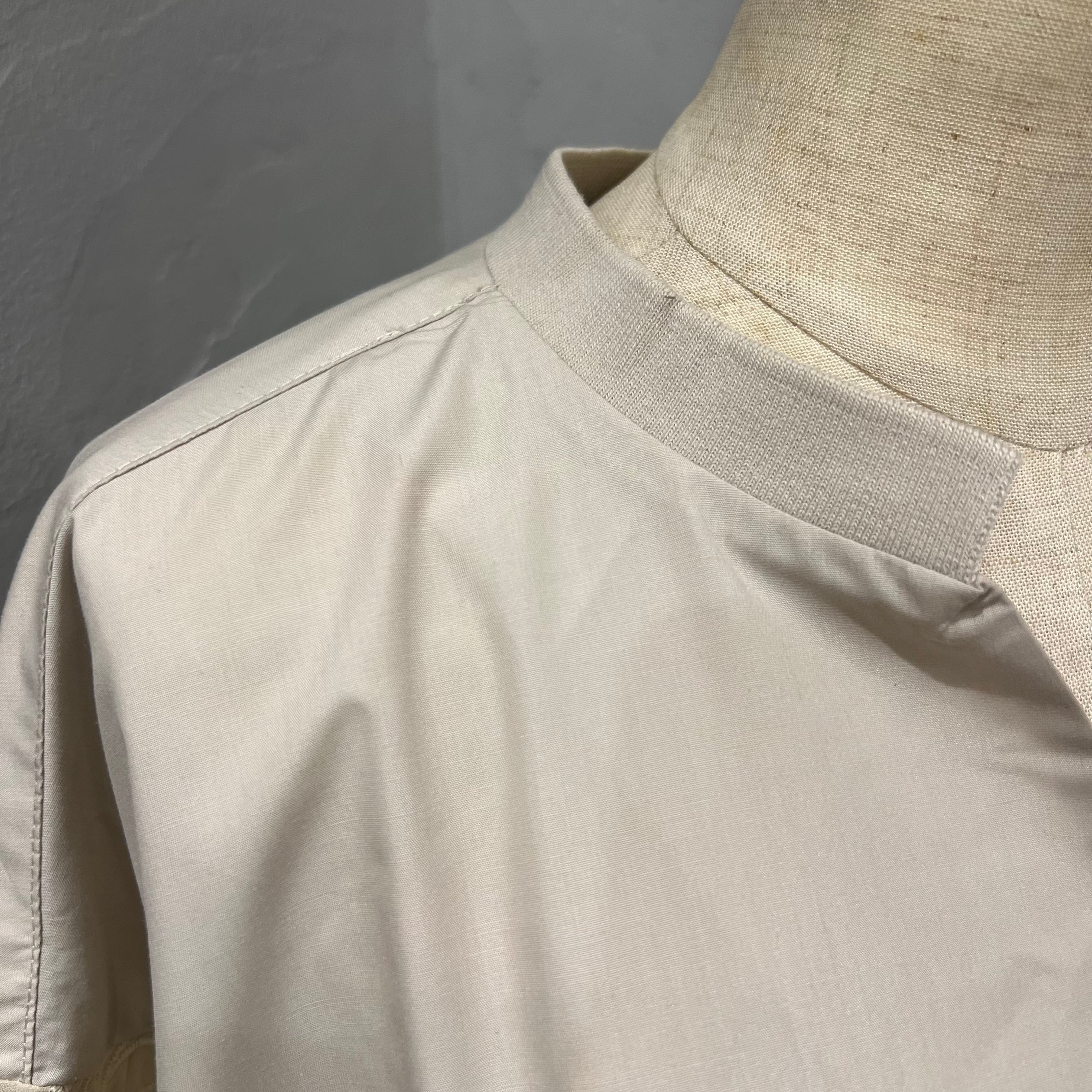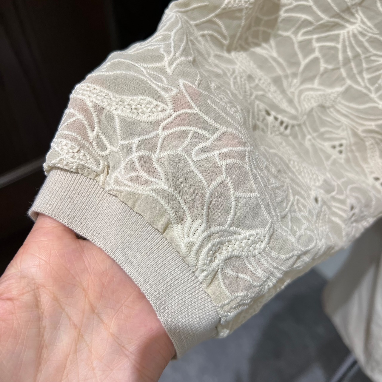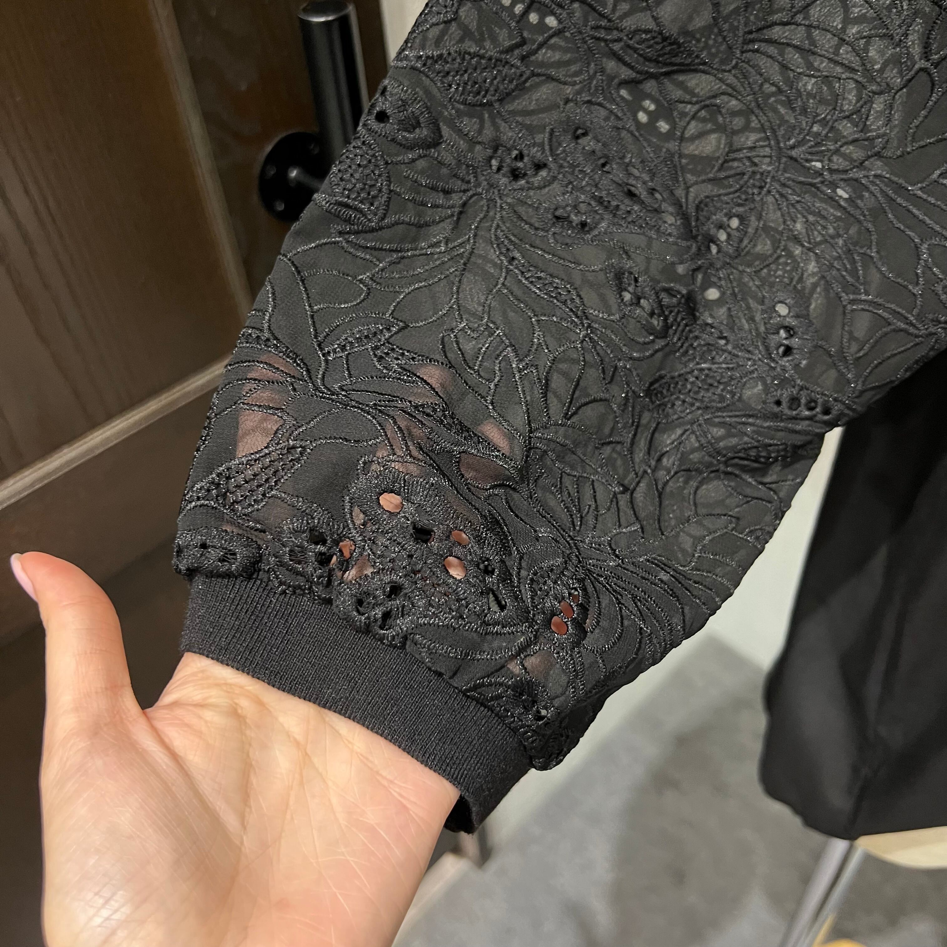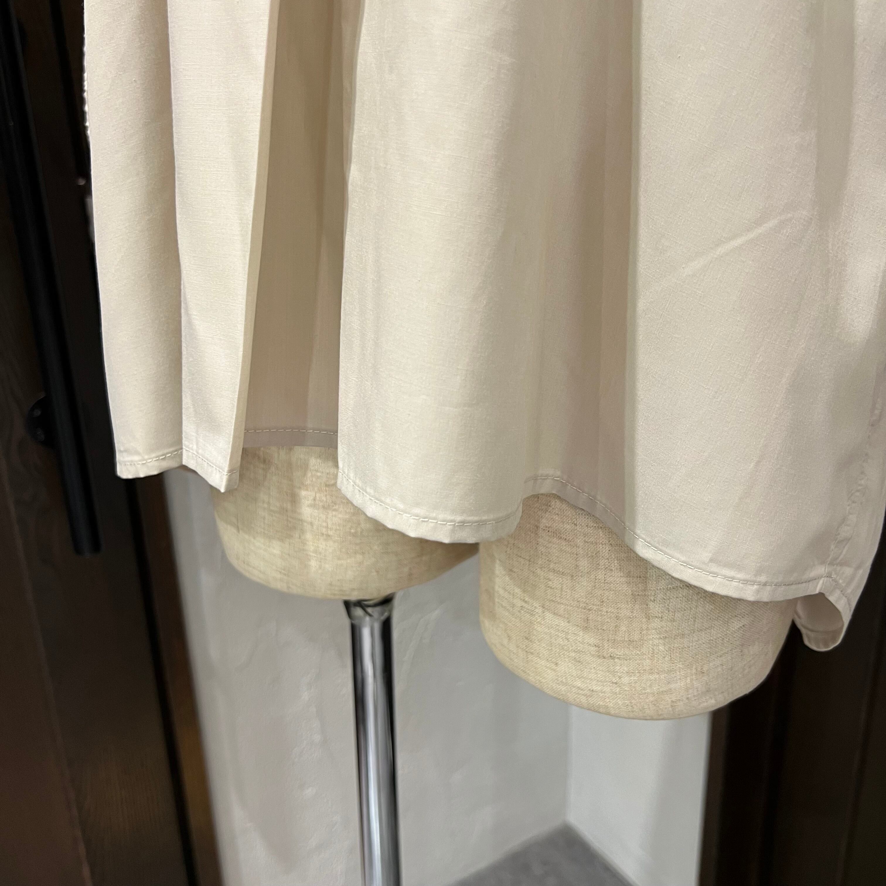 ゆったりとしたシルエットでリラックス感のあるデザイン。首元はスッキリとしたバンドカラーで、大人らしい抜け感を演出します。フロントにはタックが入っており、自然なドレープが上品な印象に。最大のポイントは袖部分で、繊細なレース刺繍が施され、フェミニンなアクセントになっています。