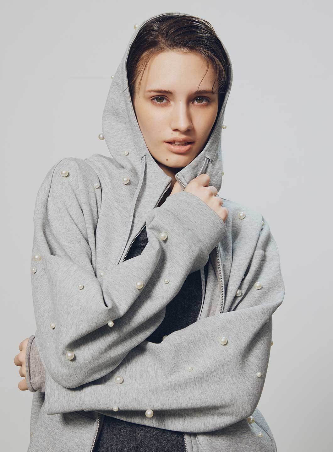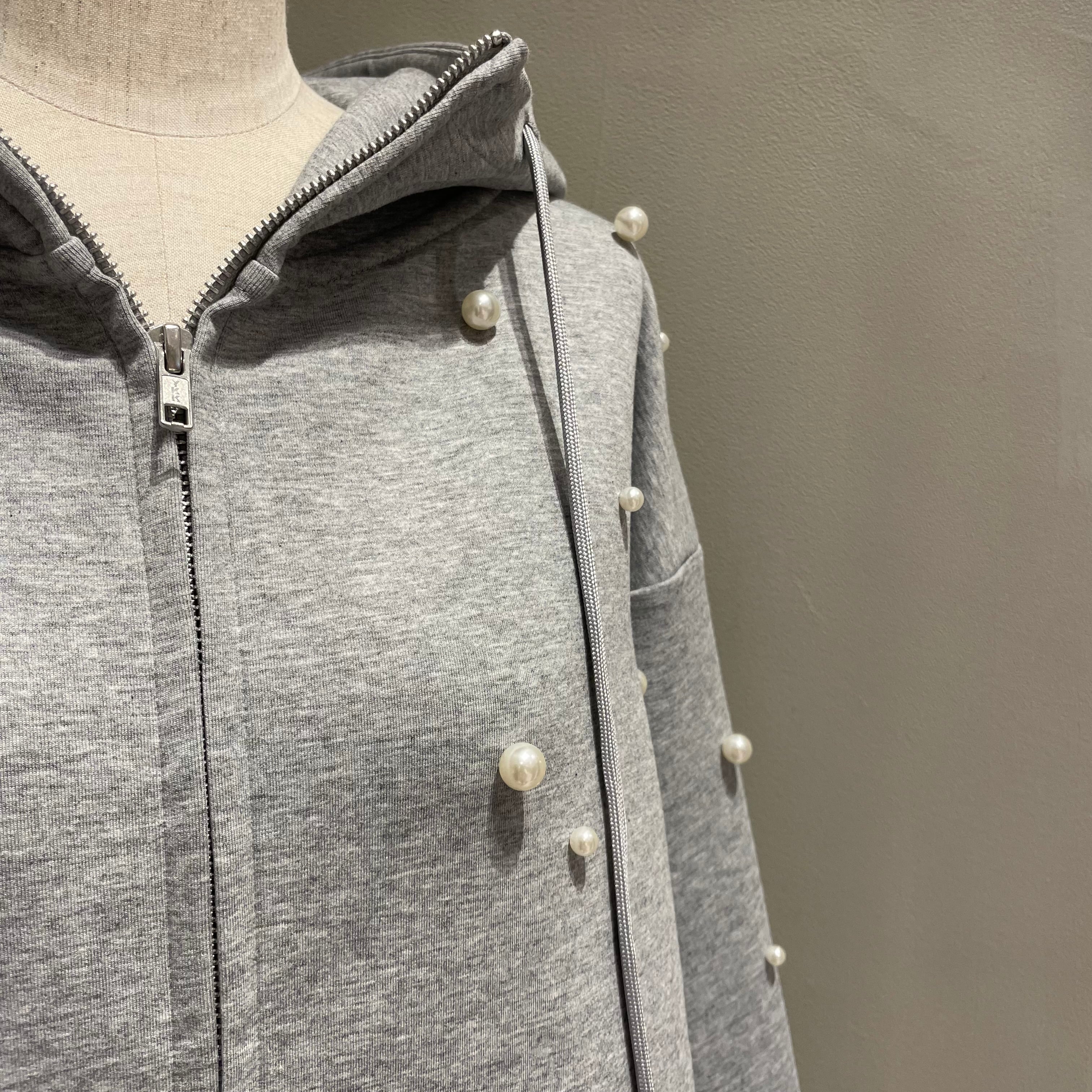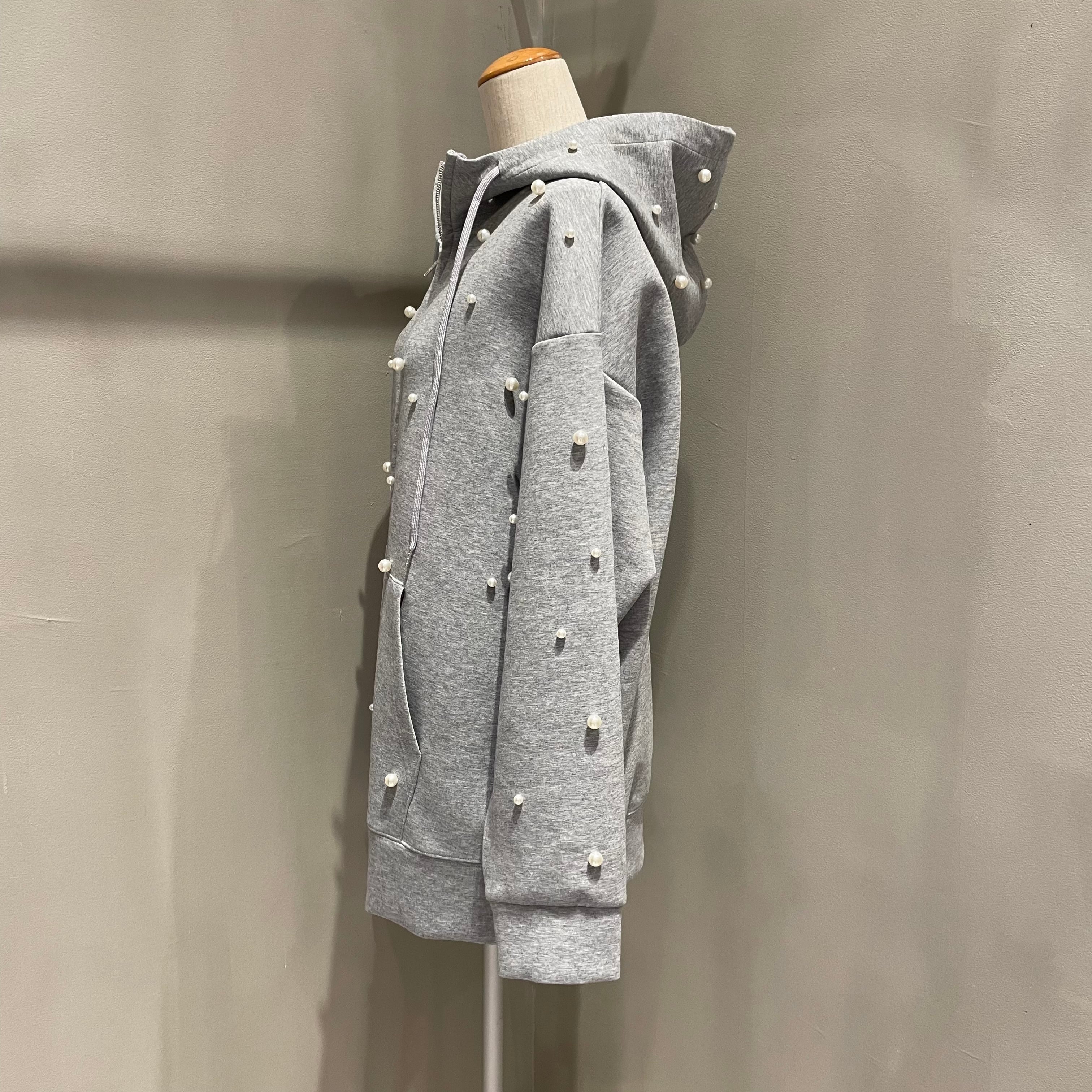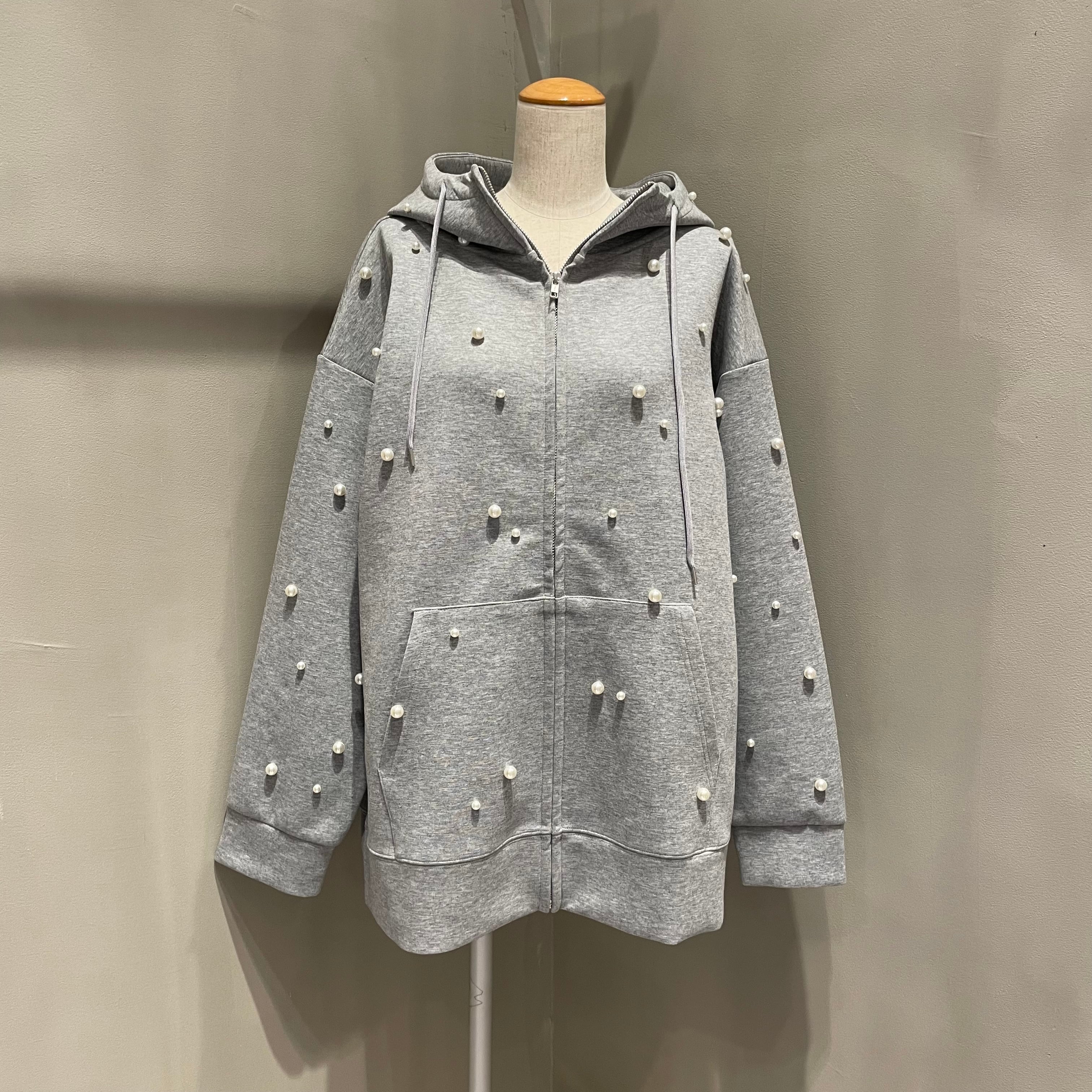 大小のパールがランダムにちりばめられた、1枚で華やかなフロントジップのフーディです。