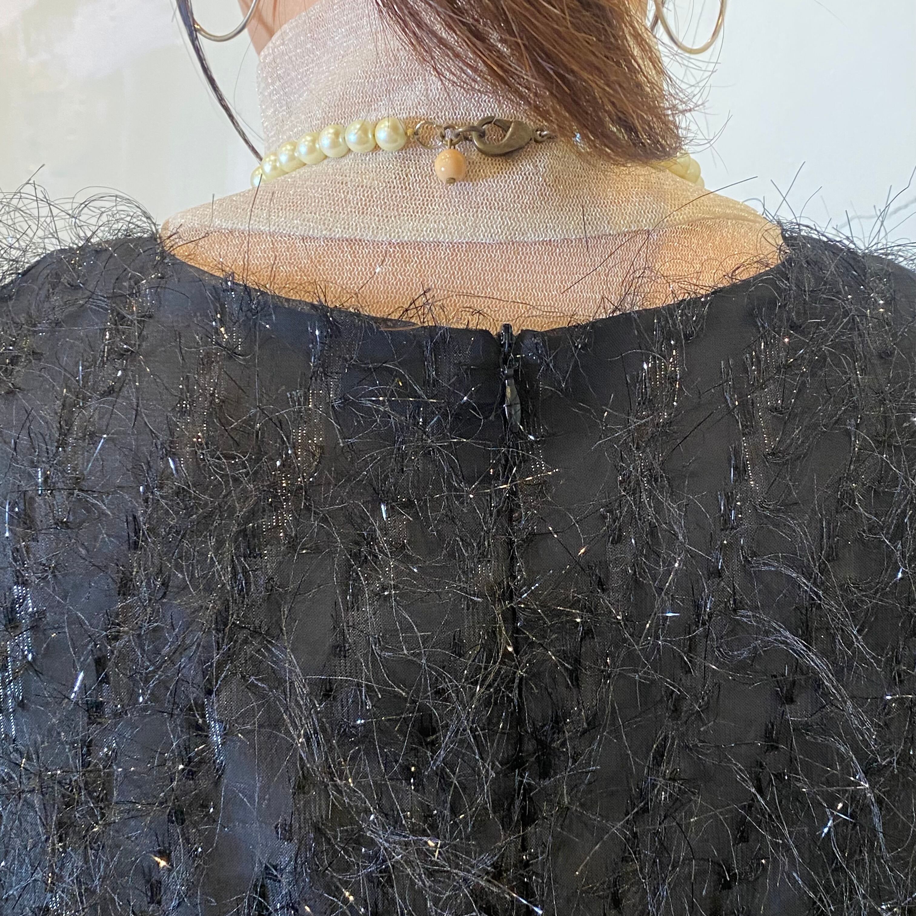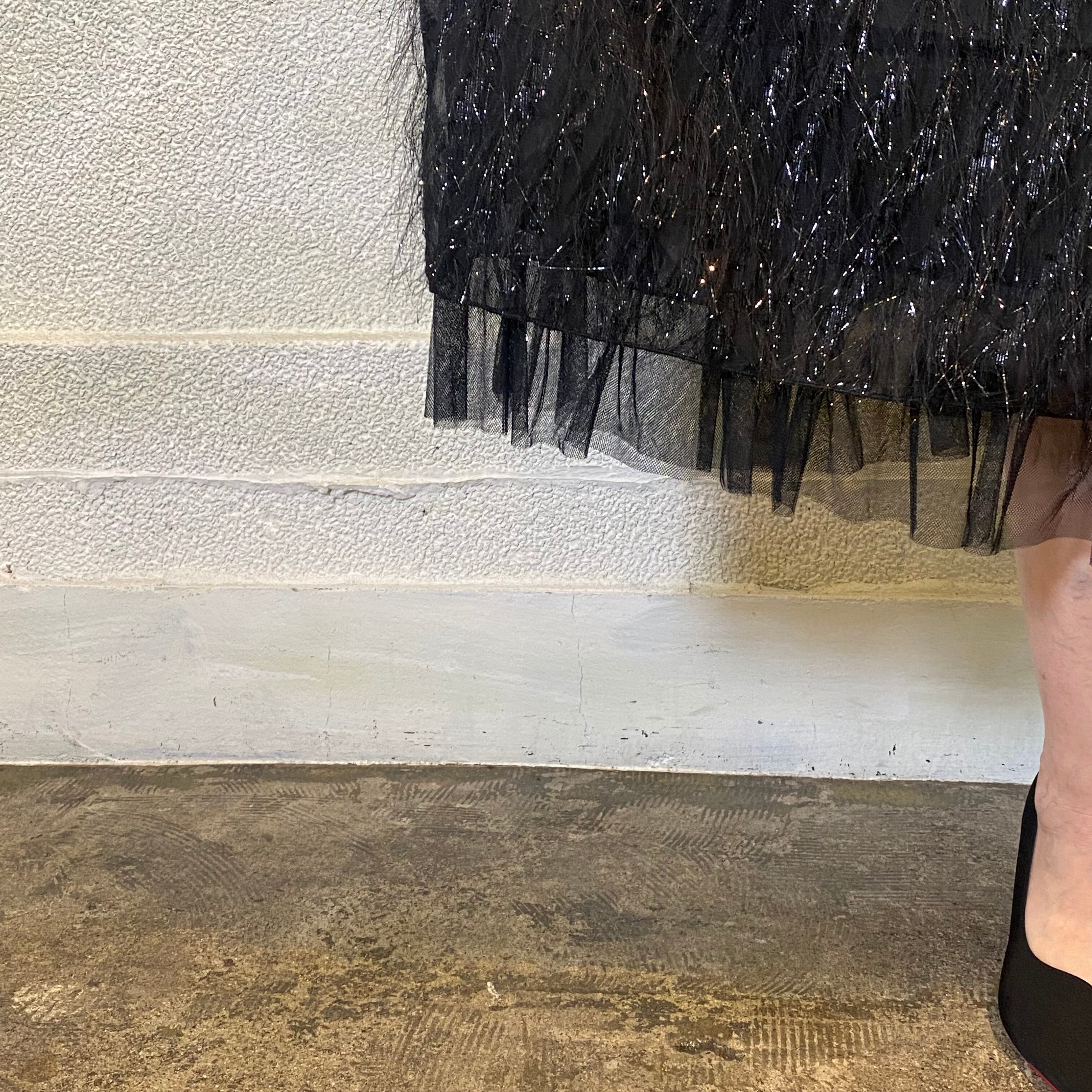 シンプルながらも目を引くキラキラの装飾が施されたデザインで、特別な日のコーディネートに華を添えます。裾のチュールフリルが動くたびにふわりと広がり、視線を集めます