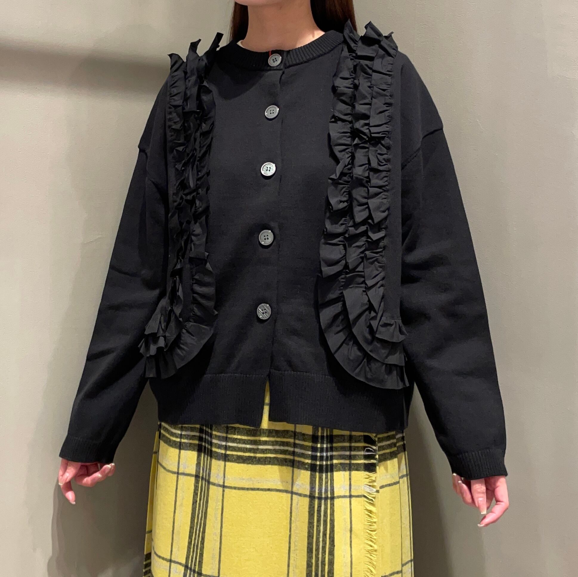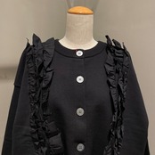ポリエステルを芯にし、その周りをハイツイストコットンで包み込んだ糸で編んだ編地に、切りっぱなしのフリルをたくさん付けたフリル2WAYカーディガン。