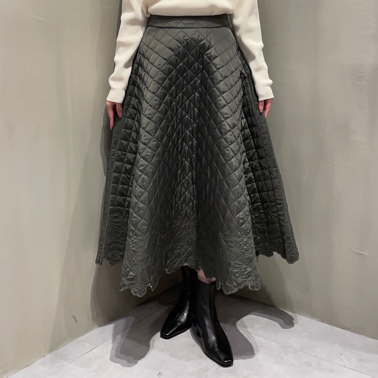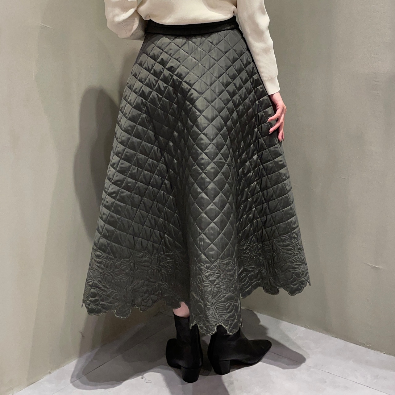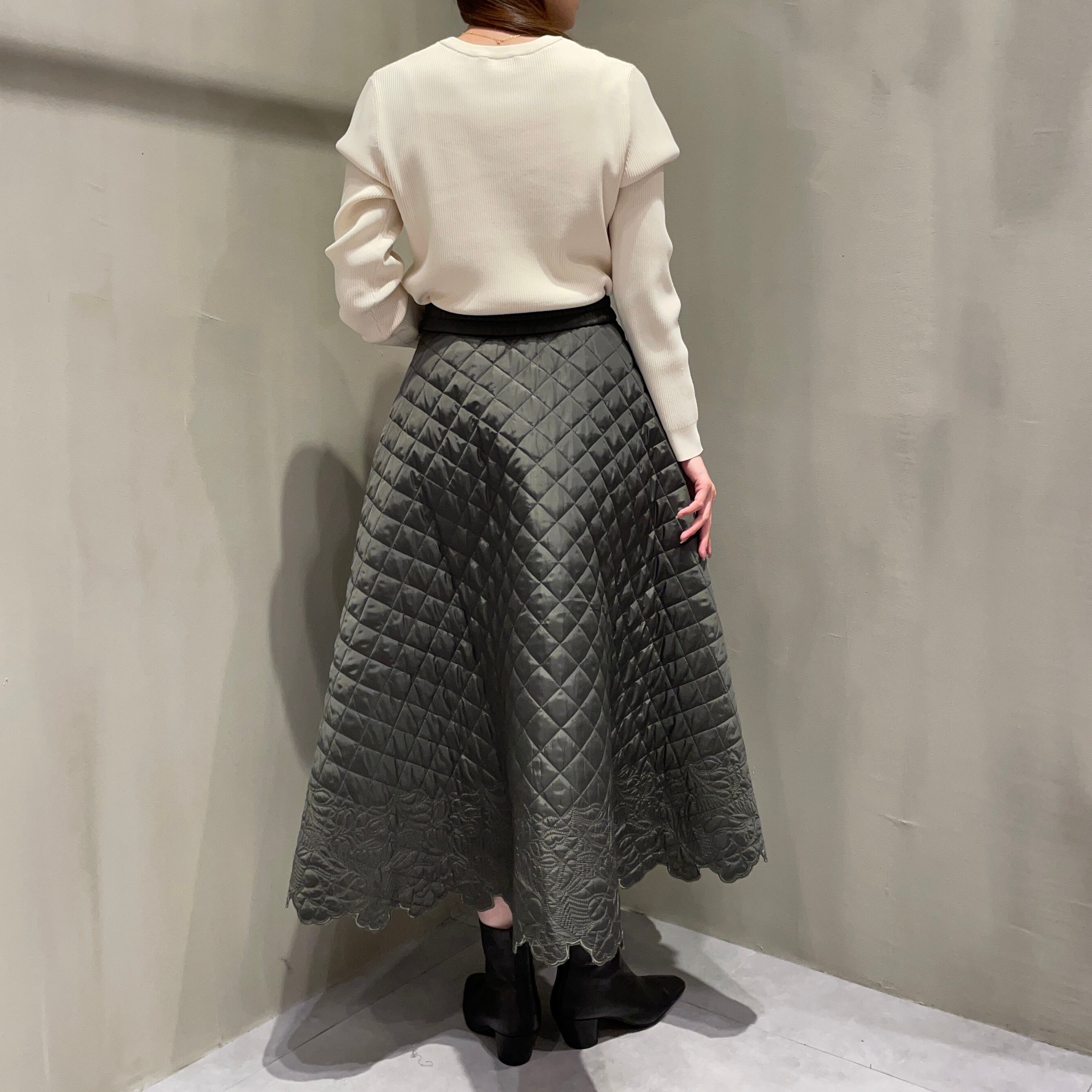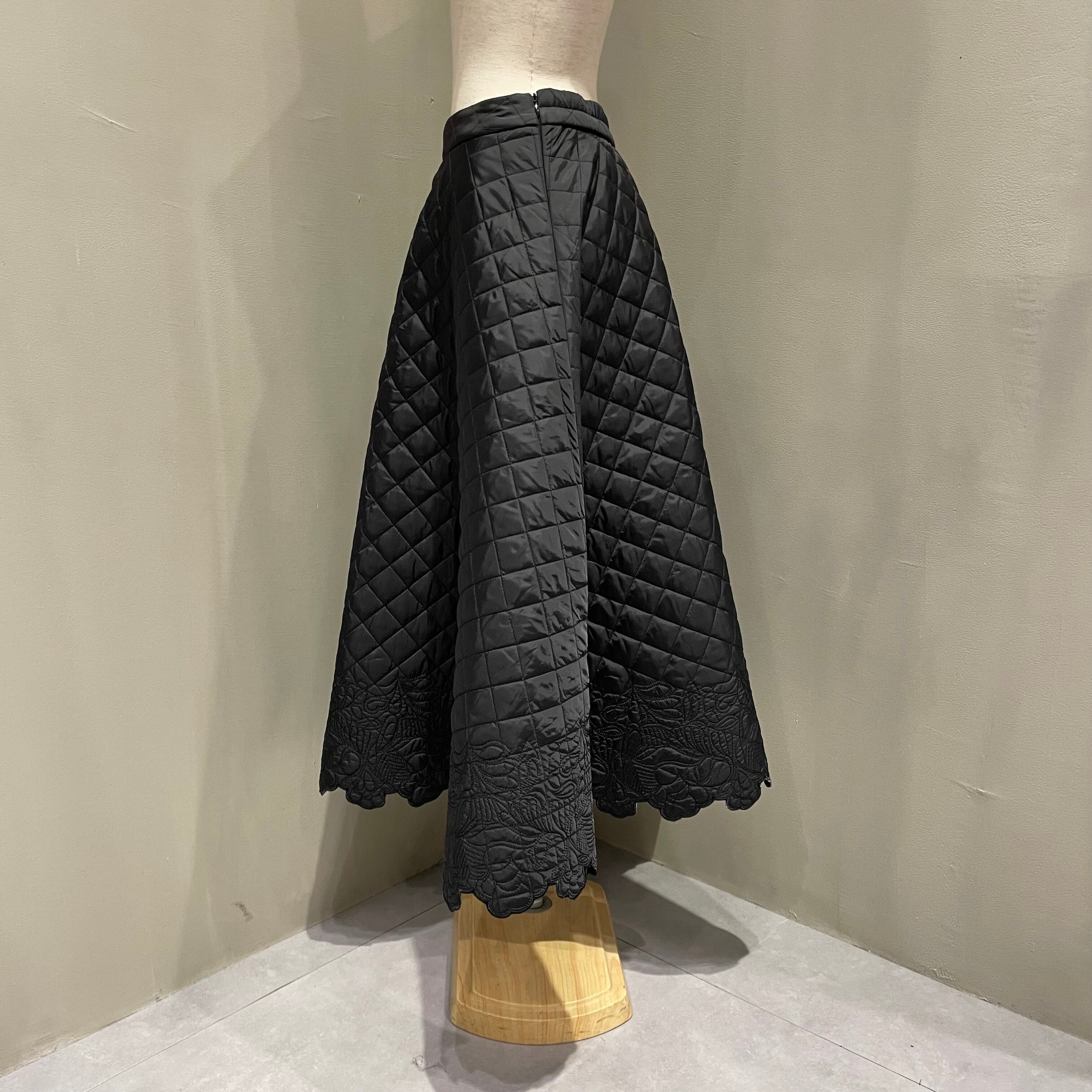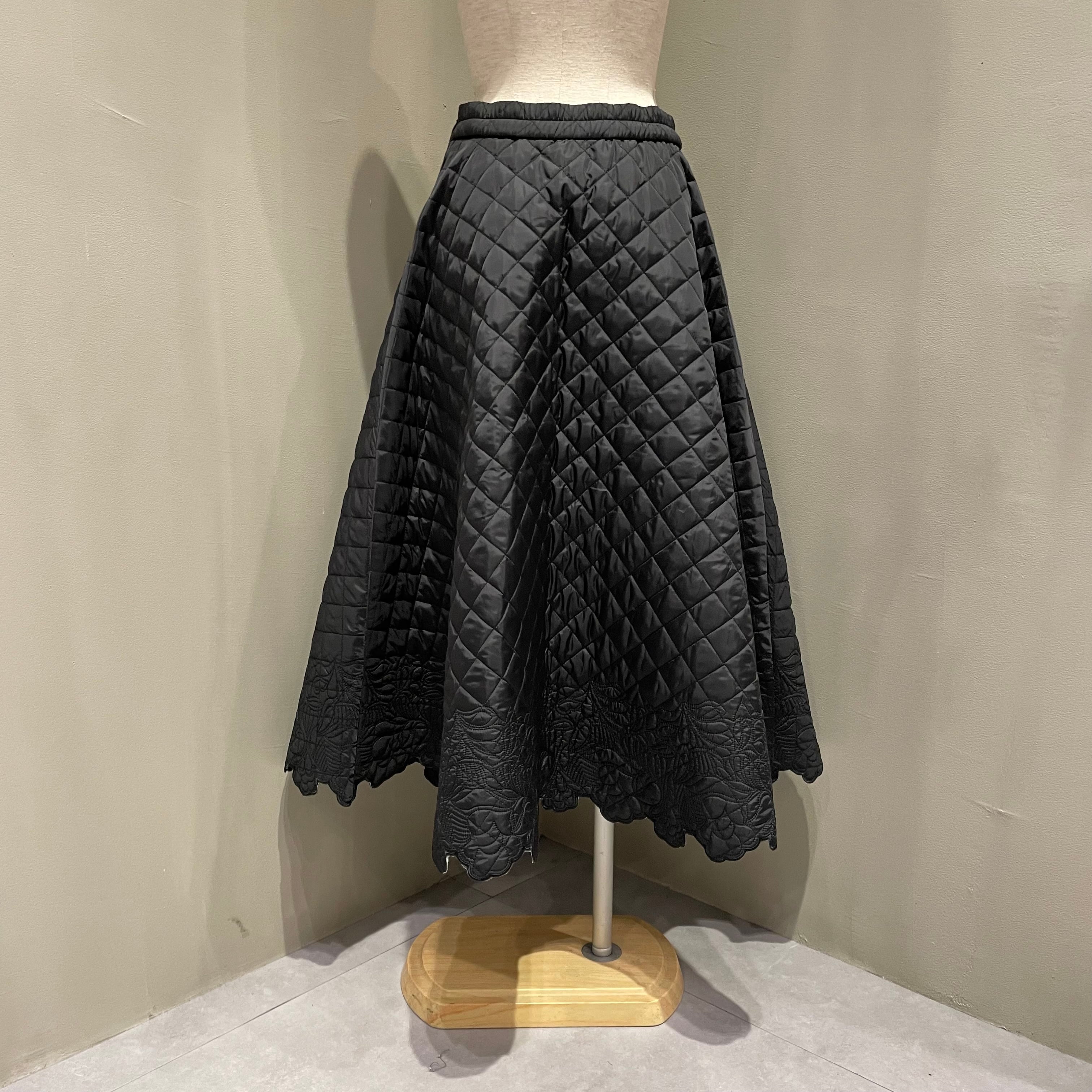 裾にあしらったスカラップ刺繍が女性らしいアクセントに。華やかでフェミニンな印象のキルティングフレアスカートです。