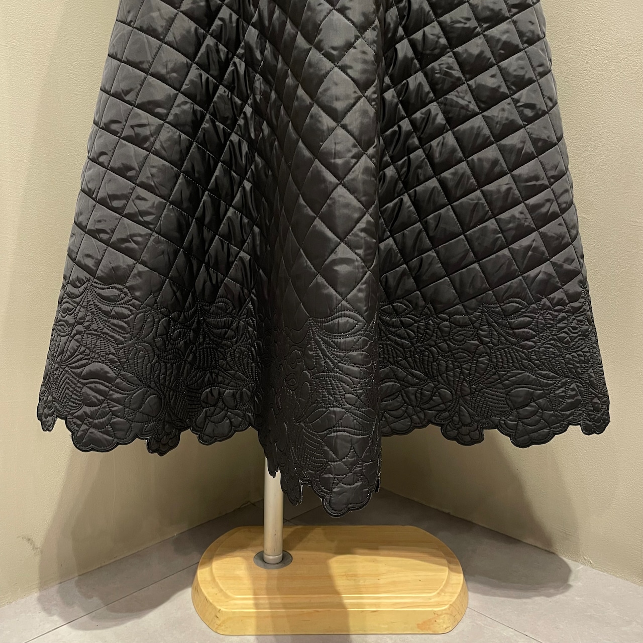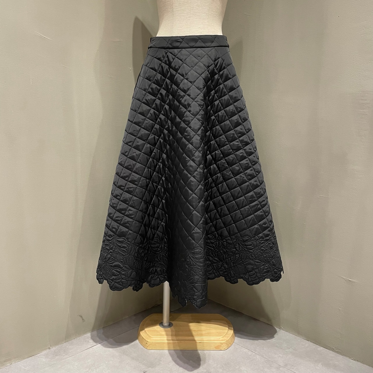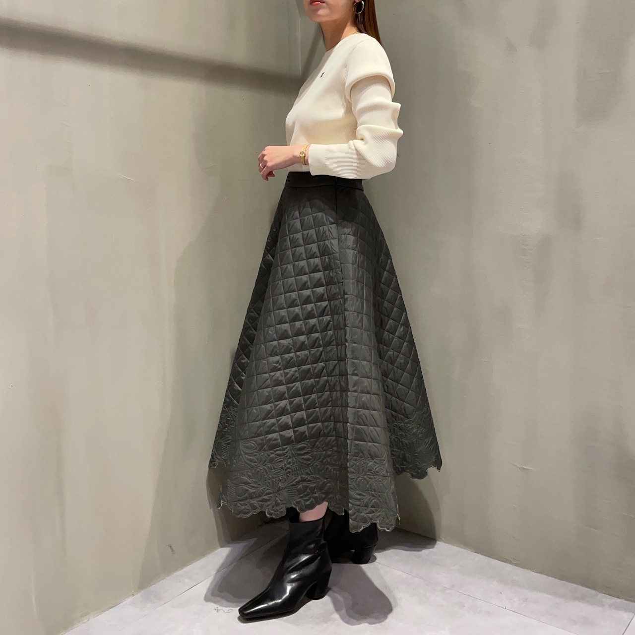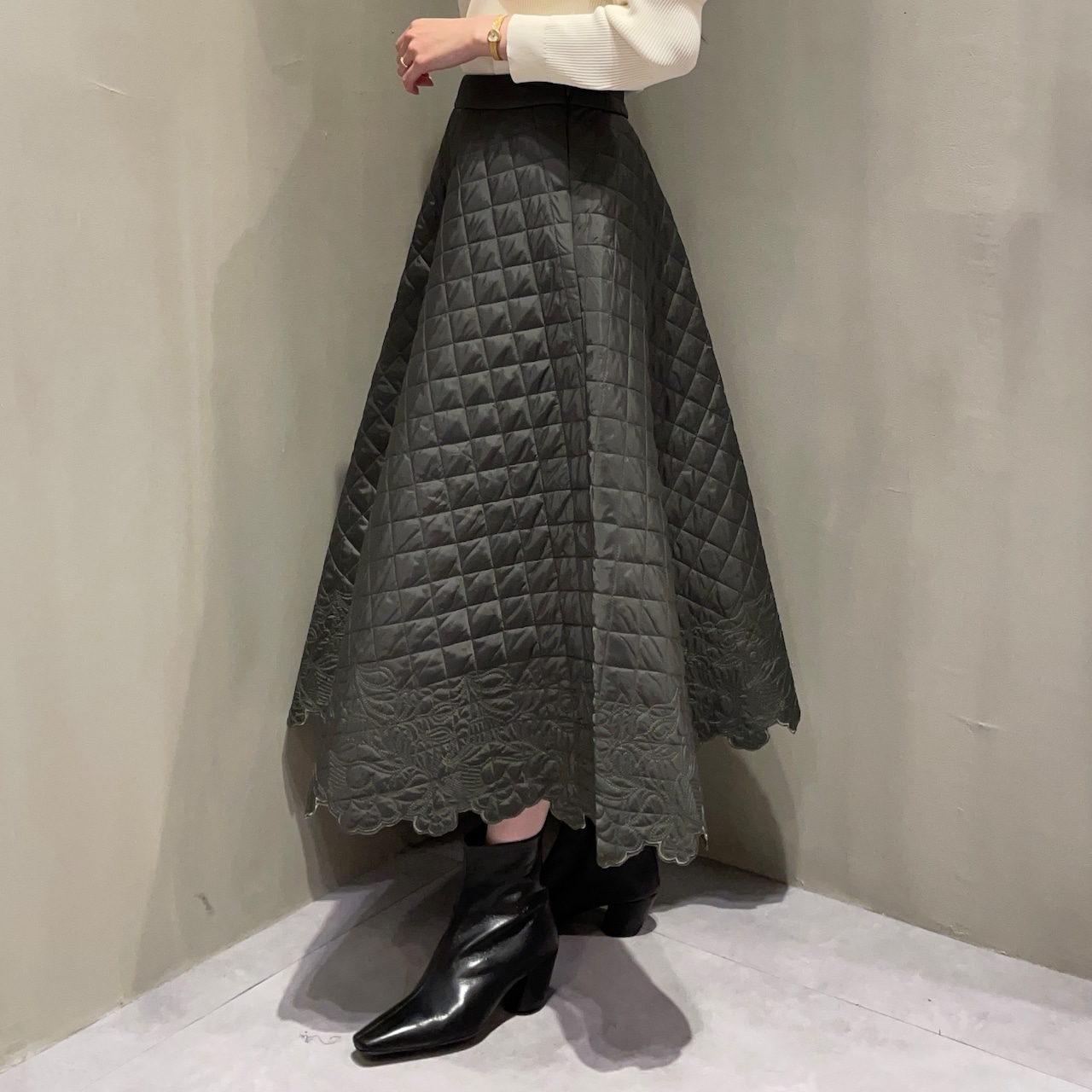 裾にあしらったスカラップ刺繍が女性らしいアクセントに。華やかでフェミニンな印象のキルティングフレアスカートです。