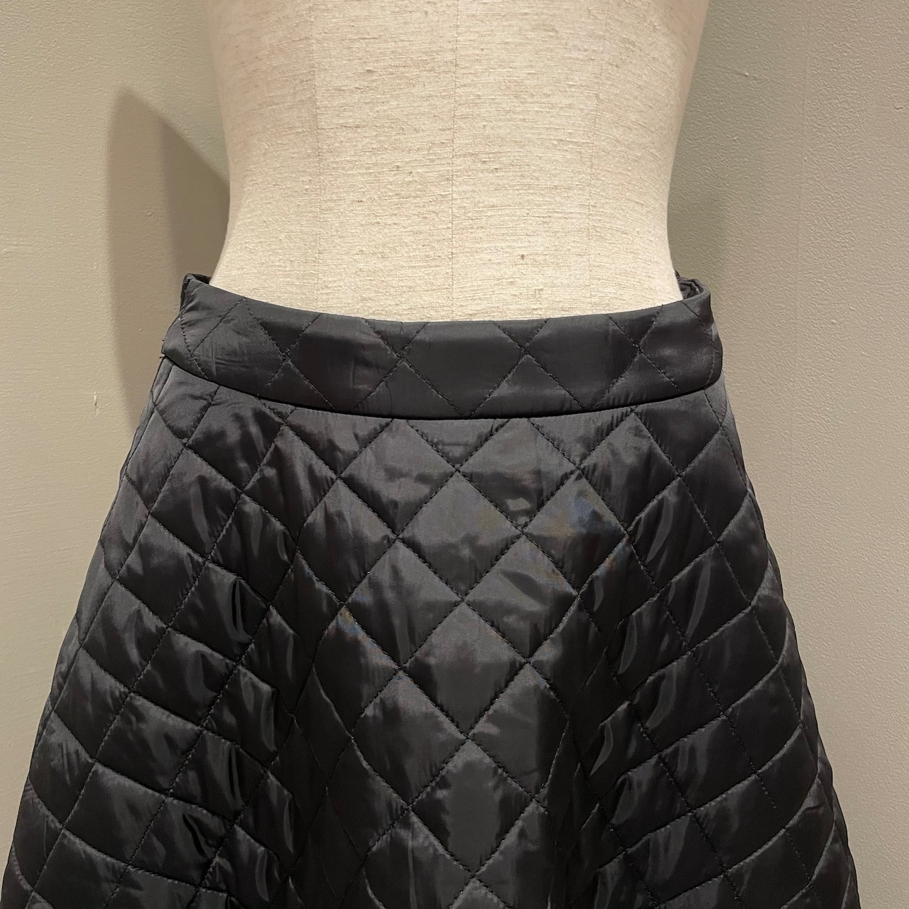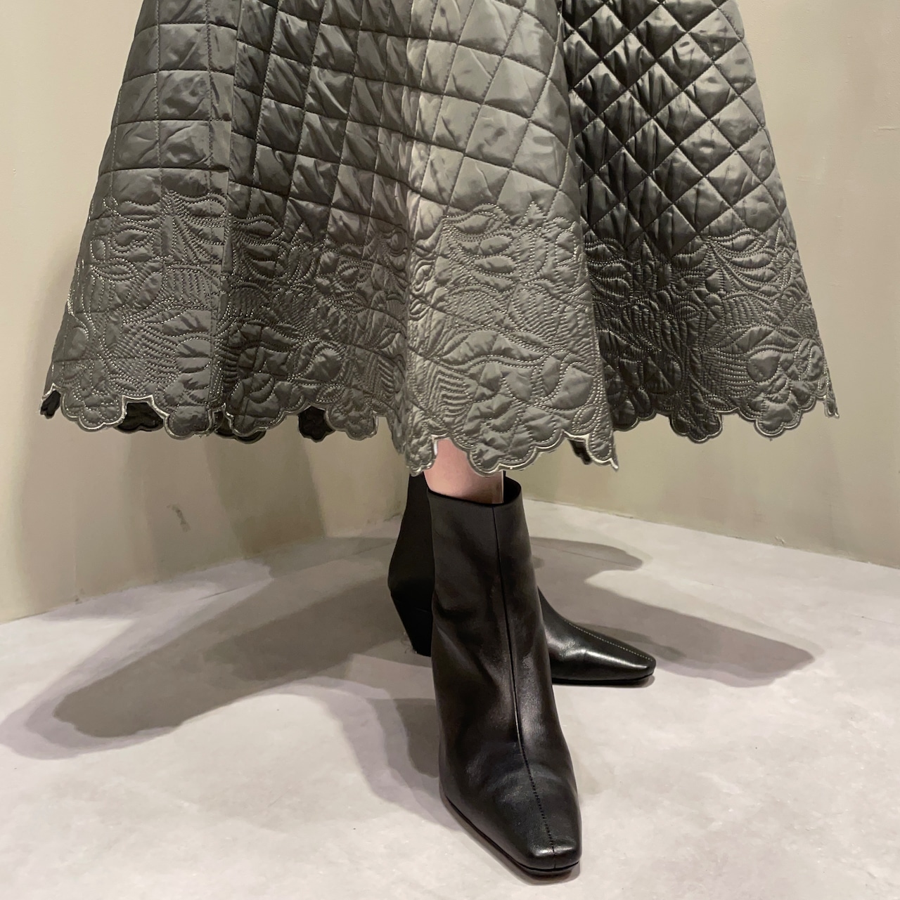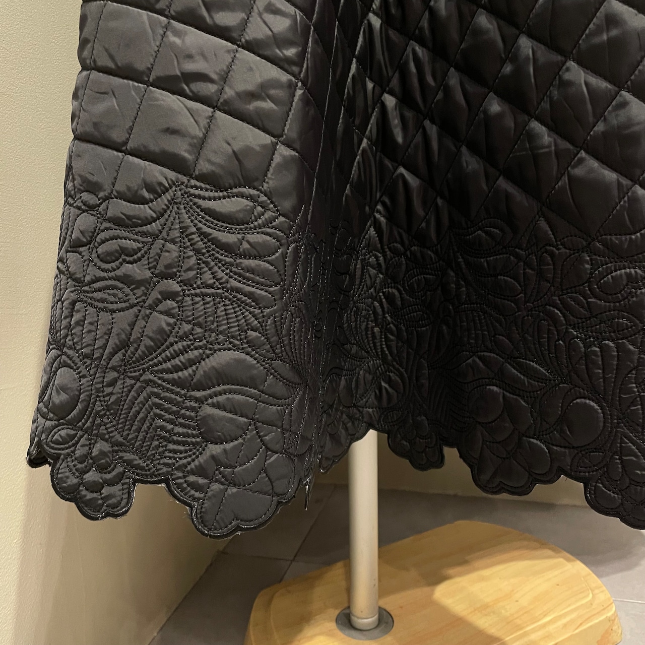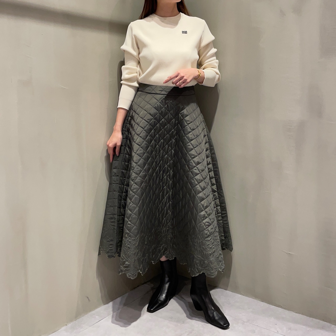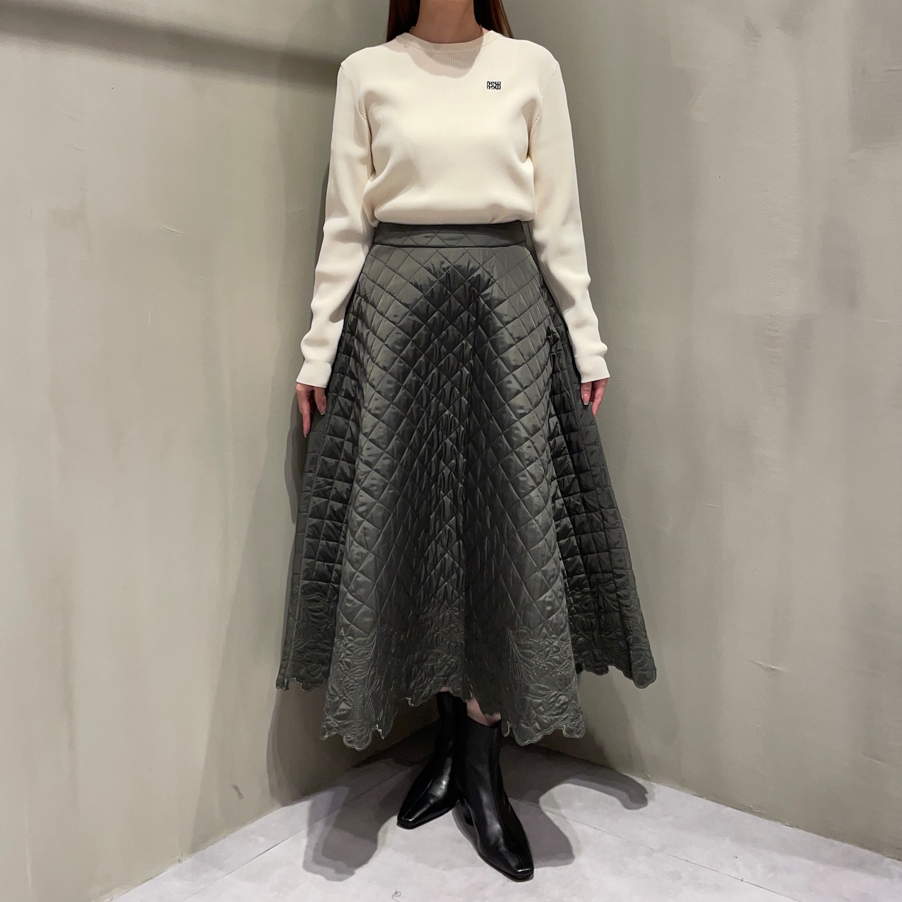 裾にあしらったスカラップ刺繍が女性らしいアクセントに。華やかでフェミニンな印象のキルティングフレアスカートです。
