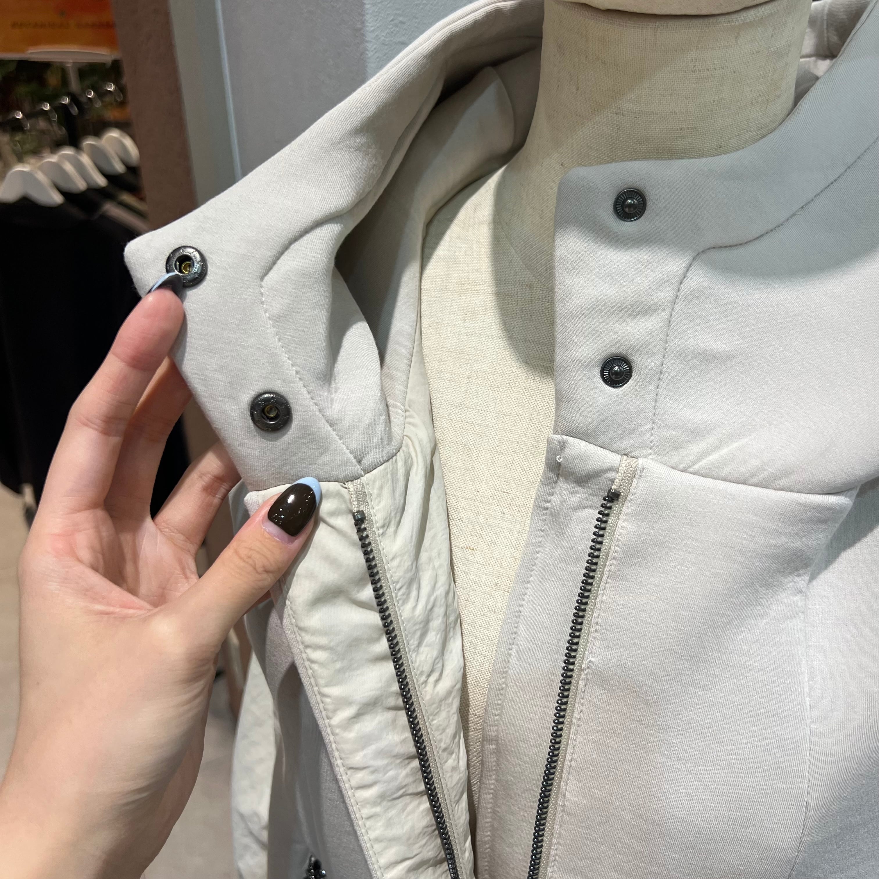ボンディング素材と布帛素材で切り替えた異素材デザインのベスト。