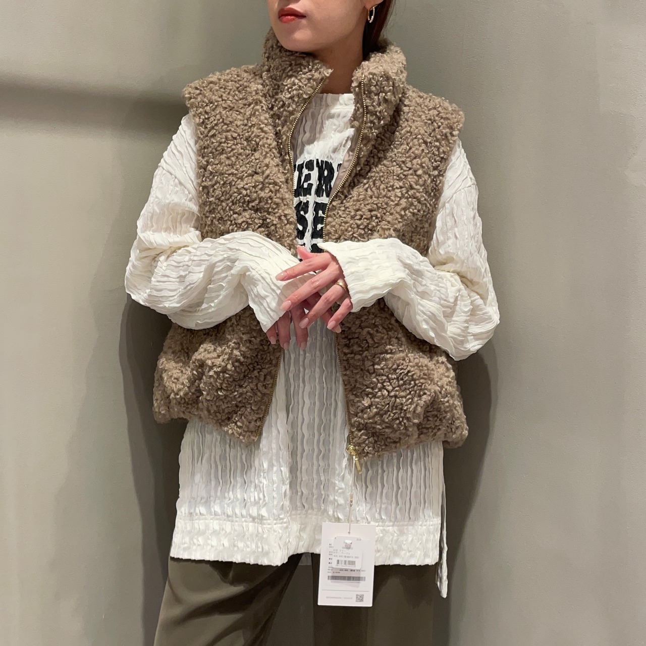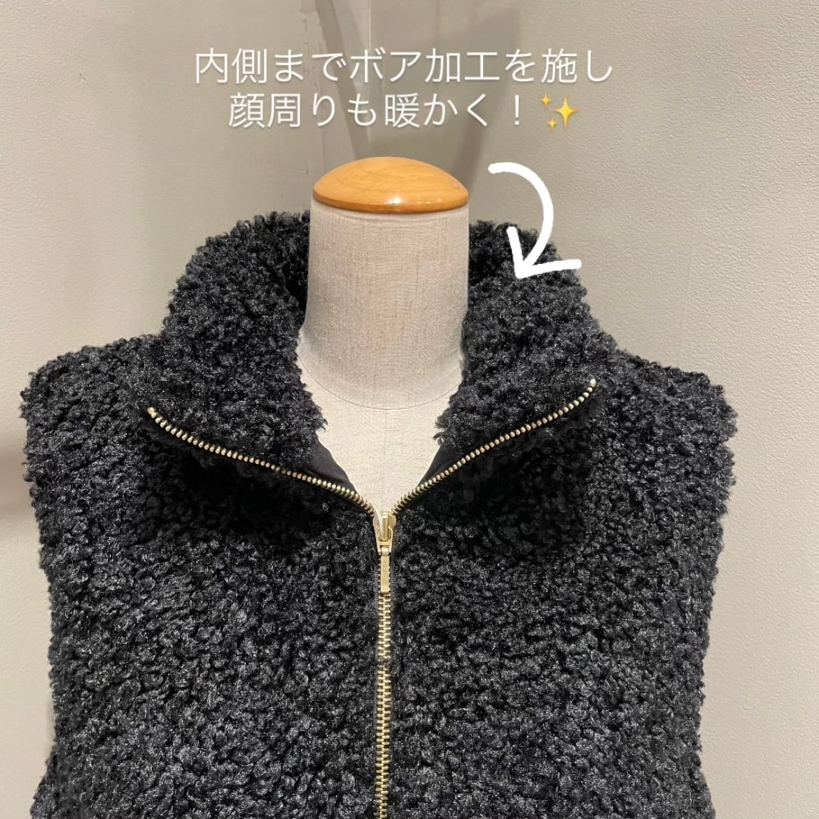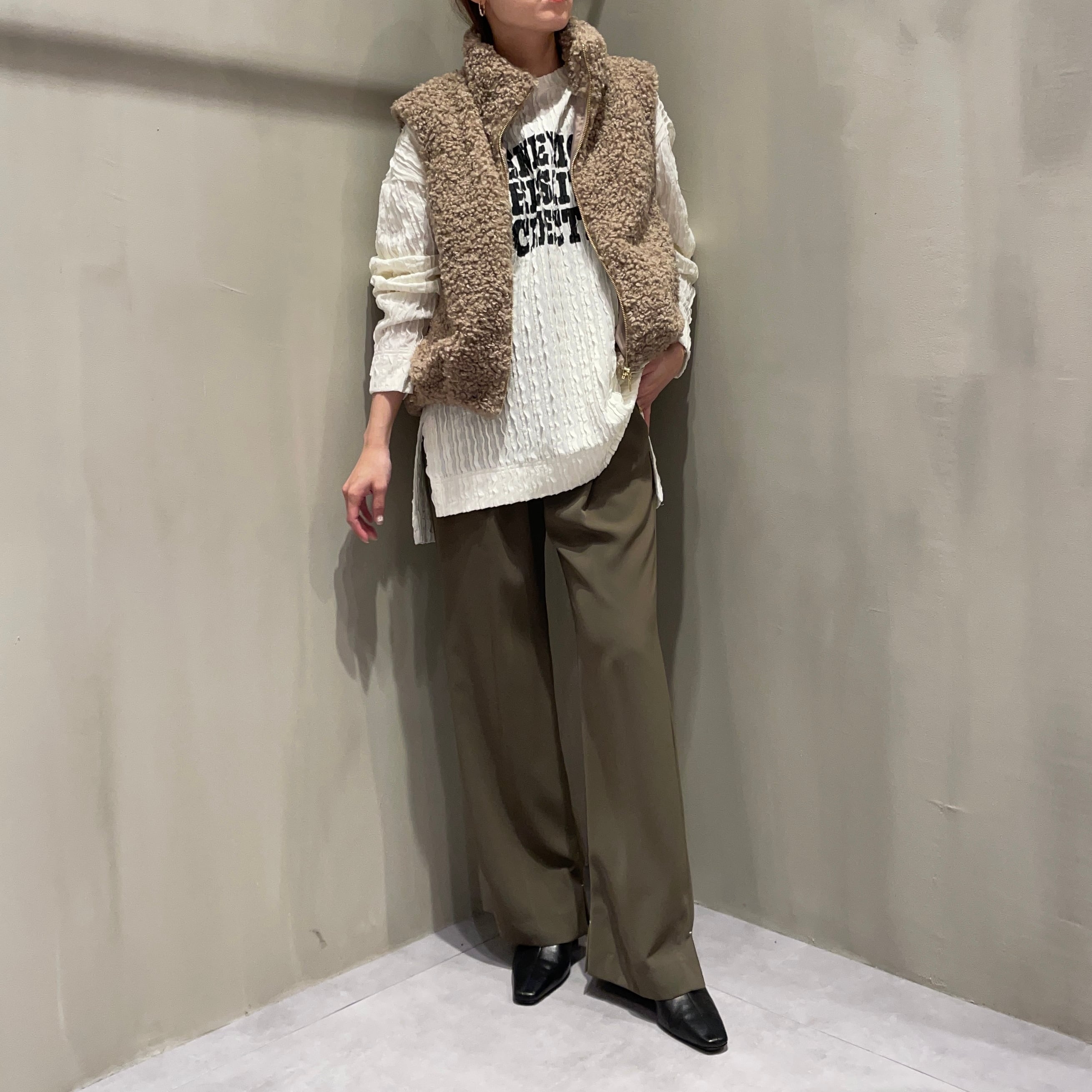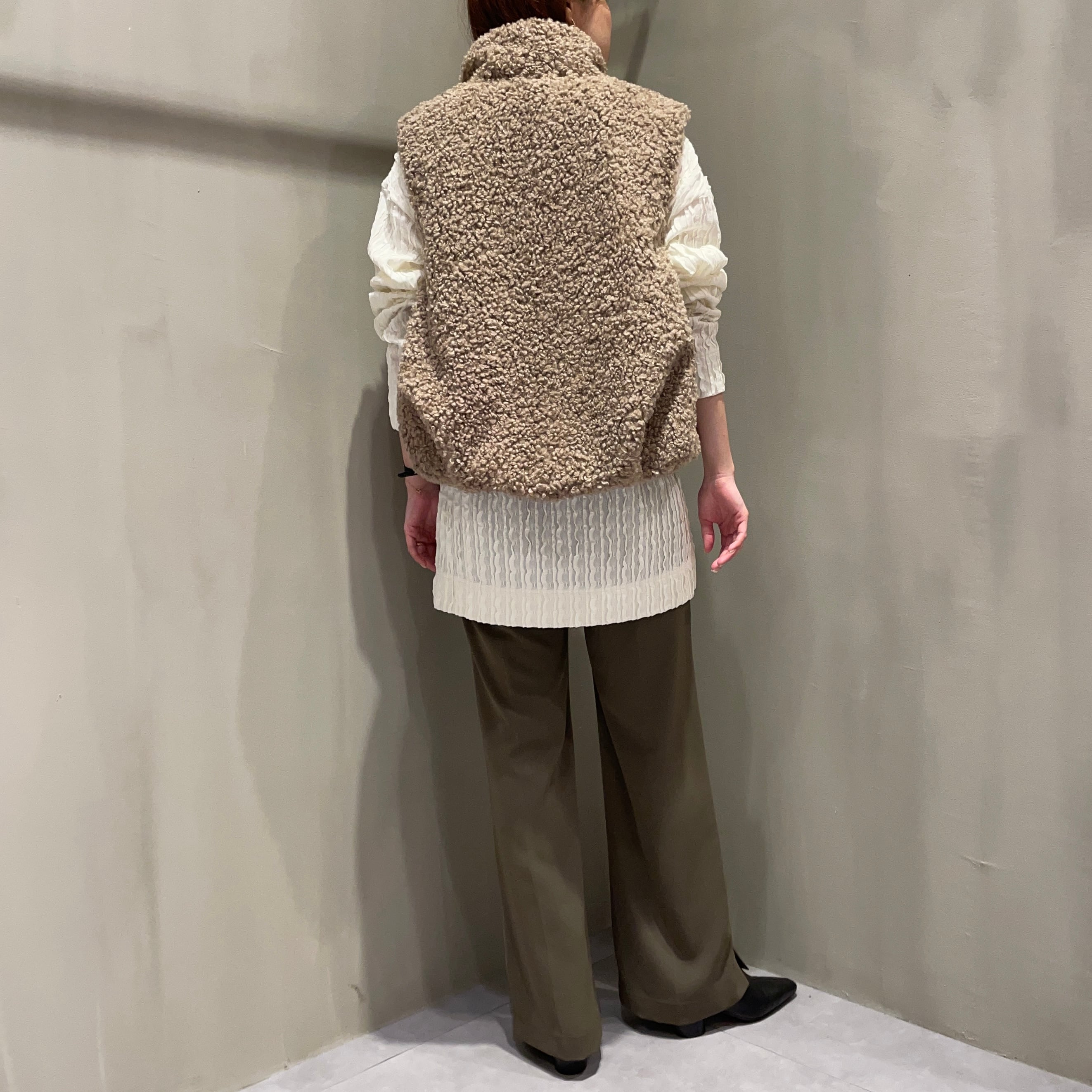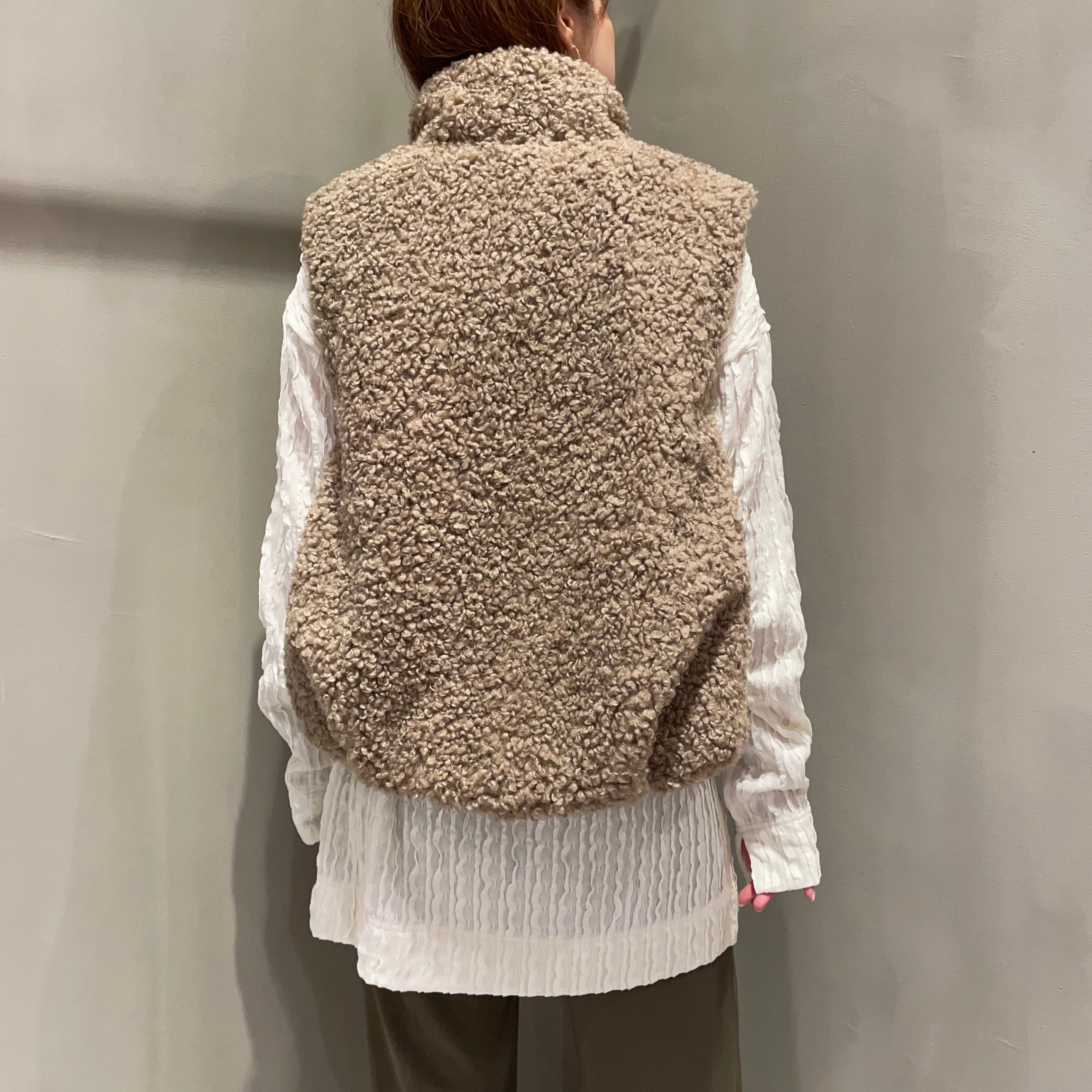 立体的なカールが特徴のプードルボア素材を使用することで、カジュアルながらも女性らしい印象に仕上げました。