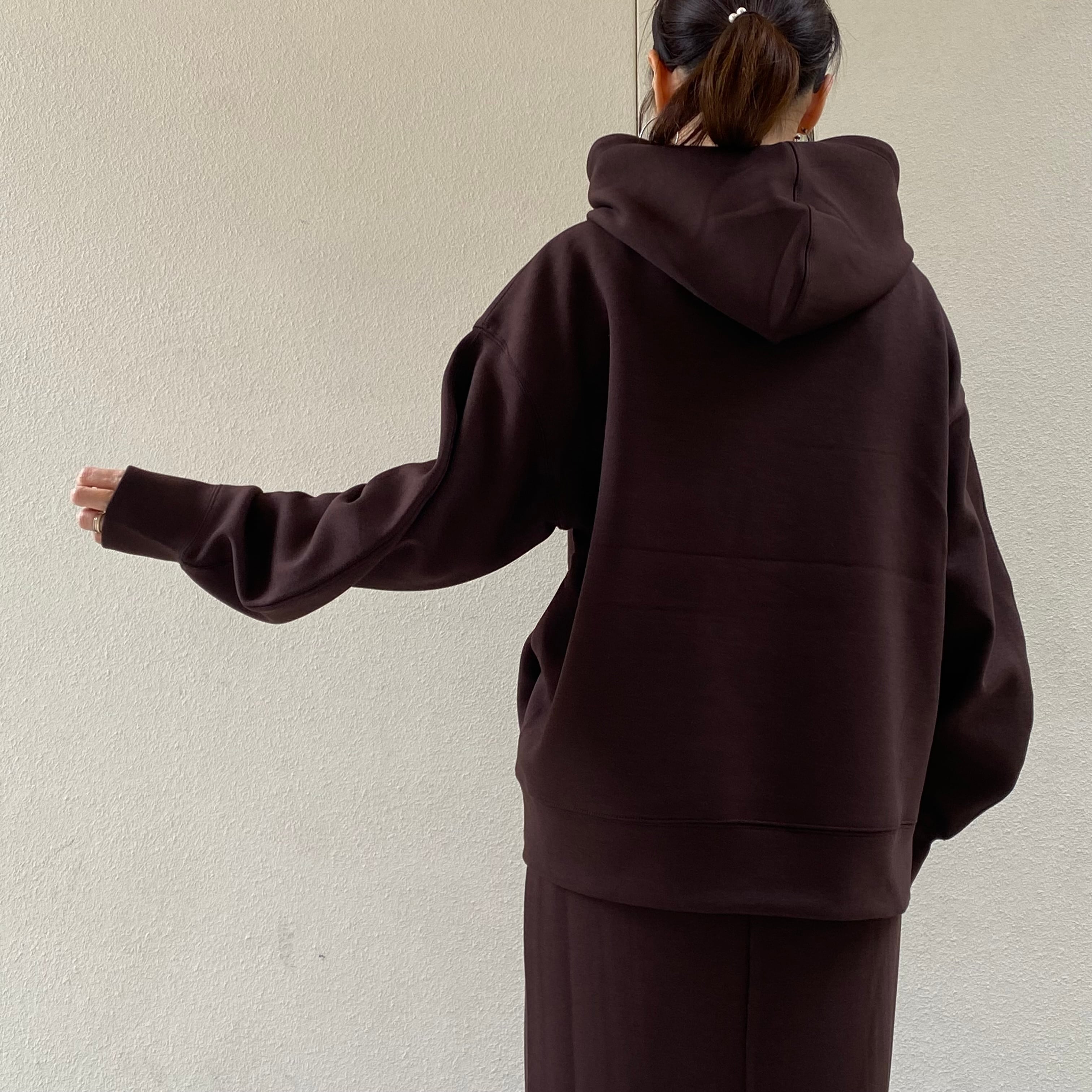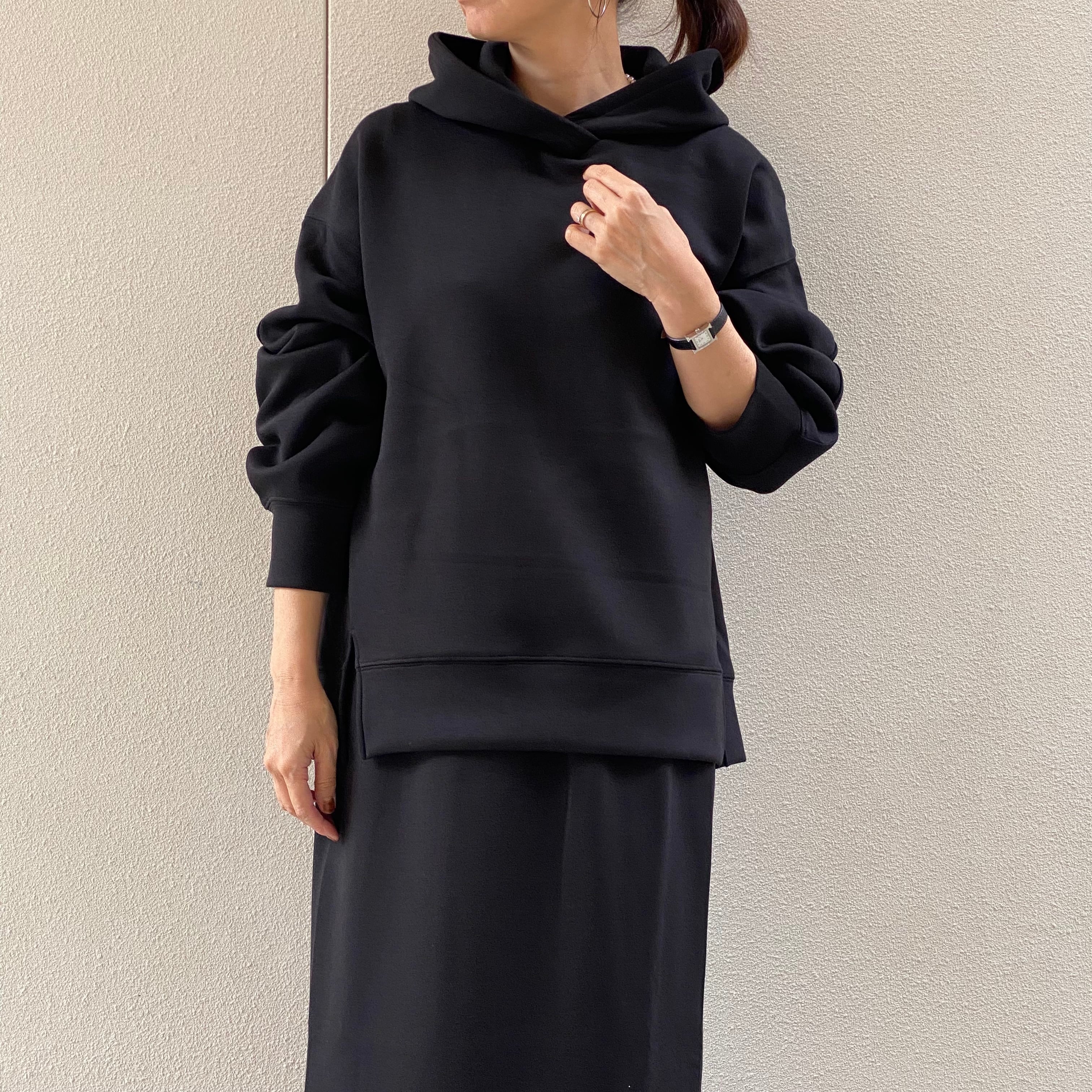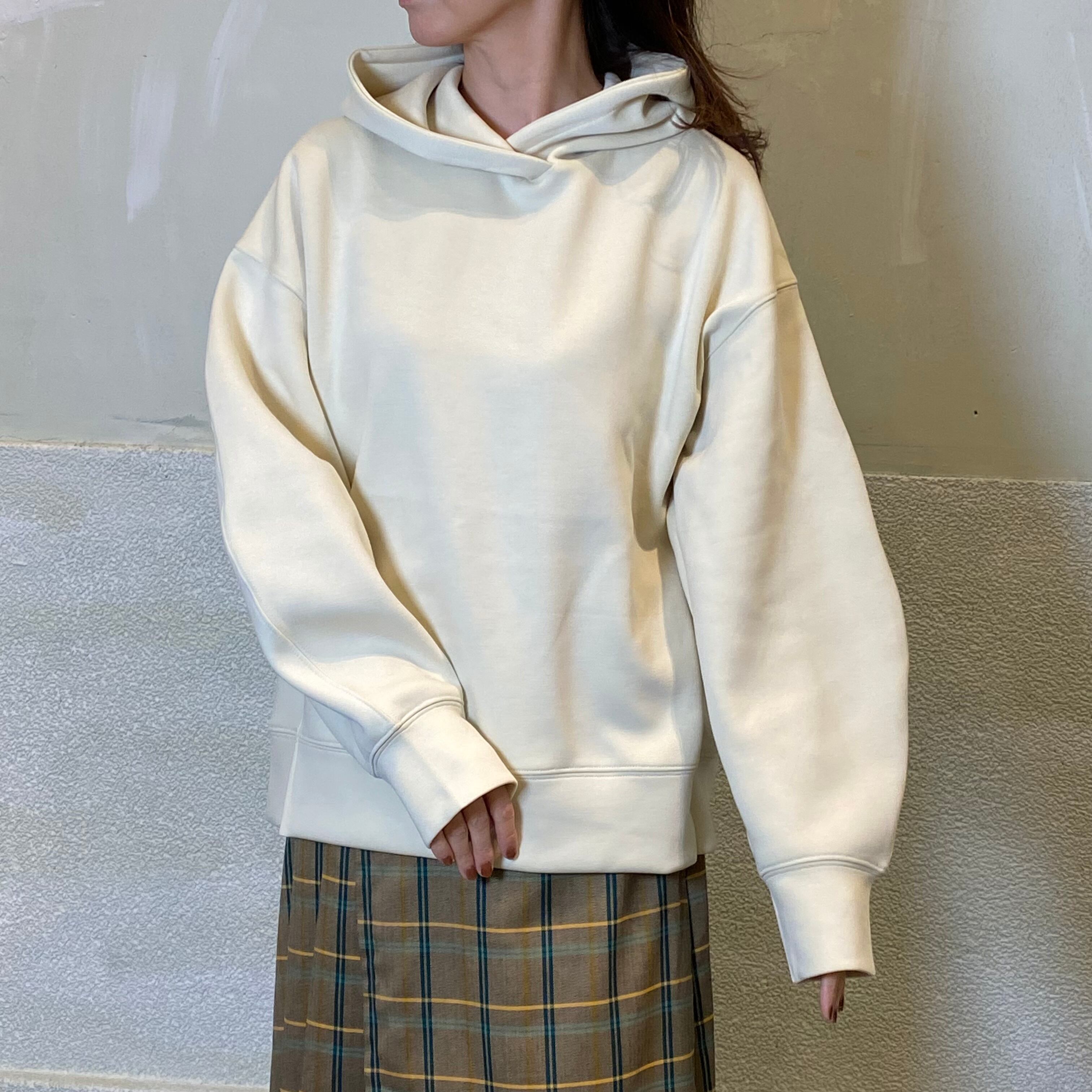 カーブを付けた、ボリューム感のあるスリーブがポイントです。絶妙なハリ感があるので、立体感のあるフォルムに。大きめなフーディでメンズライクな印象もありますが、サイドにはスリットを入れて女性らしさもプラス。
