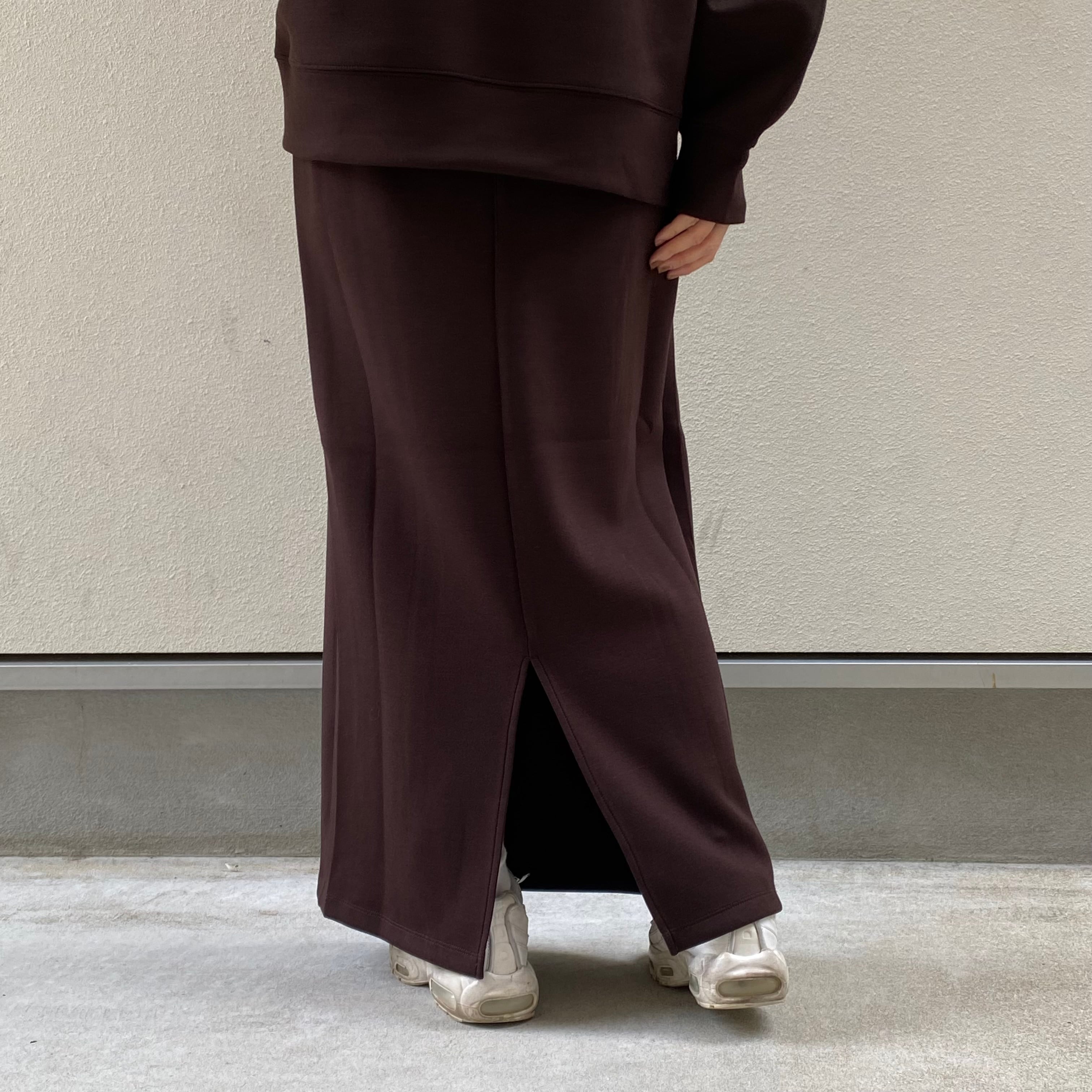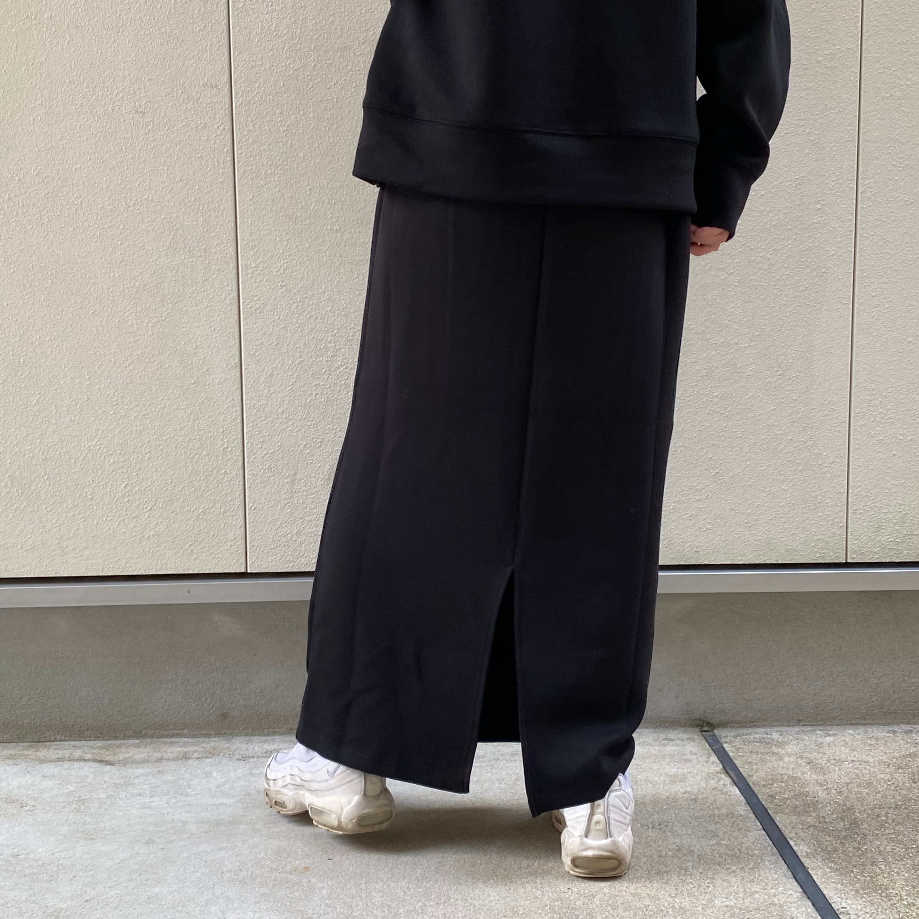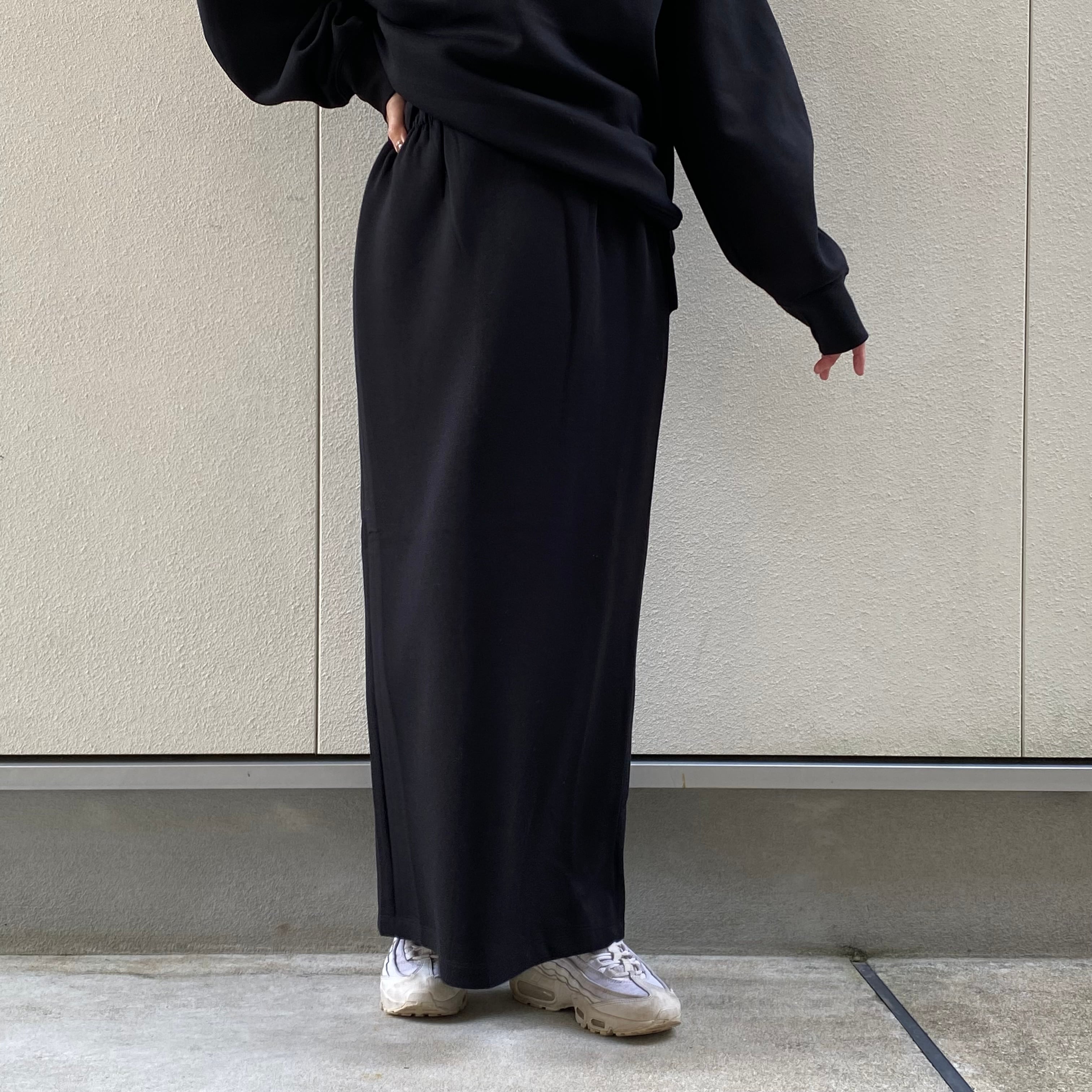 ヒップのラインを拾いすぎない、絶妙なサイジングとマキシ丈で仕上げています。両サイドには平ゴム入りで、ストレスフリーな履き心地です。前後2WAYアイテムなので、その日の気分やスタイリングに合わせてお好みのスタイリングが可能。