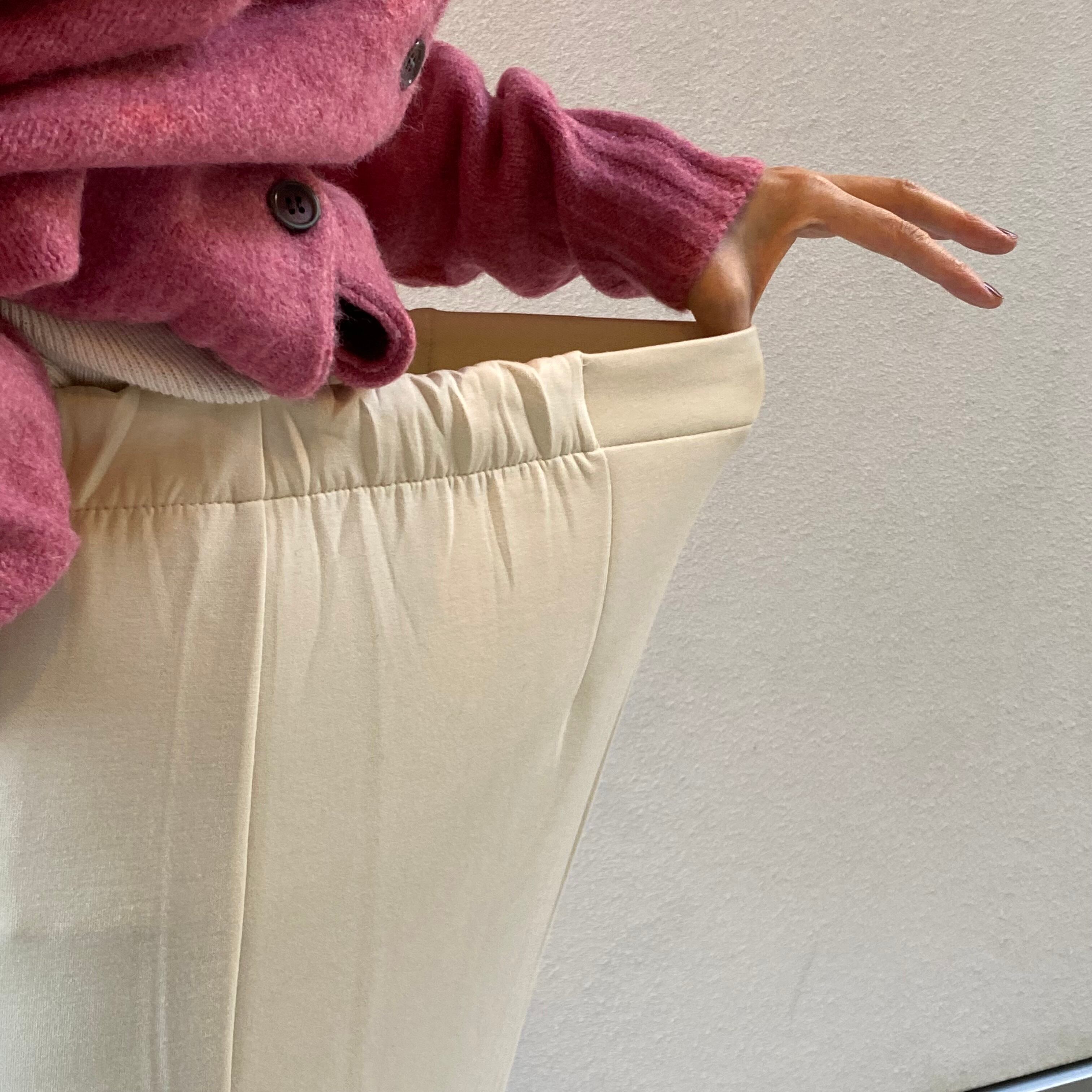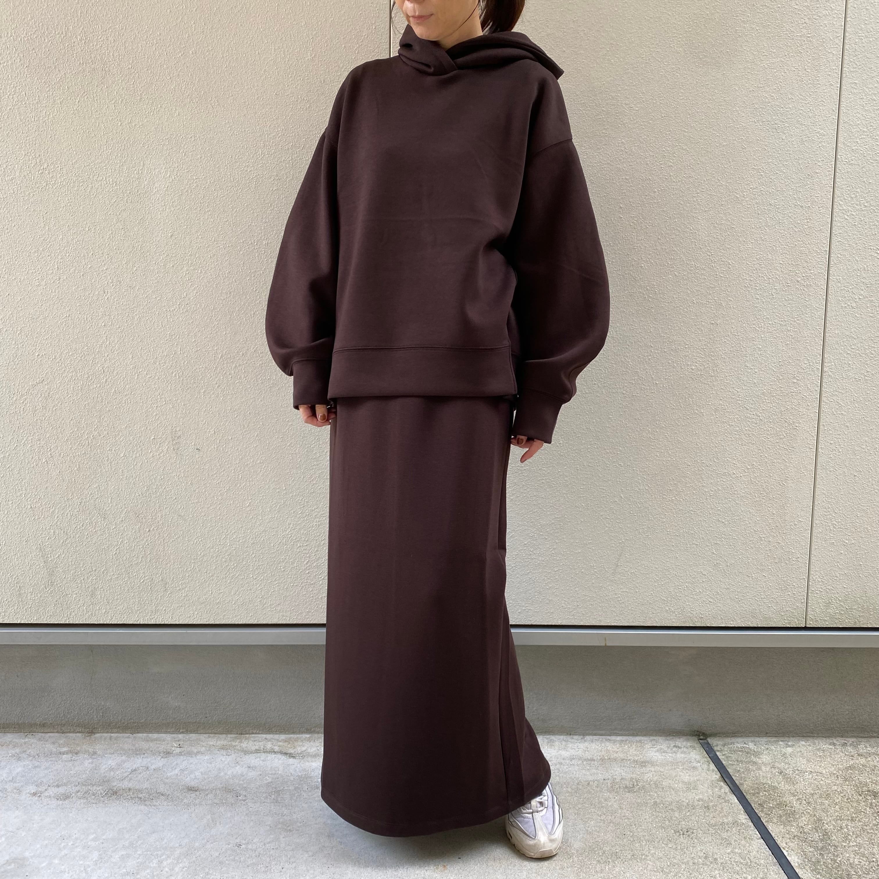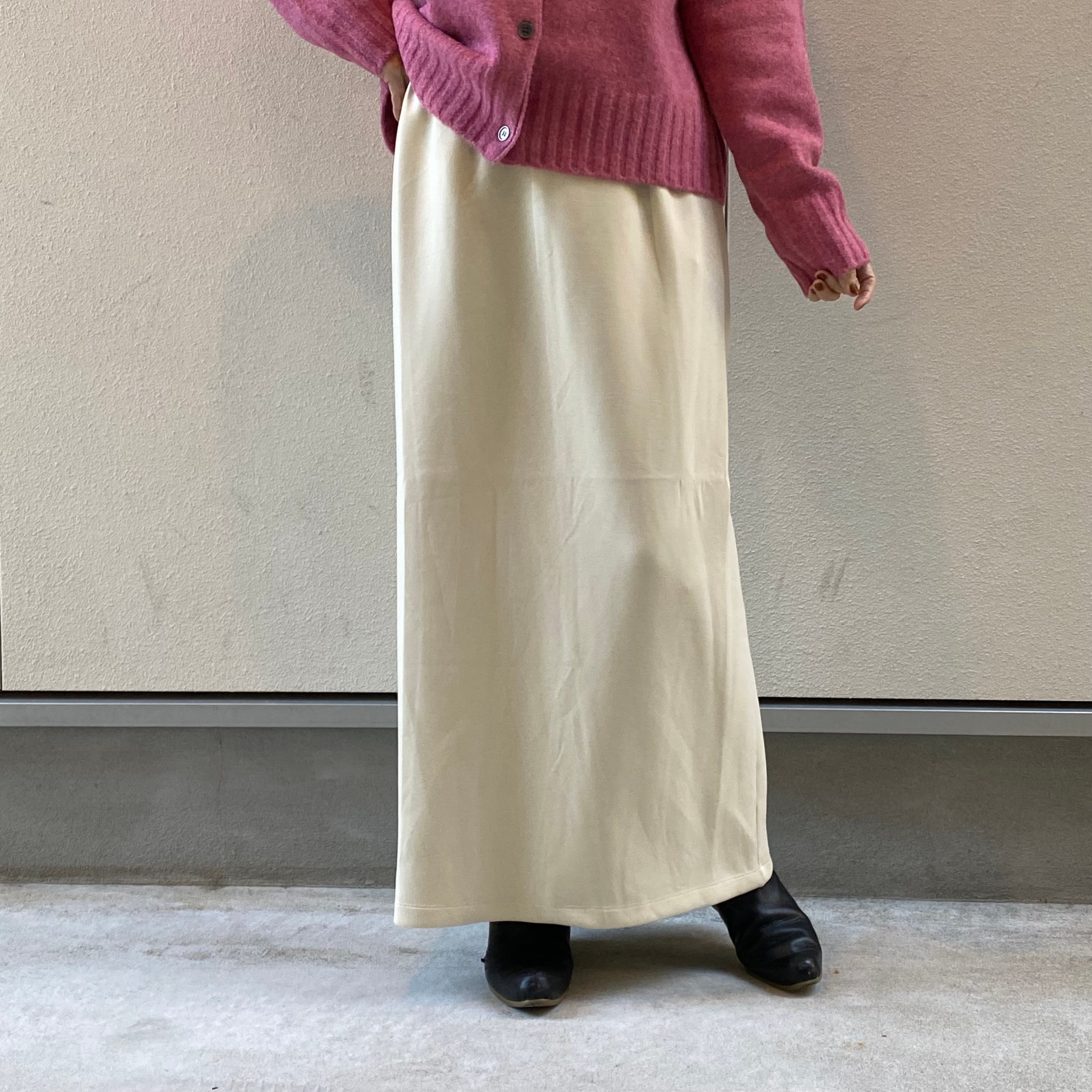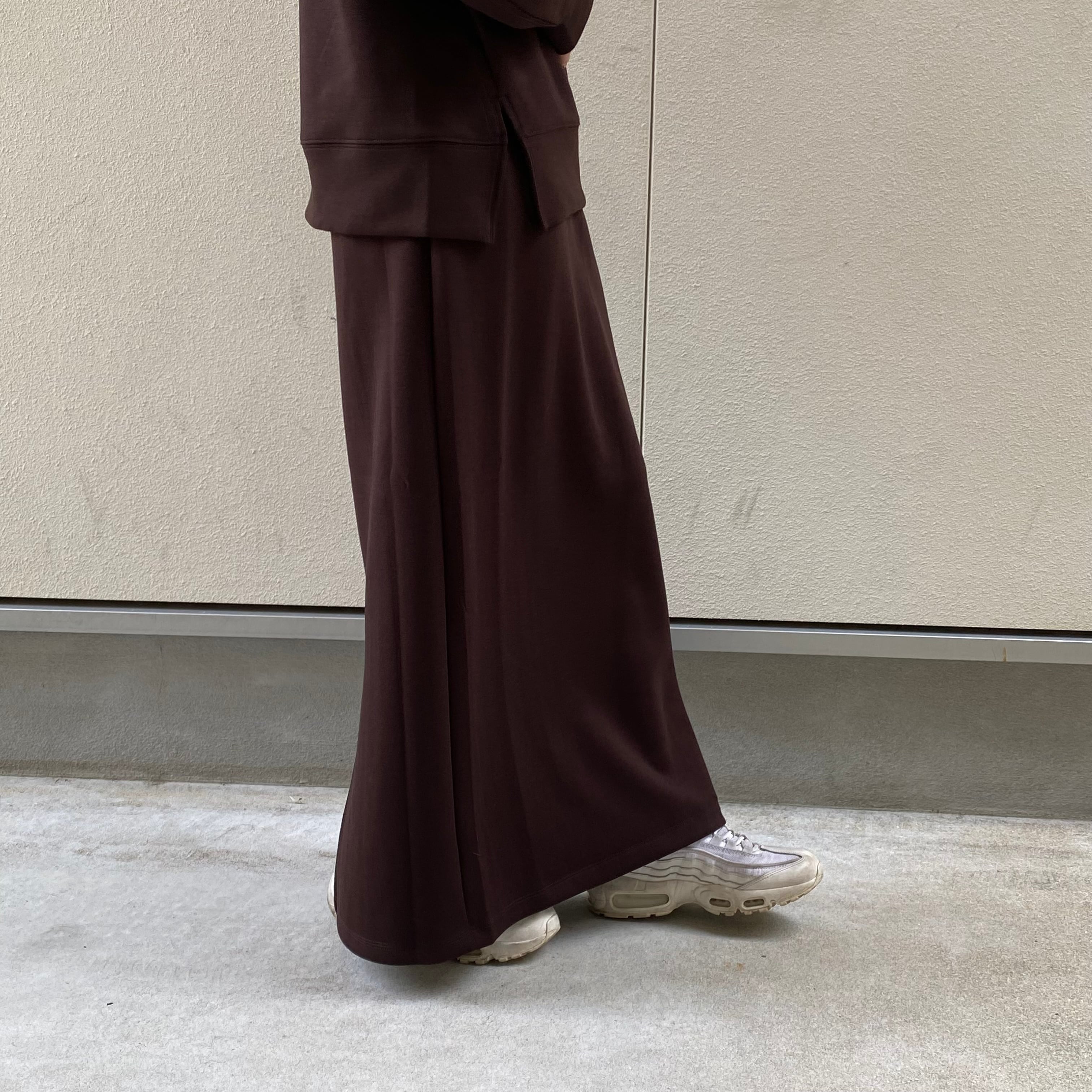 ヒップのラインを拾いすぎない、絶妙なサイジングとマキシ丈で仕上げています。両サイドには平ゴム入りで、ストレスフリーな履き心地です。前後2WAYアイテムなので、その日の気分やスタイリングに合わせてお好みのスタイリングが可能。