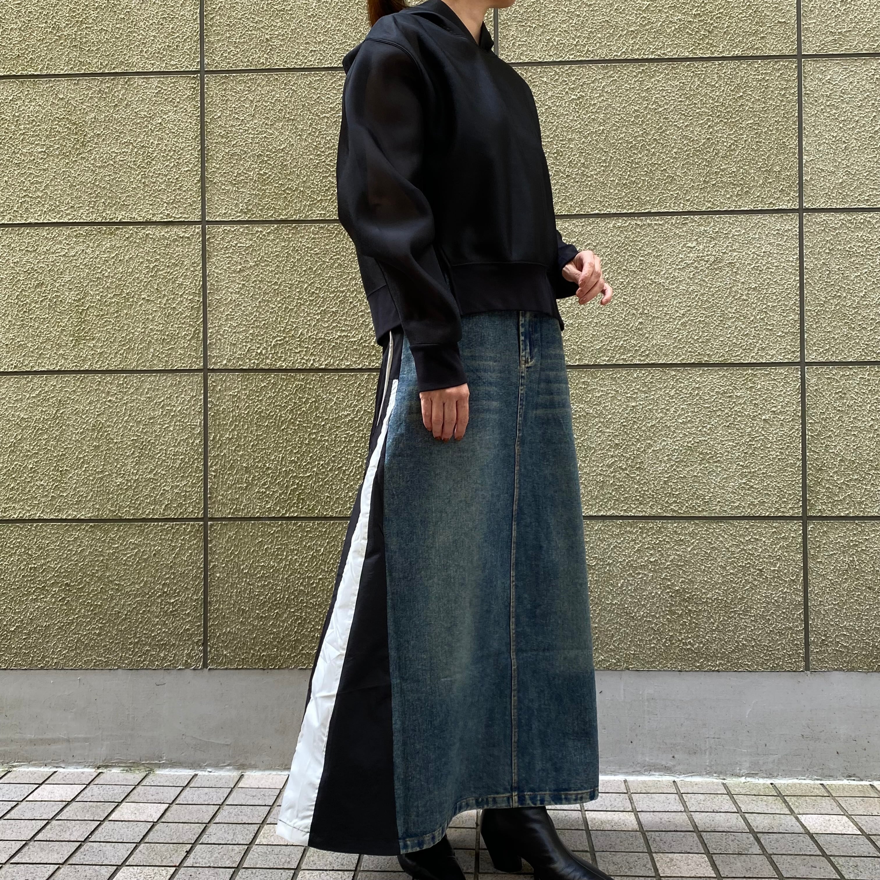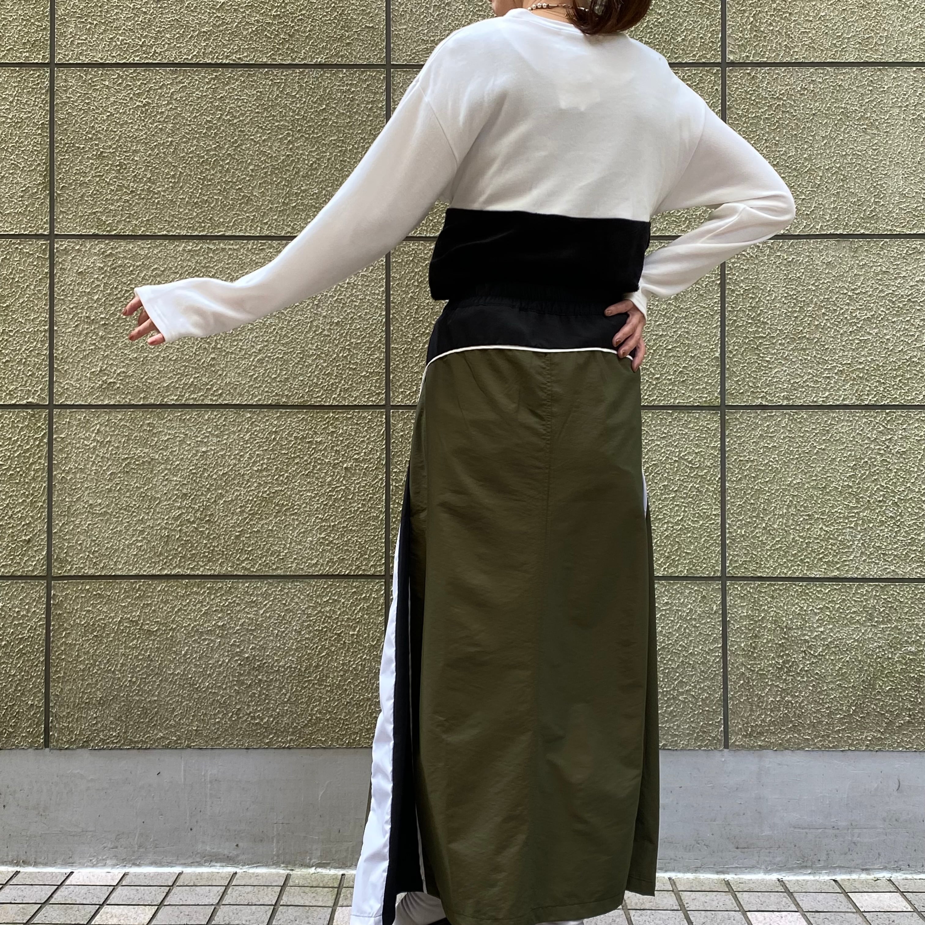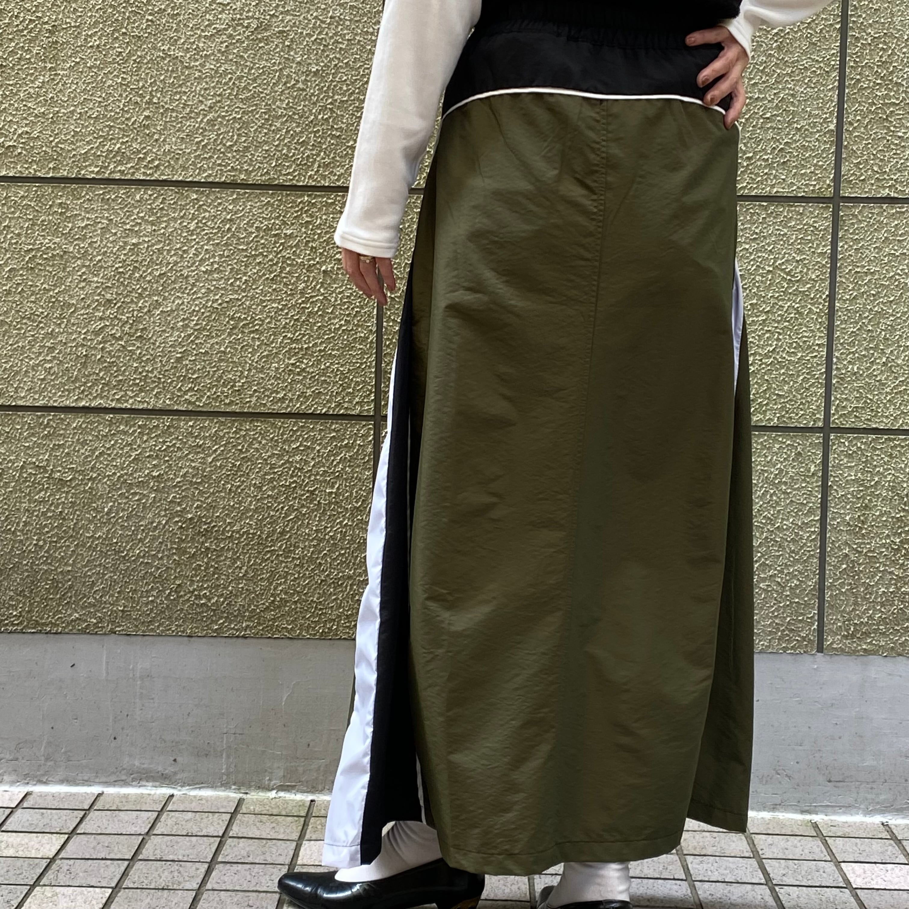 存在感のある異素材ロングスカートは、カジュアルに合わせやすく、