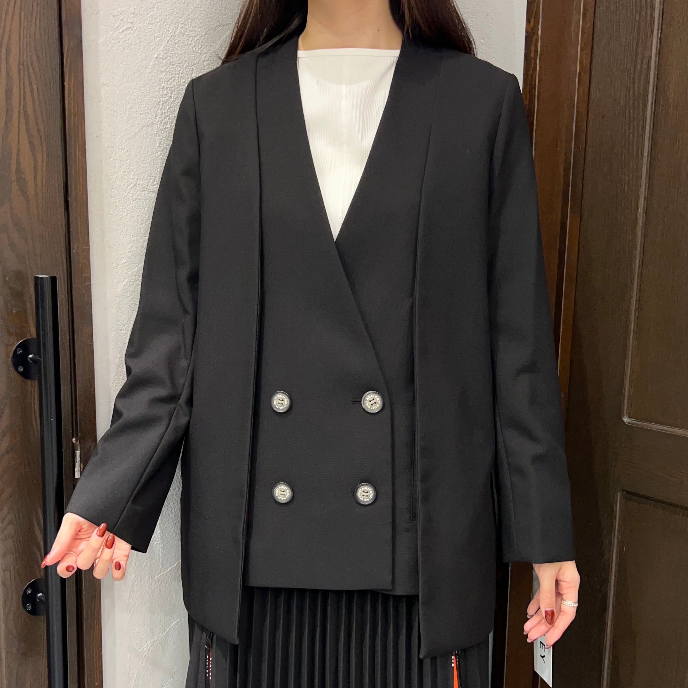 サイドのボタンを外して袖を通さず肩から羽織った変化球スタイルも楽しめる2way使用!