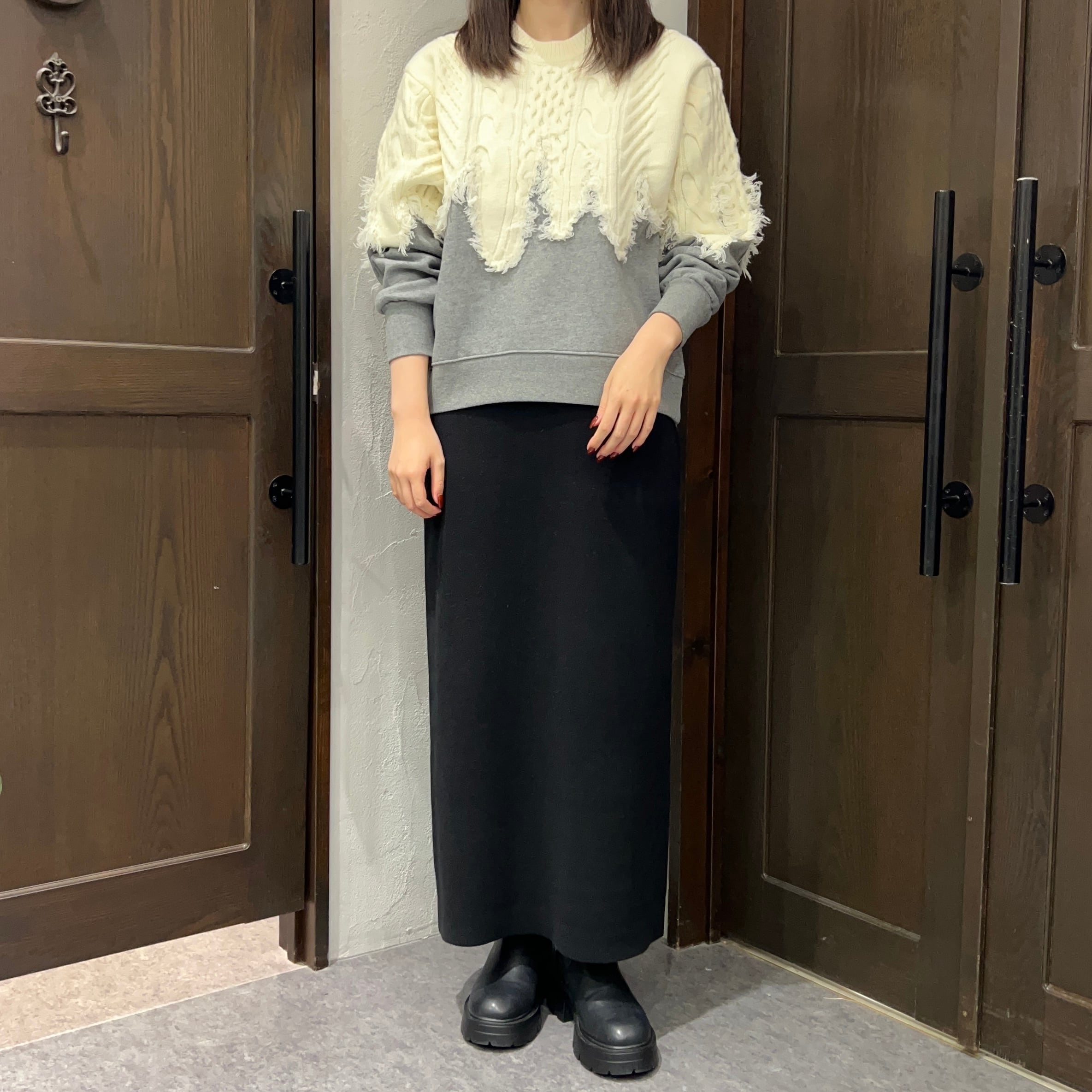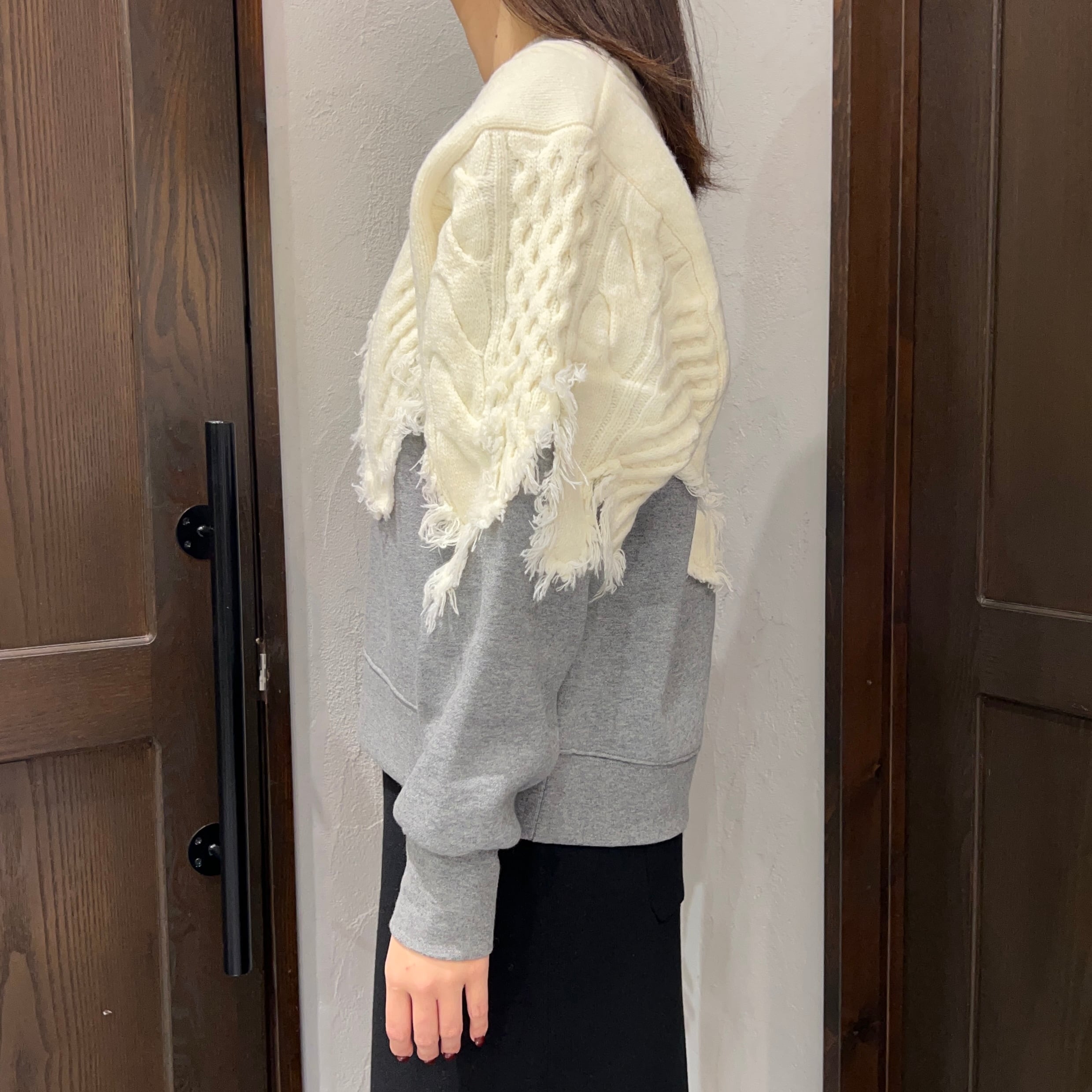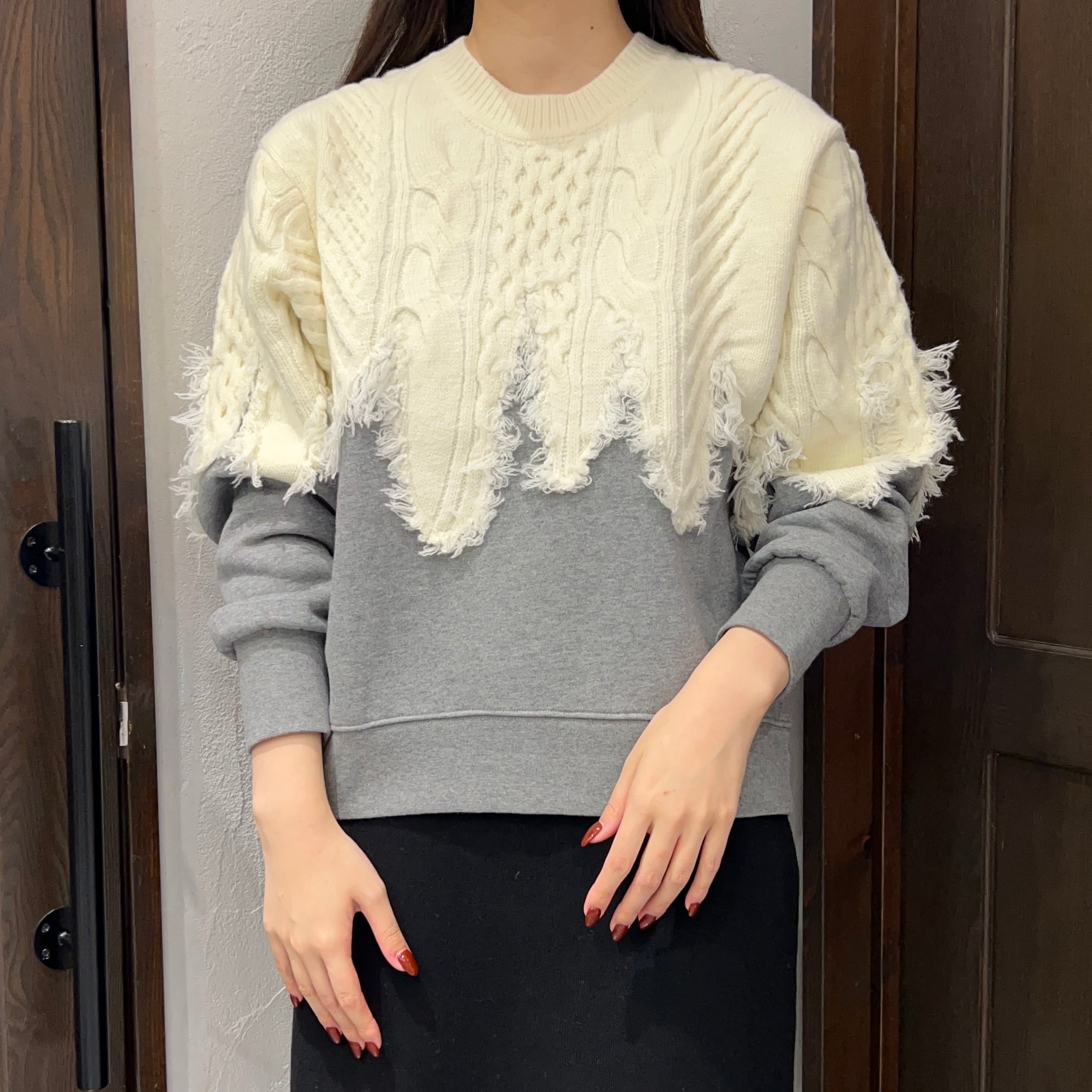 上身頃部分はケーブル編み風のニット素材を使用し、裾や袖にかけてカットオフ風のフリンジ仕上げがポイント。下部分はスウェット生地で、裏起毛になっているため、肌あたりが柔らかく暖かい着心地です。