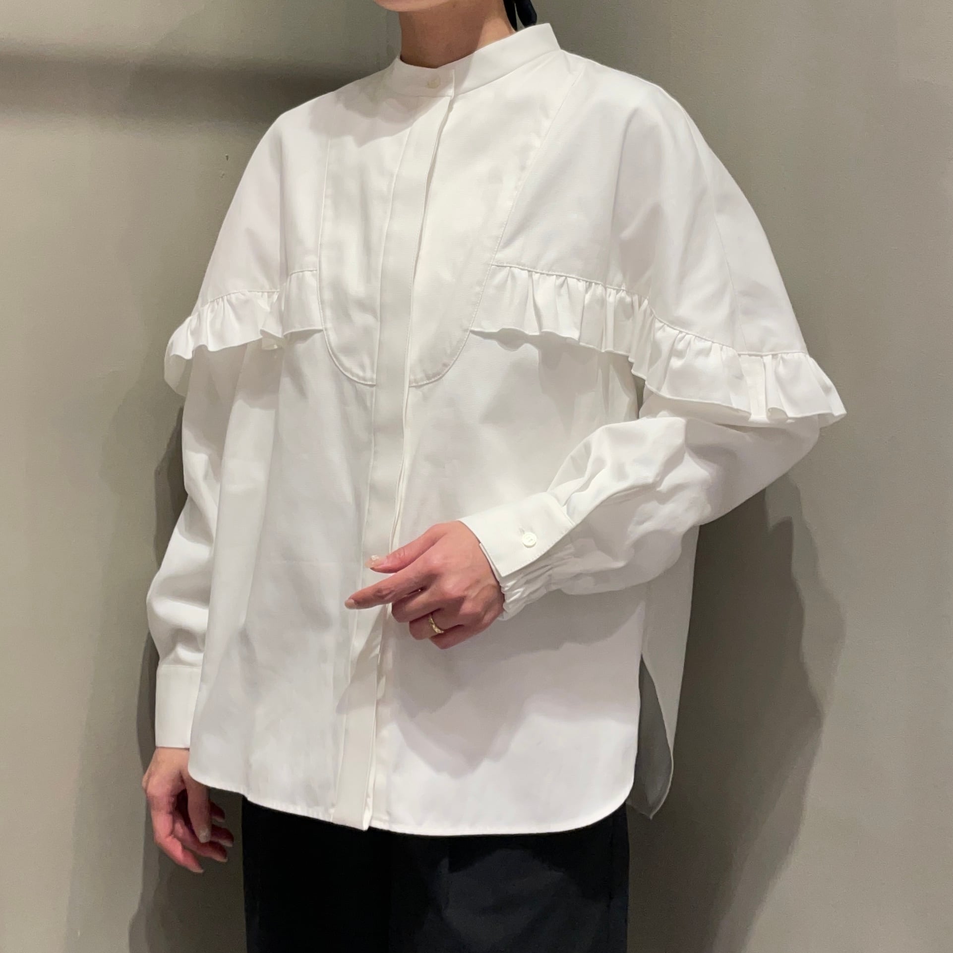 綿100%で丈夫で通気性の良い生地を使用したフリルシャツ。