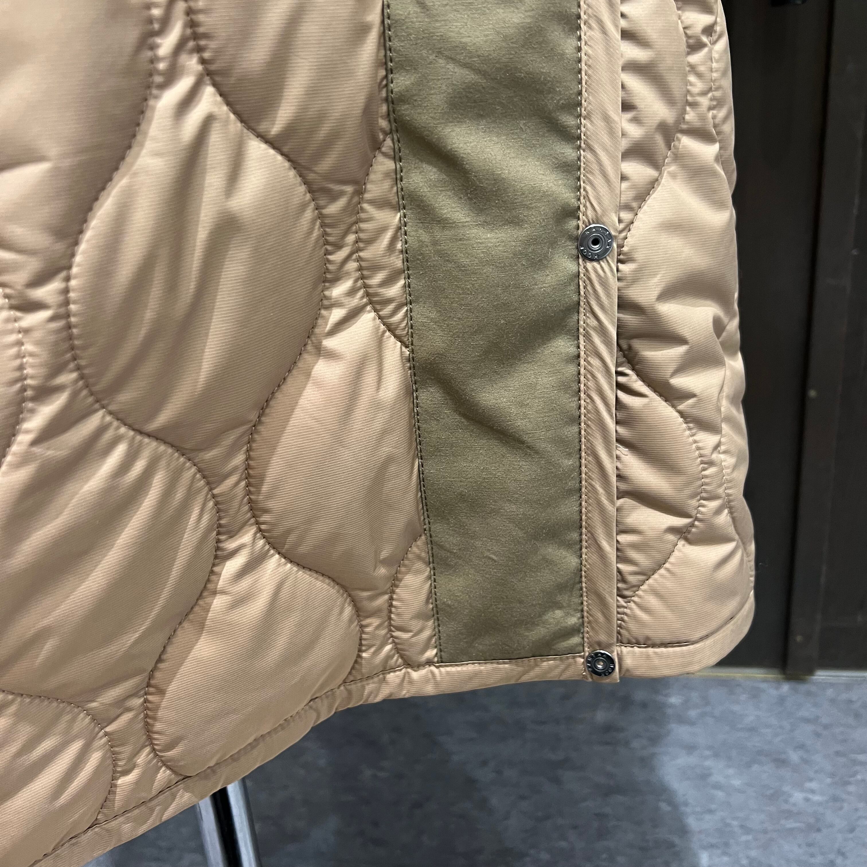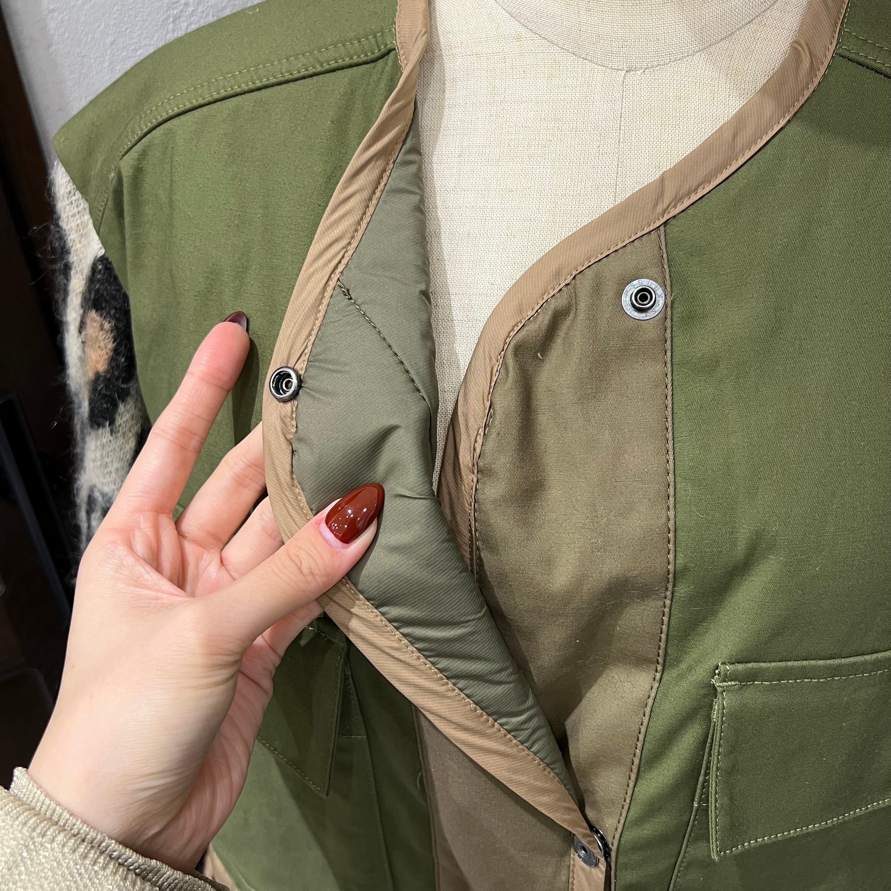 上身頃にはハリのあるカーキの布帛素材を使用し、ミリタリーテイストを感じるデザインに。