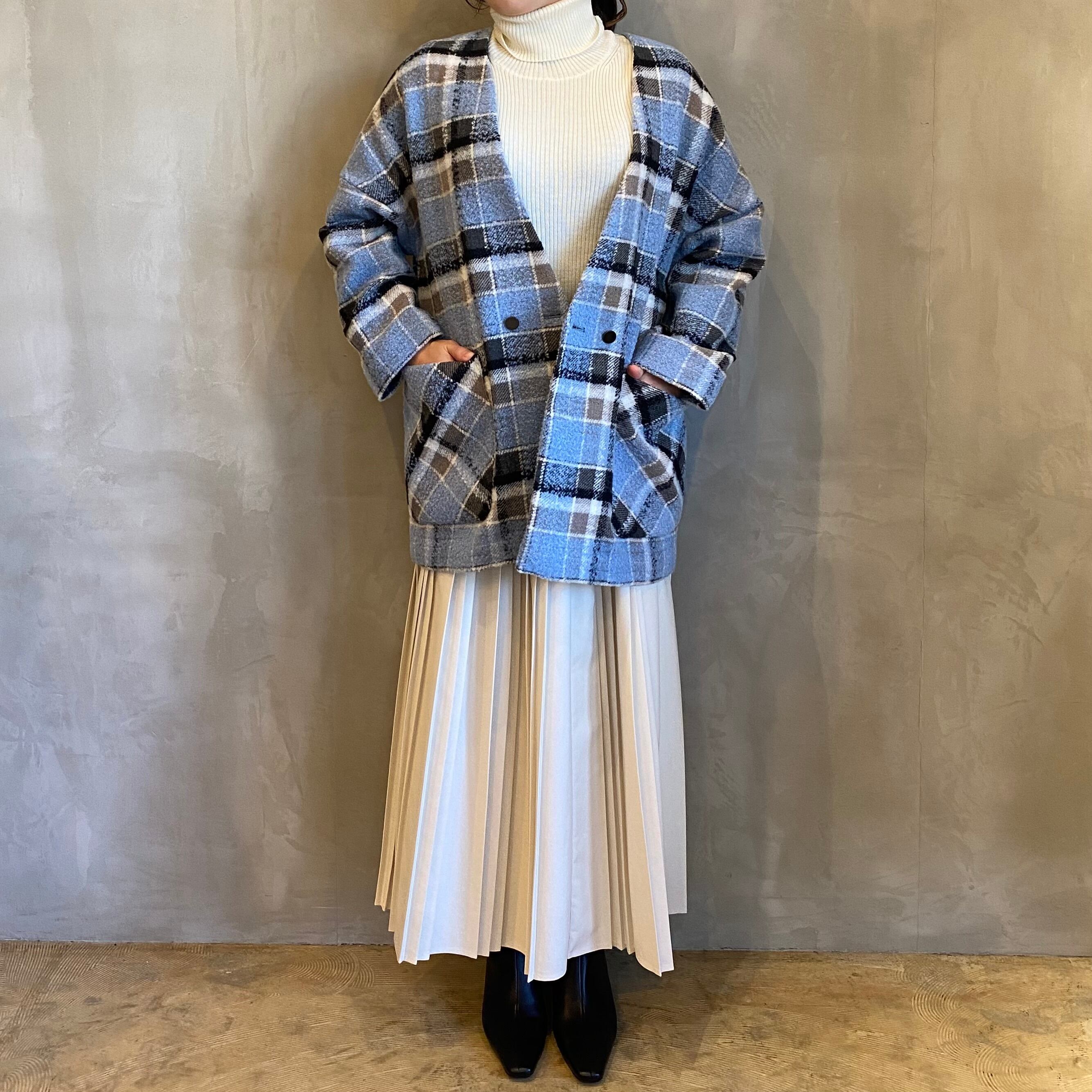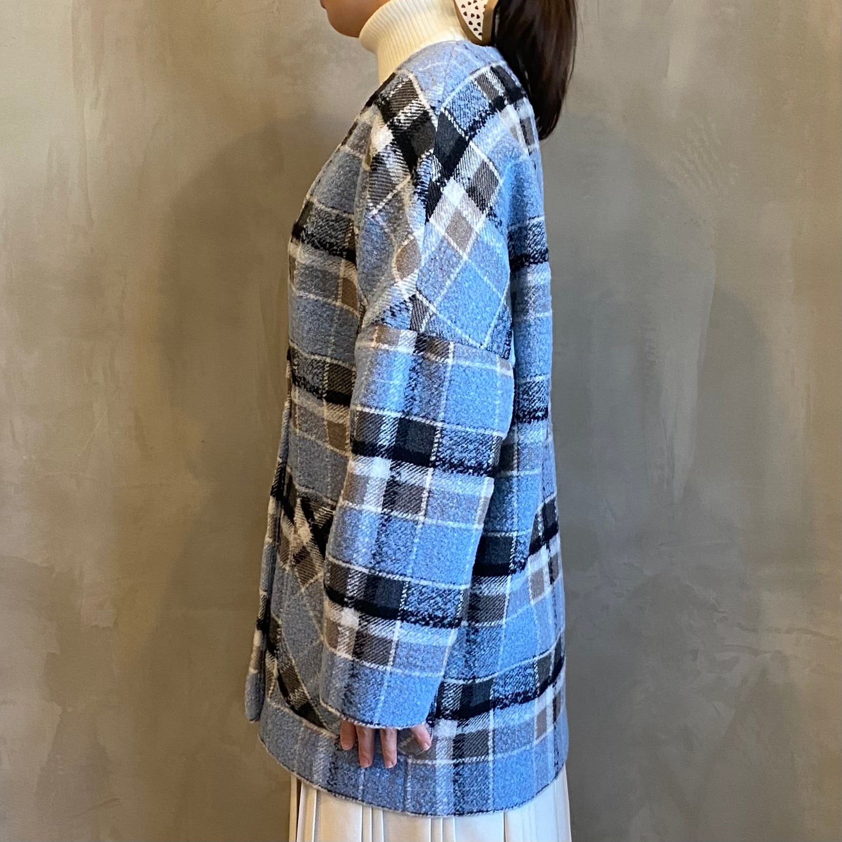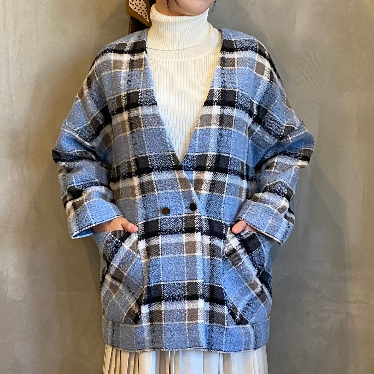 ツイード調大柄チェックがコーディネートに季節感を添えるVネックコート