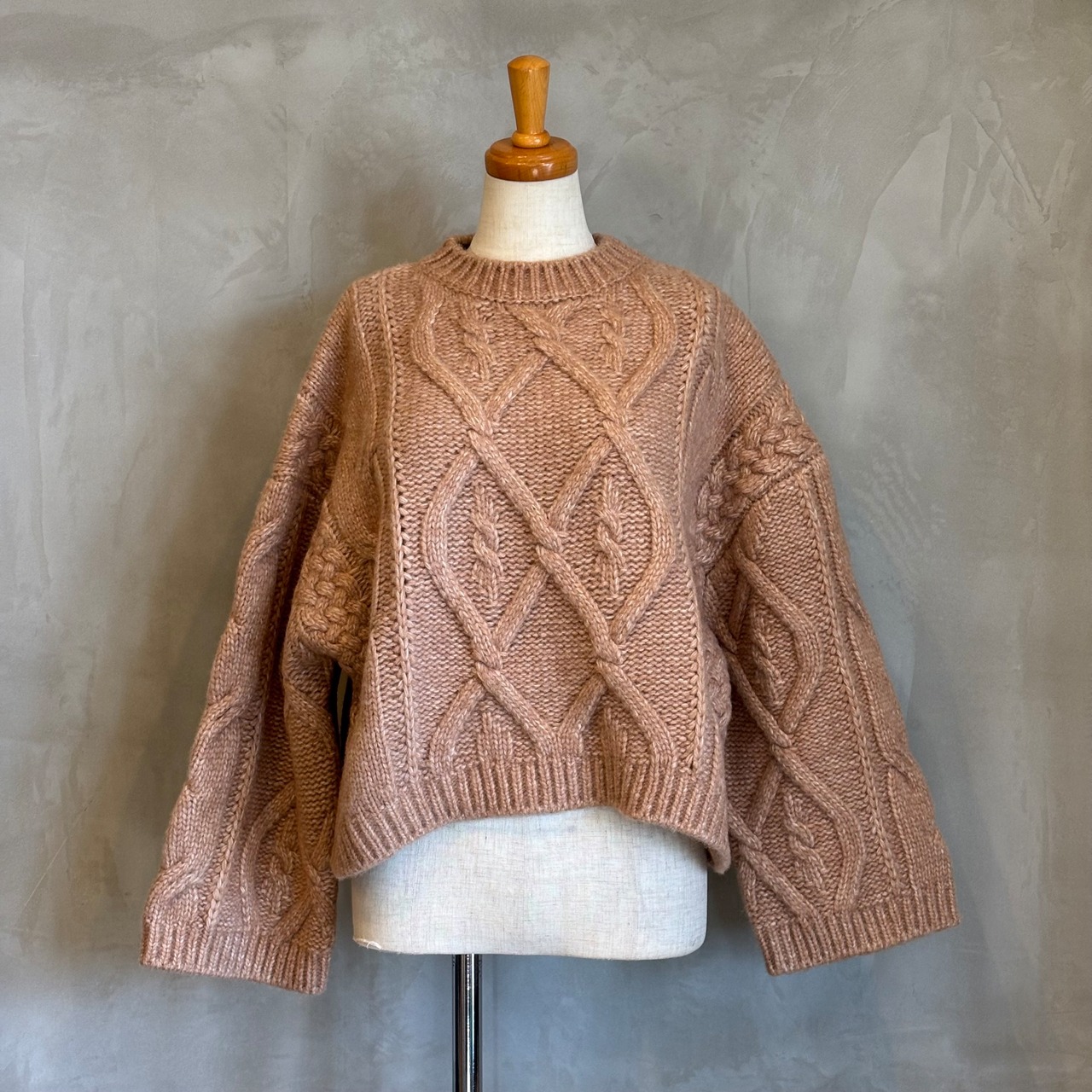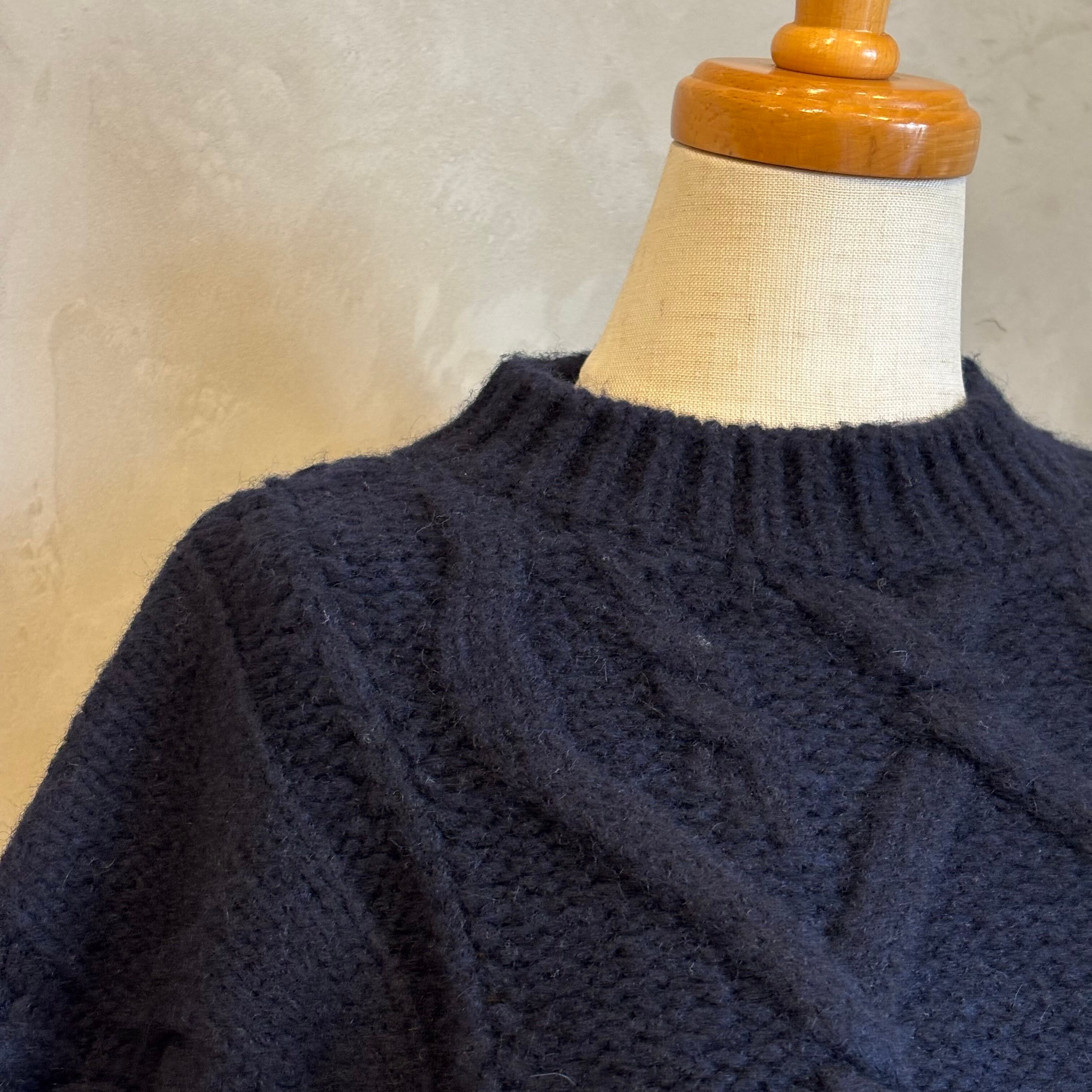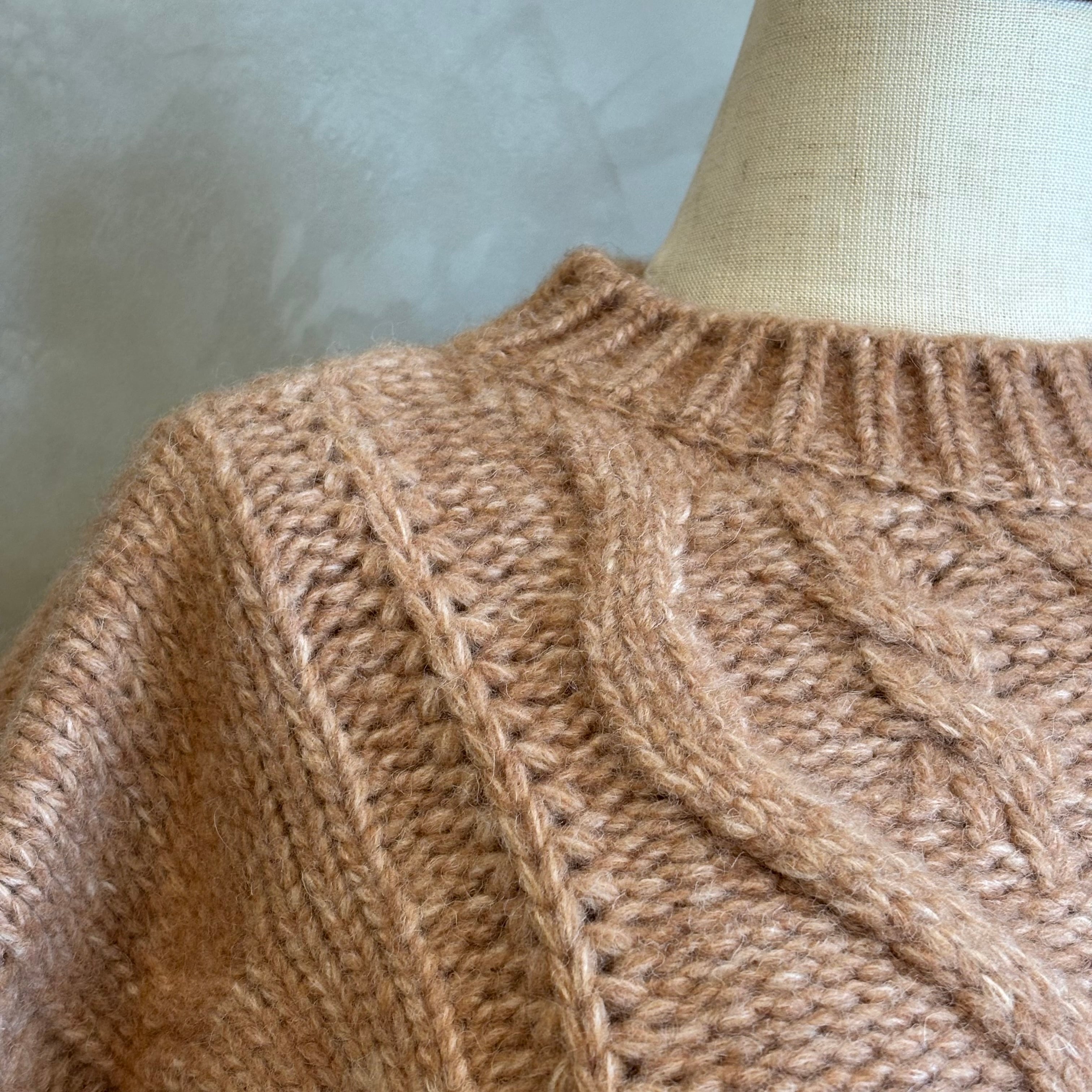 ローゲージのケーブル編みで立体感のある表情を出し、柔らかくボリューミーに仕上げました。