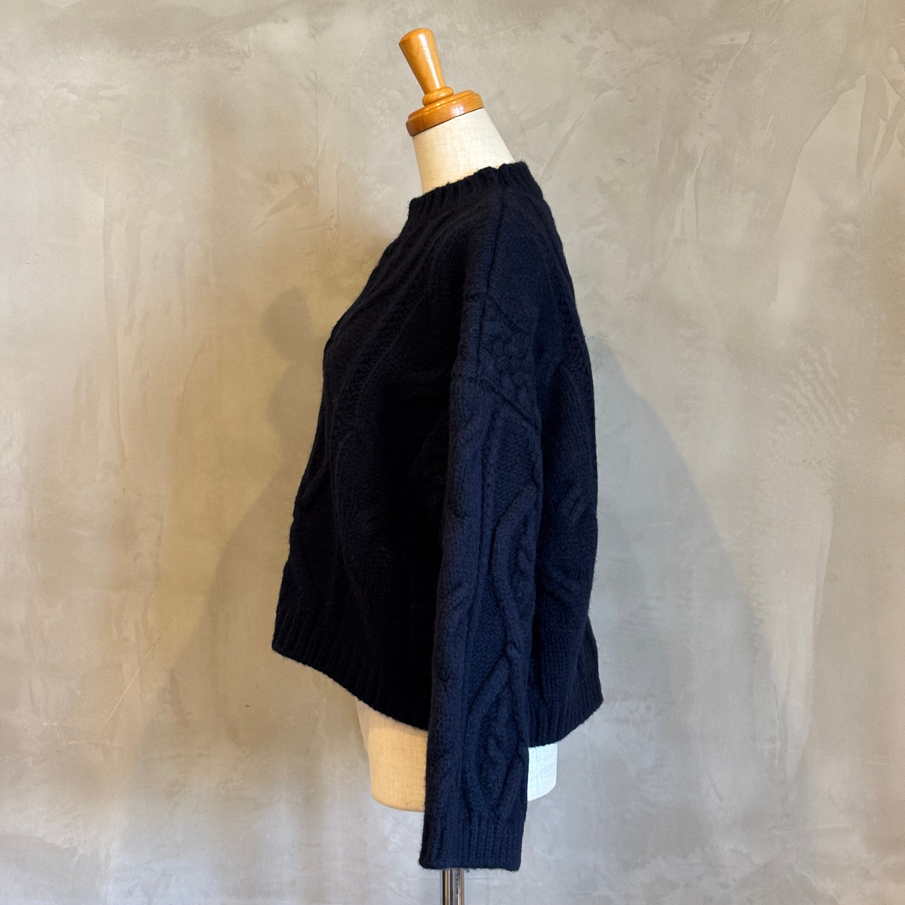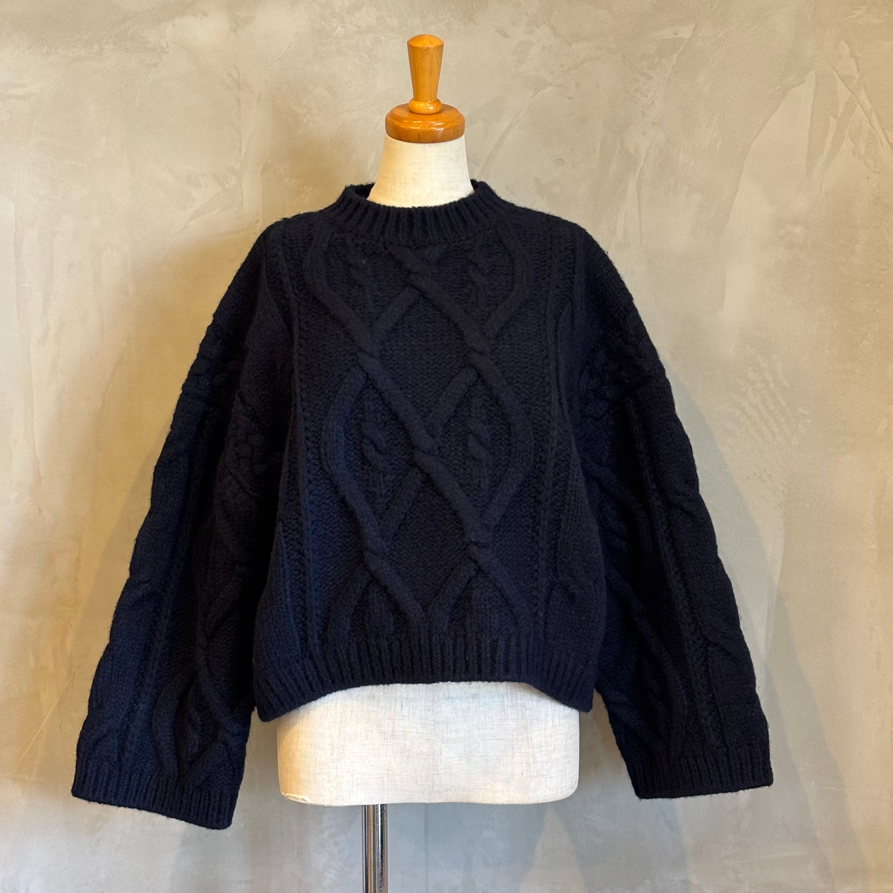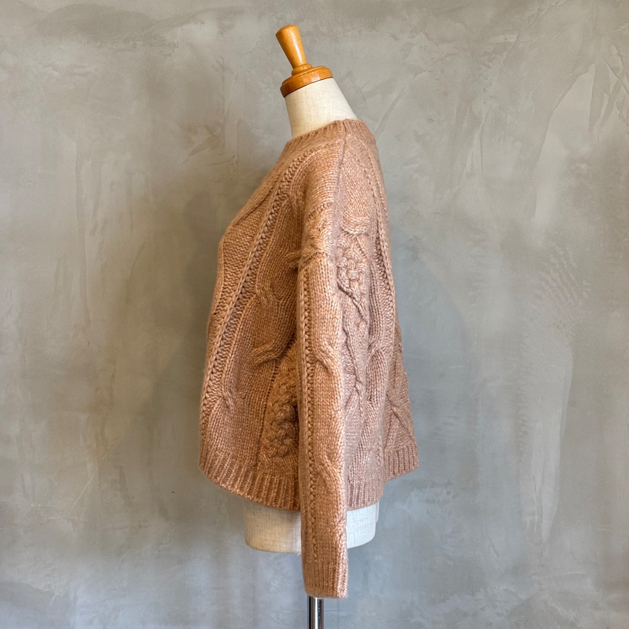 ローゲージのケーブル編みで立体感のある表情を出し、柔らかくボリューミーに仕上げました。