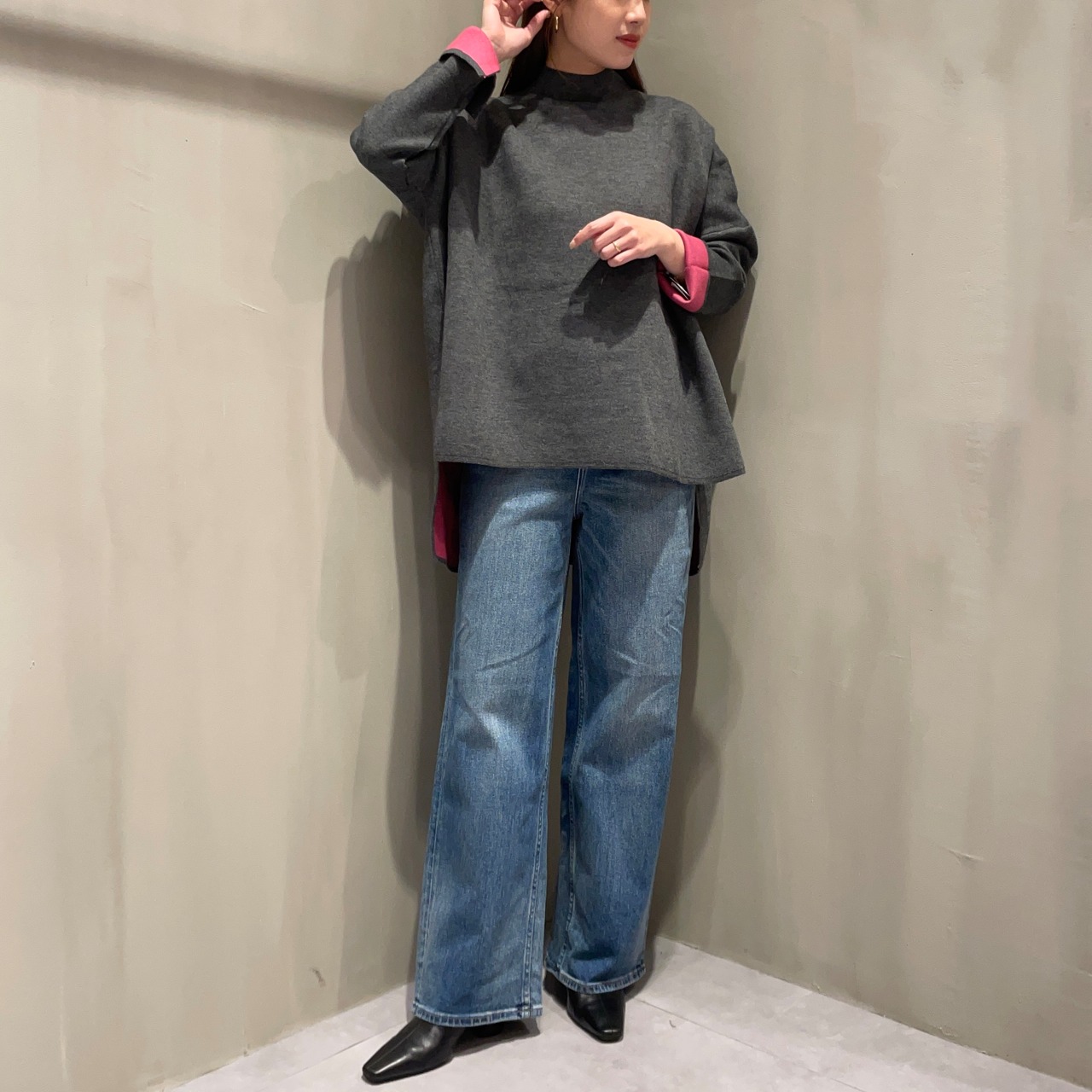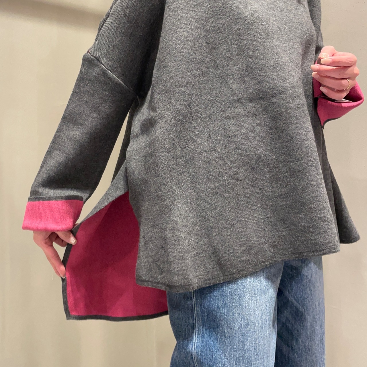 シンプルながら裏地配色でコーディネートにアクセントをプラスしてくれるオーバーニット。