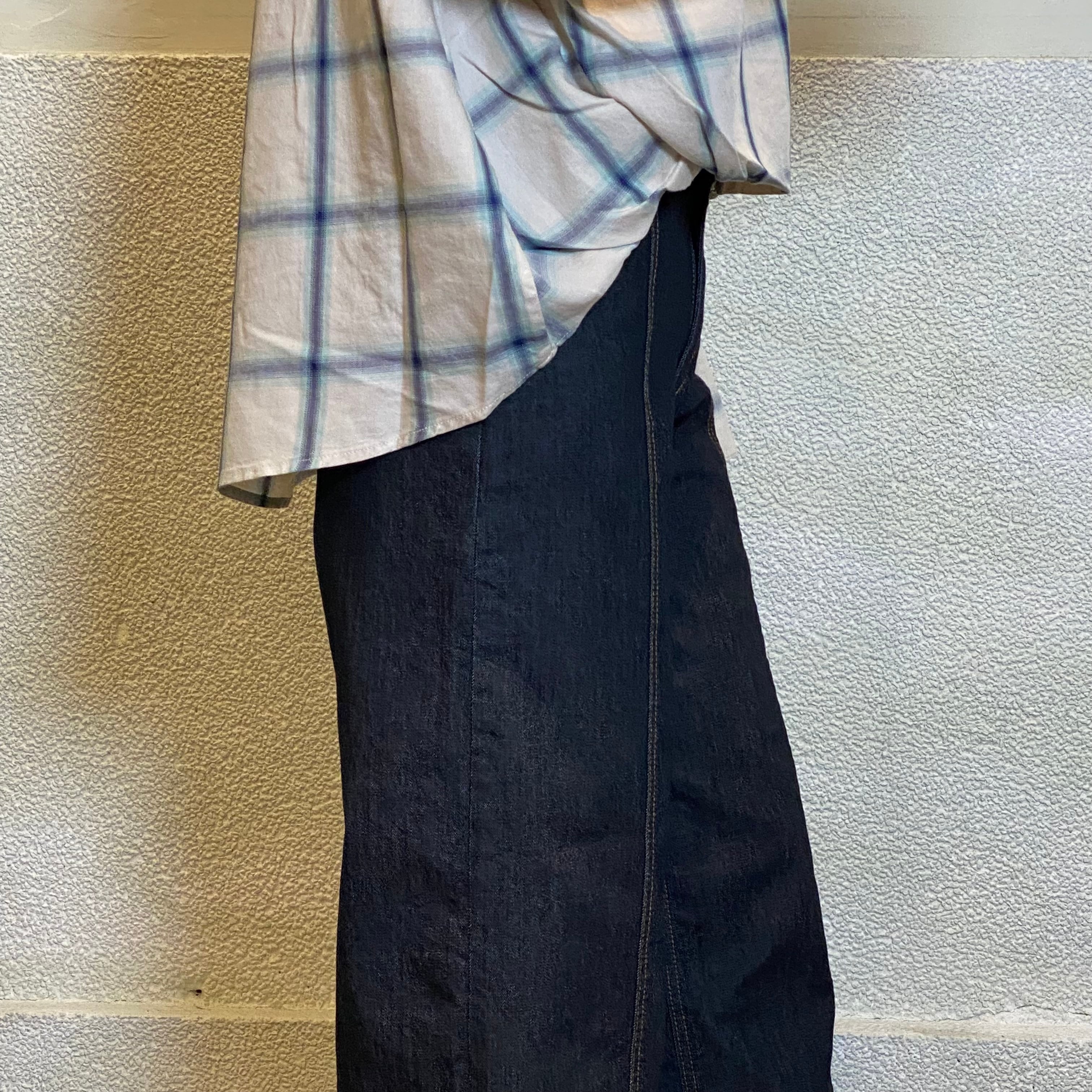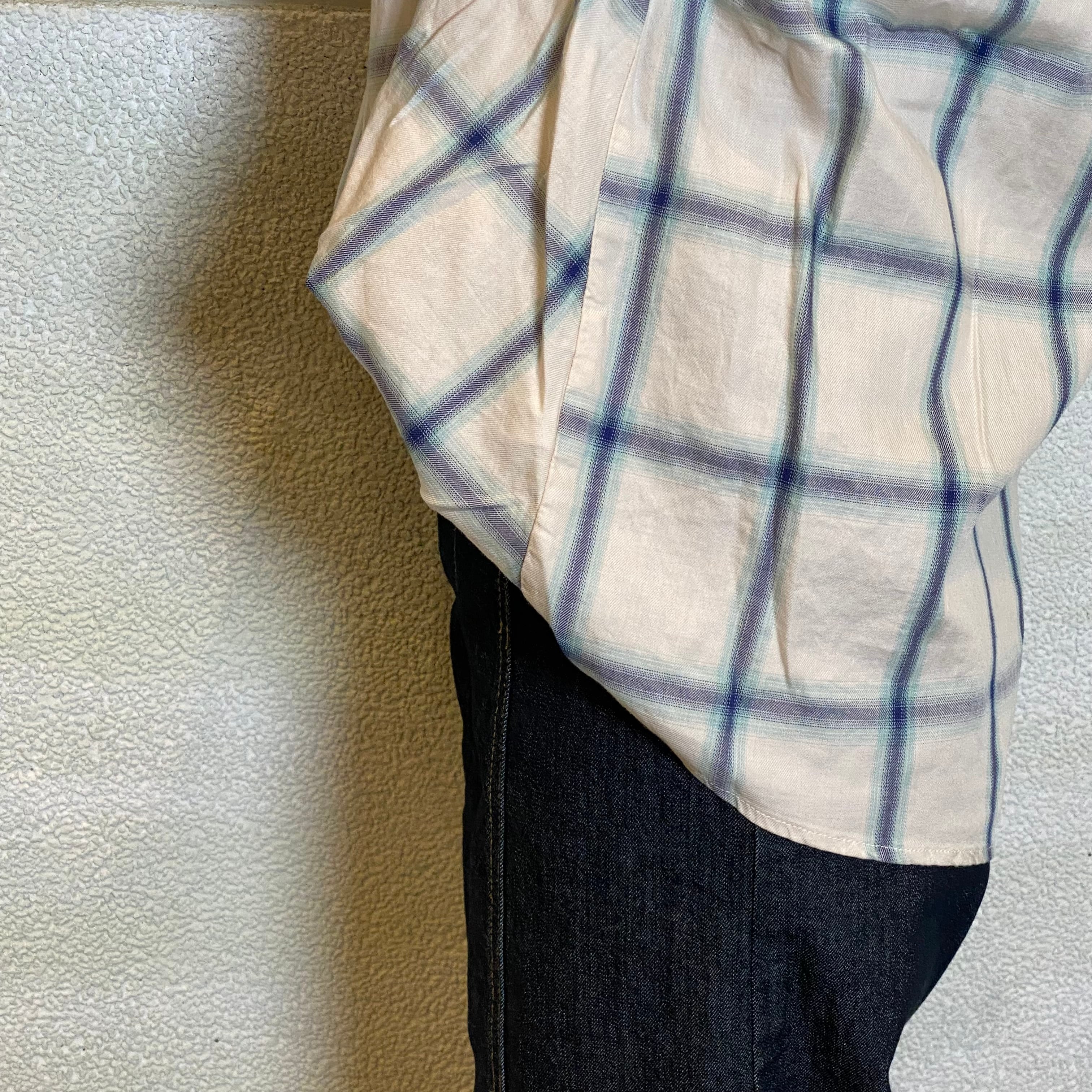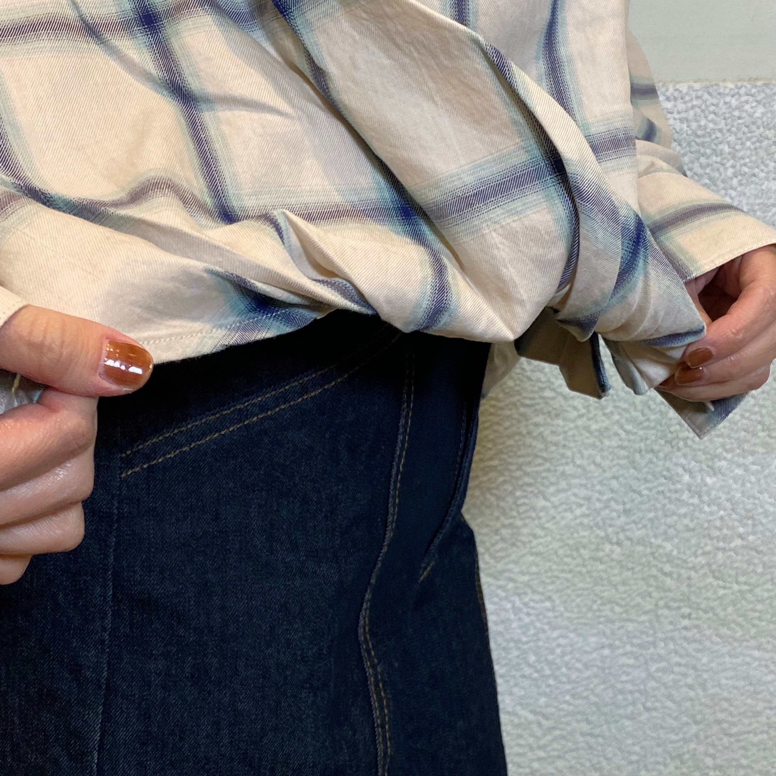 フロントはトレンドのバルーンシルエットで、ウエストインしたようなチェックシャツ。
