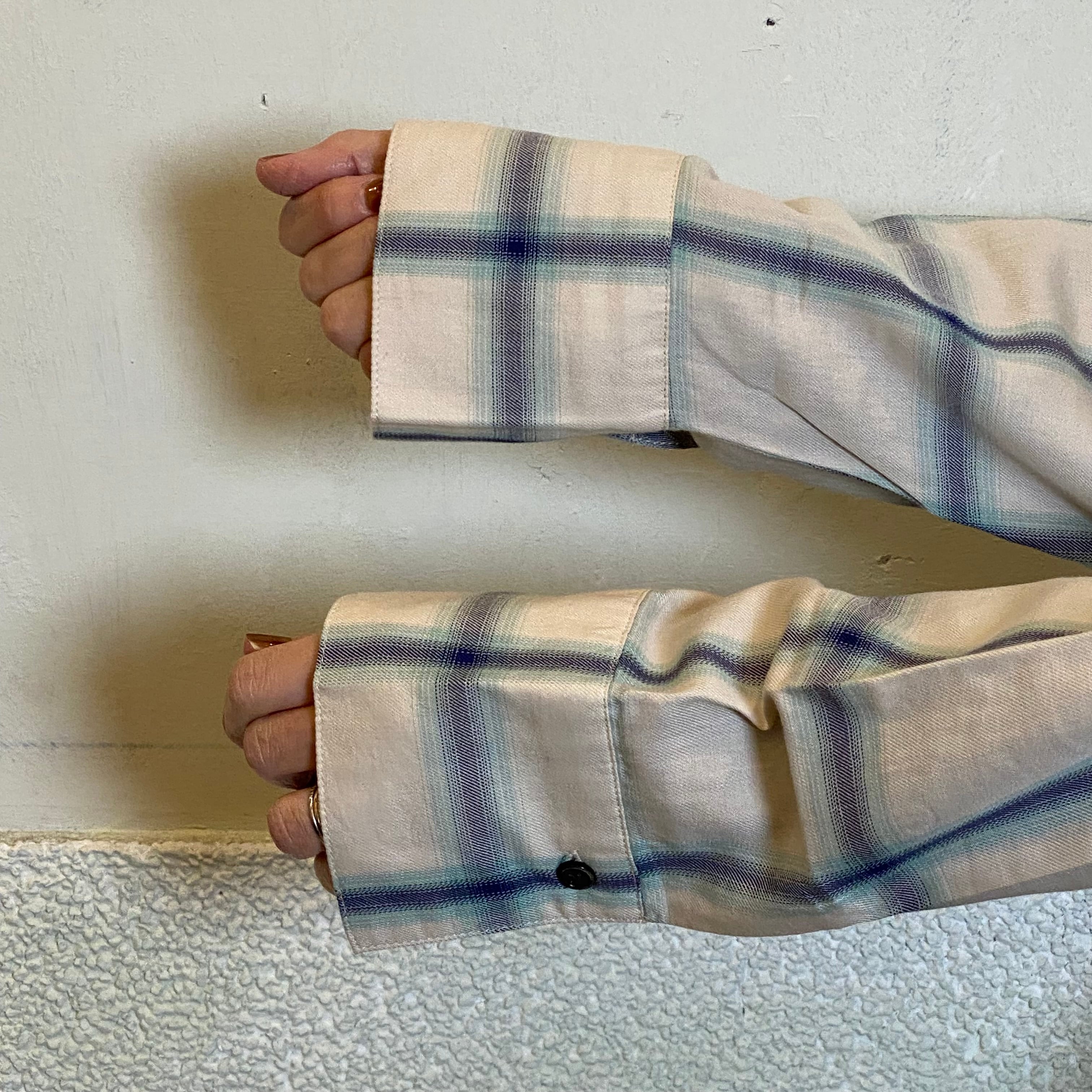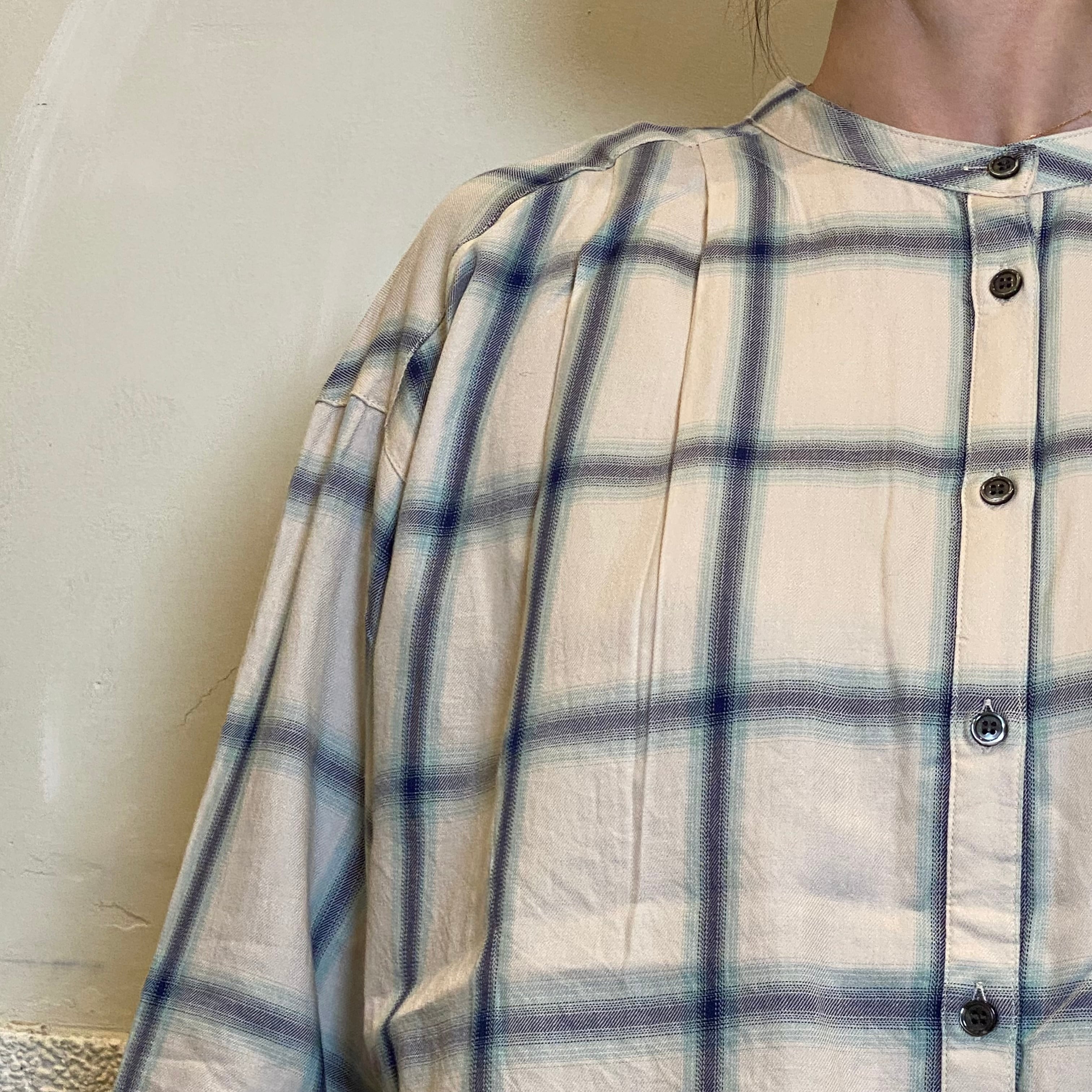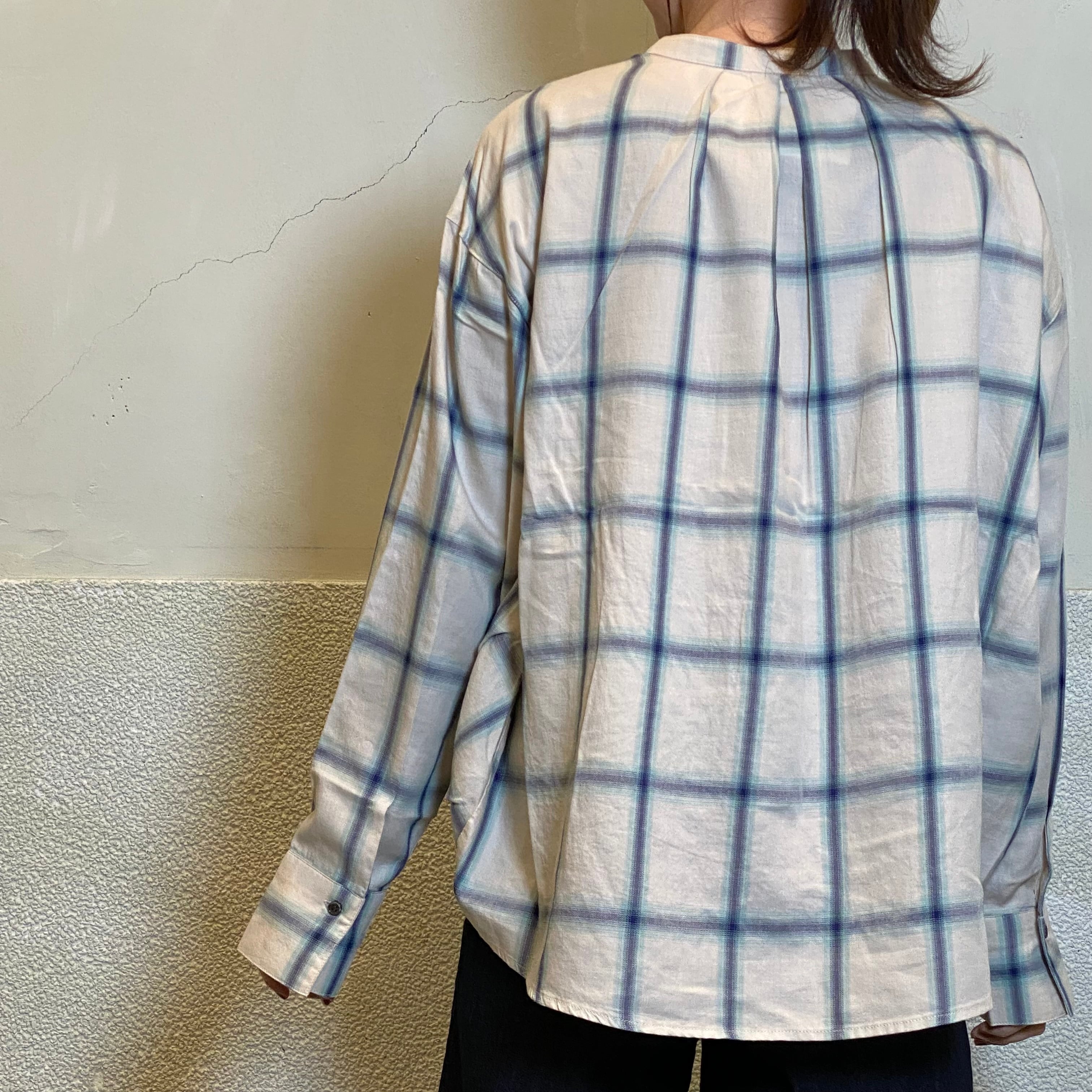 フロントはトレンドのバルーンシルエットで、ウエストインしたようなチェックシャツ。