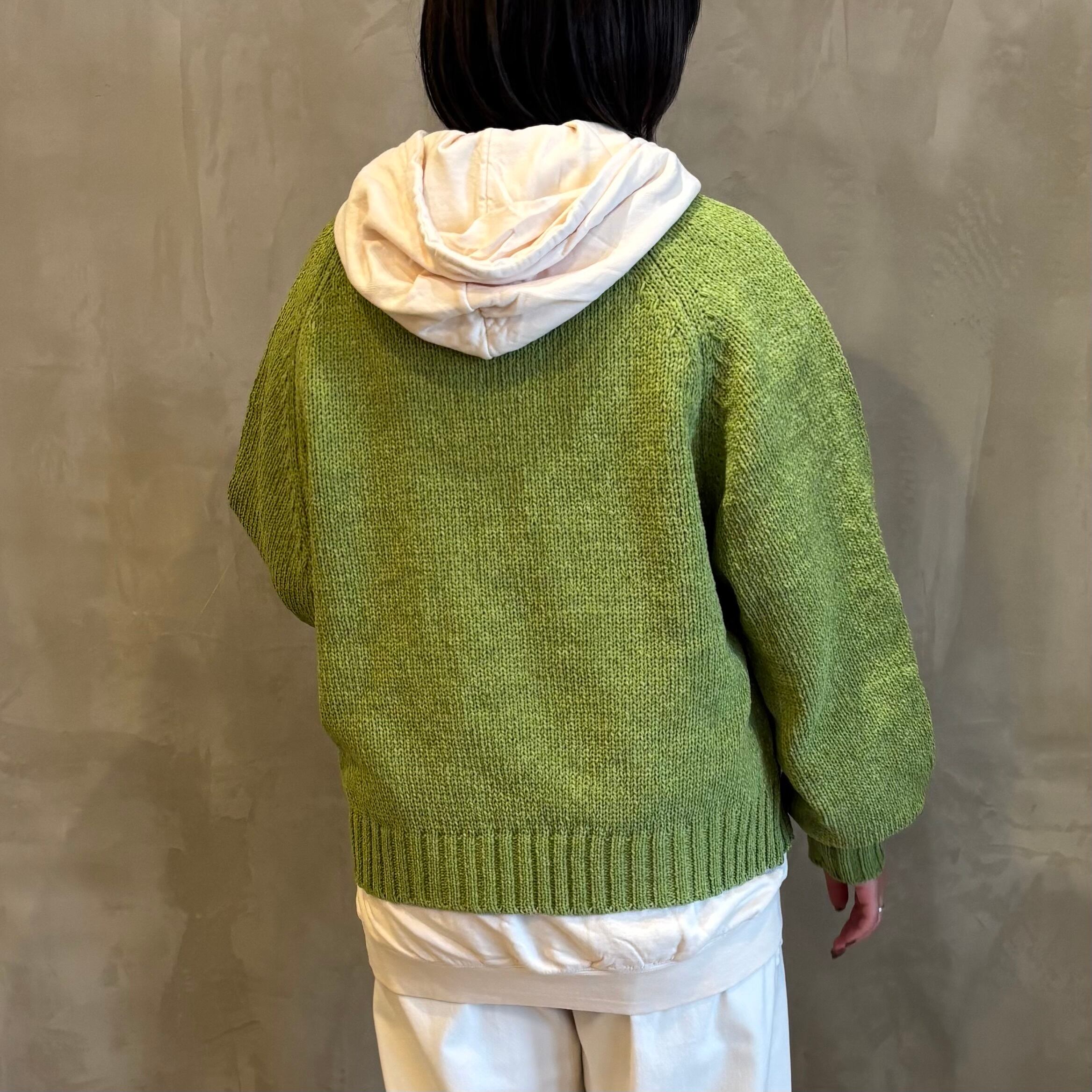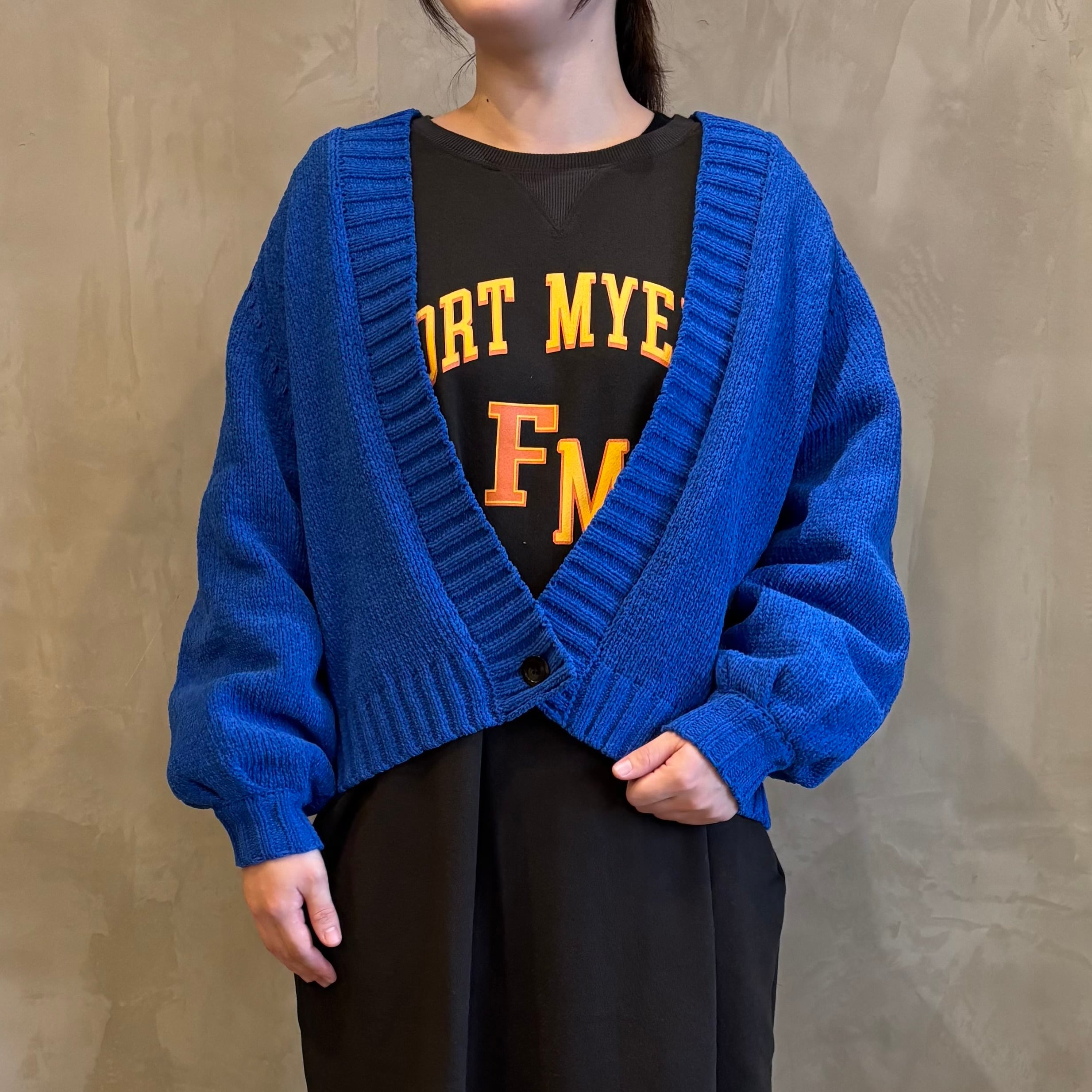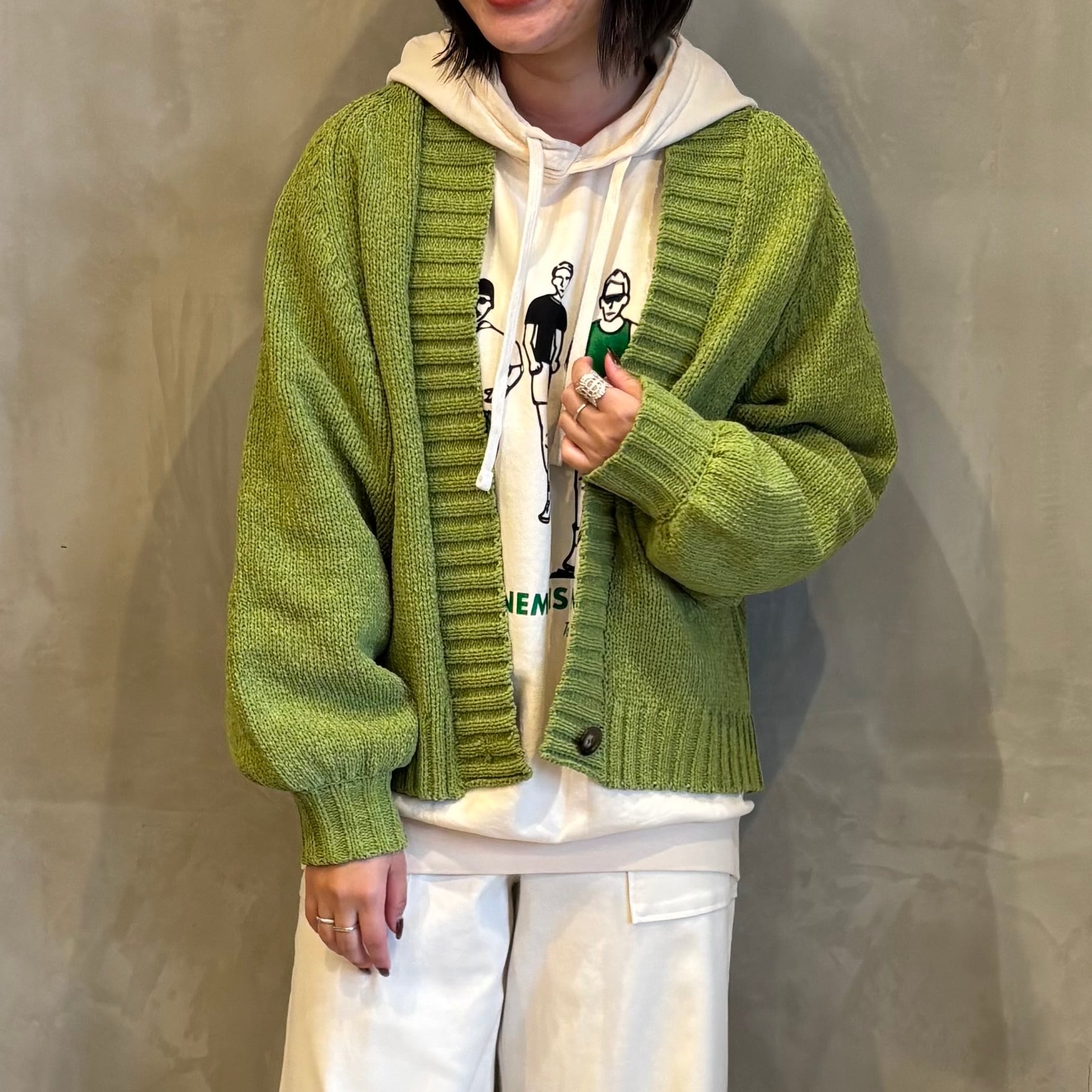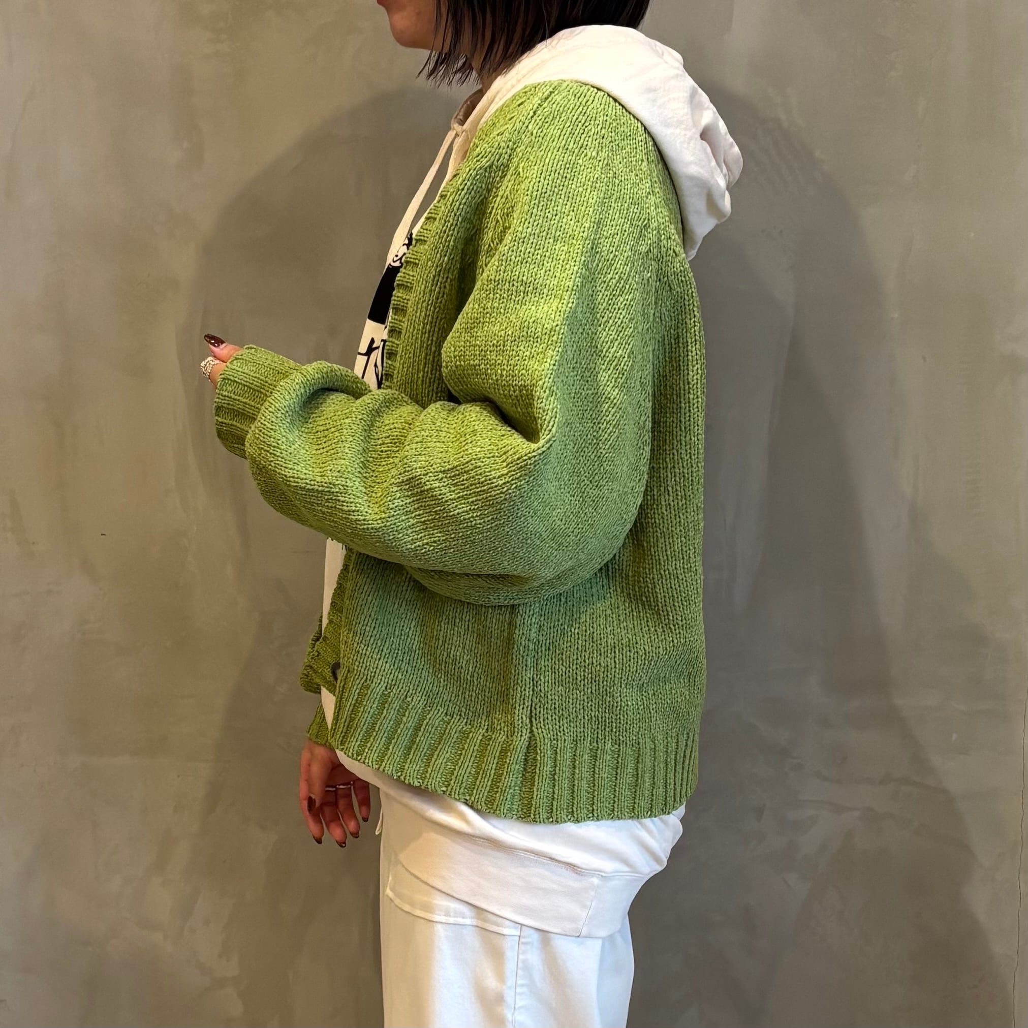 やわらかな肌触りが最高に心地良い短い毛足のモールヤーンを使用し、ざっくりと編み上げたローゲージカーディガン。