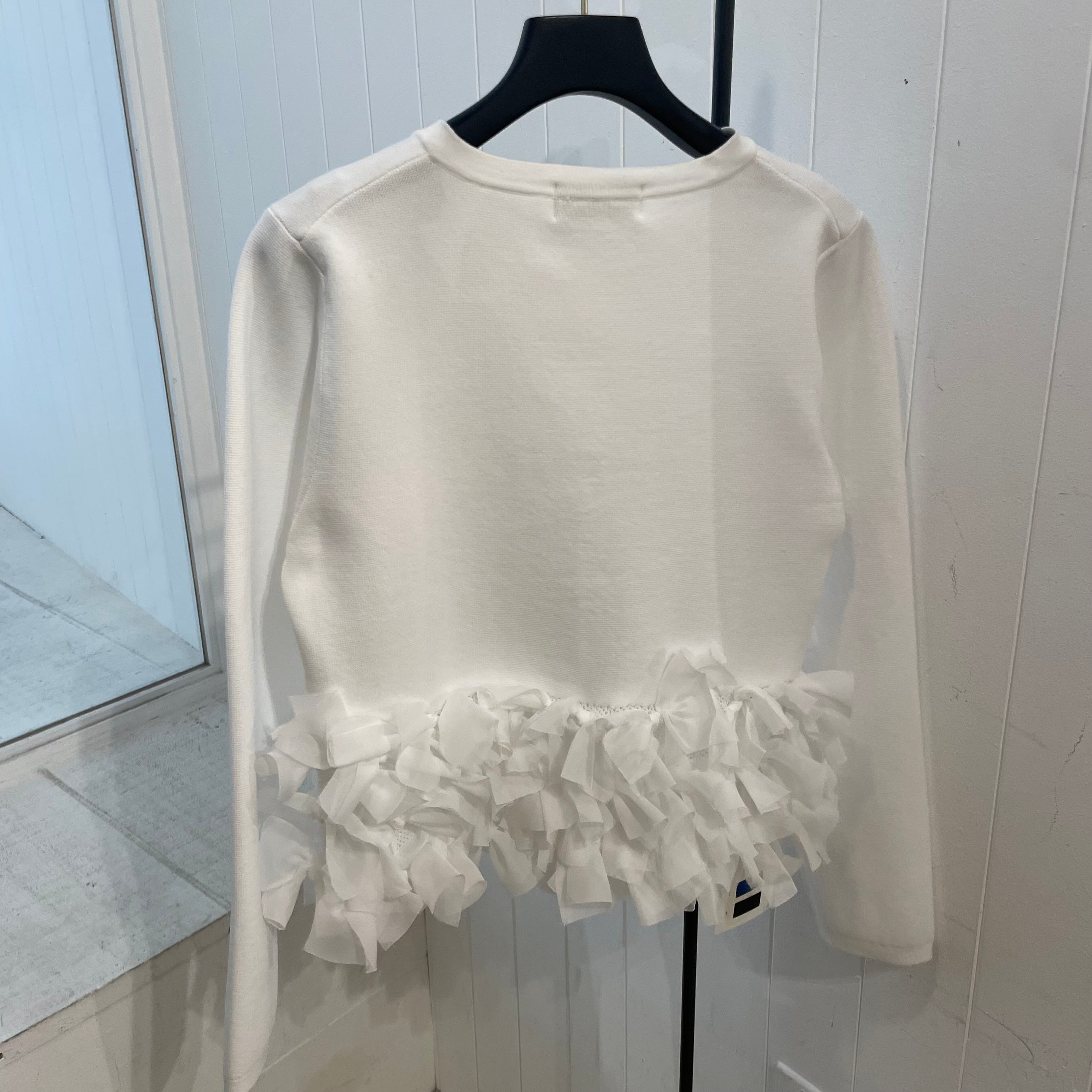 裾にランダムにあしらわれたシフォンリボンが、動くたびに軽やかに揺れる“リボンフリンジカーディガン”。