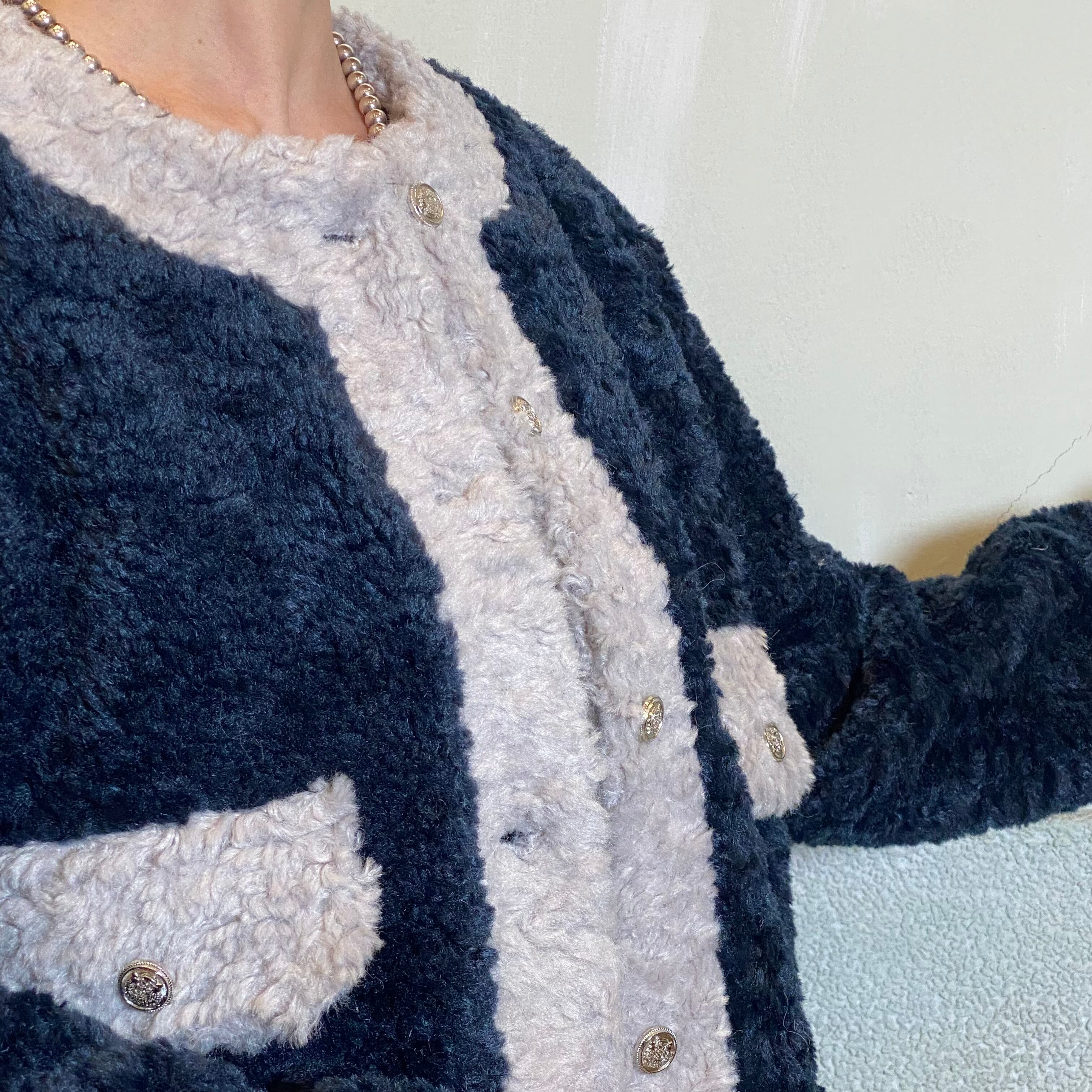 ふんわりとしたボア素材を、ツイード風に見えるバイカラー配色で仕上げた大人可愛いジャケット。