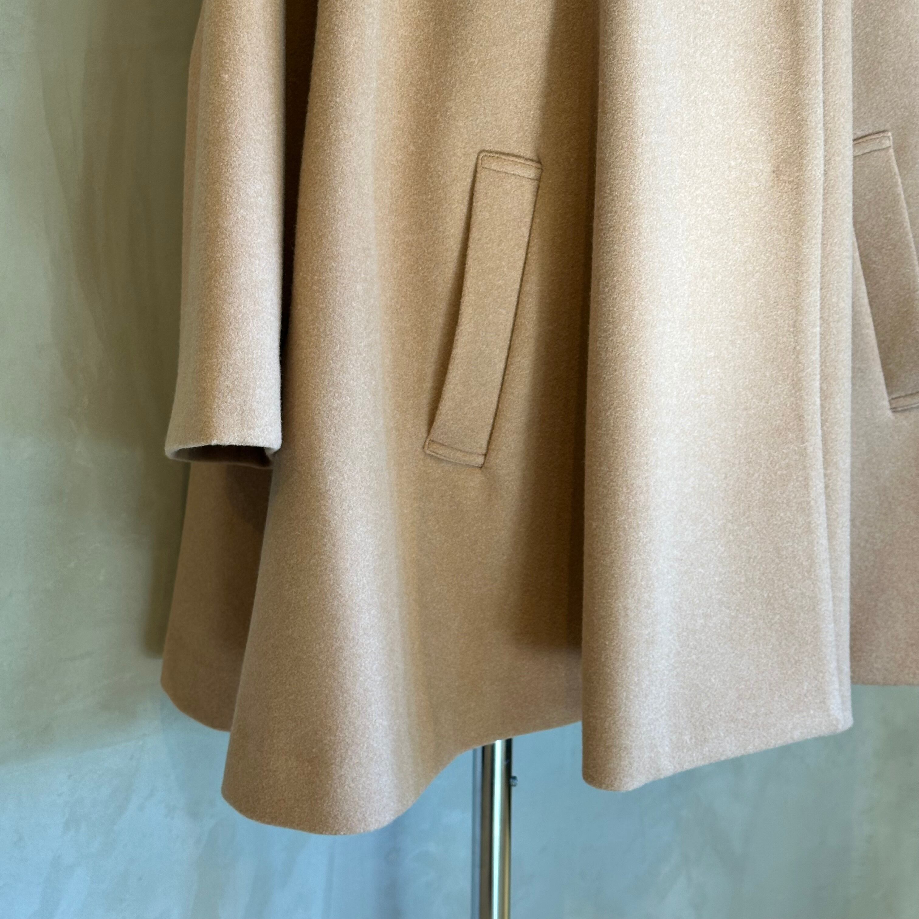 裾に向かって広がるテントシルエットで、合わせの深いフロントは大きめのスナップで開閉する作りになっています。